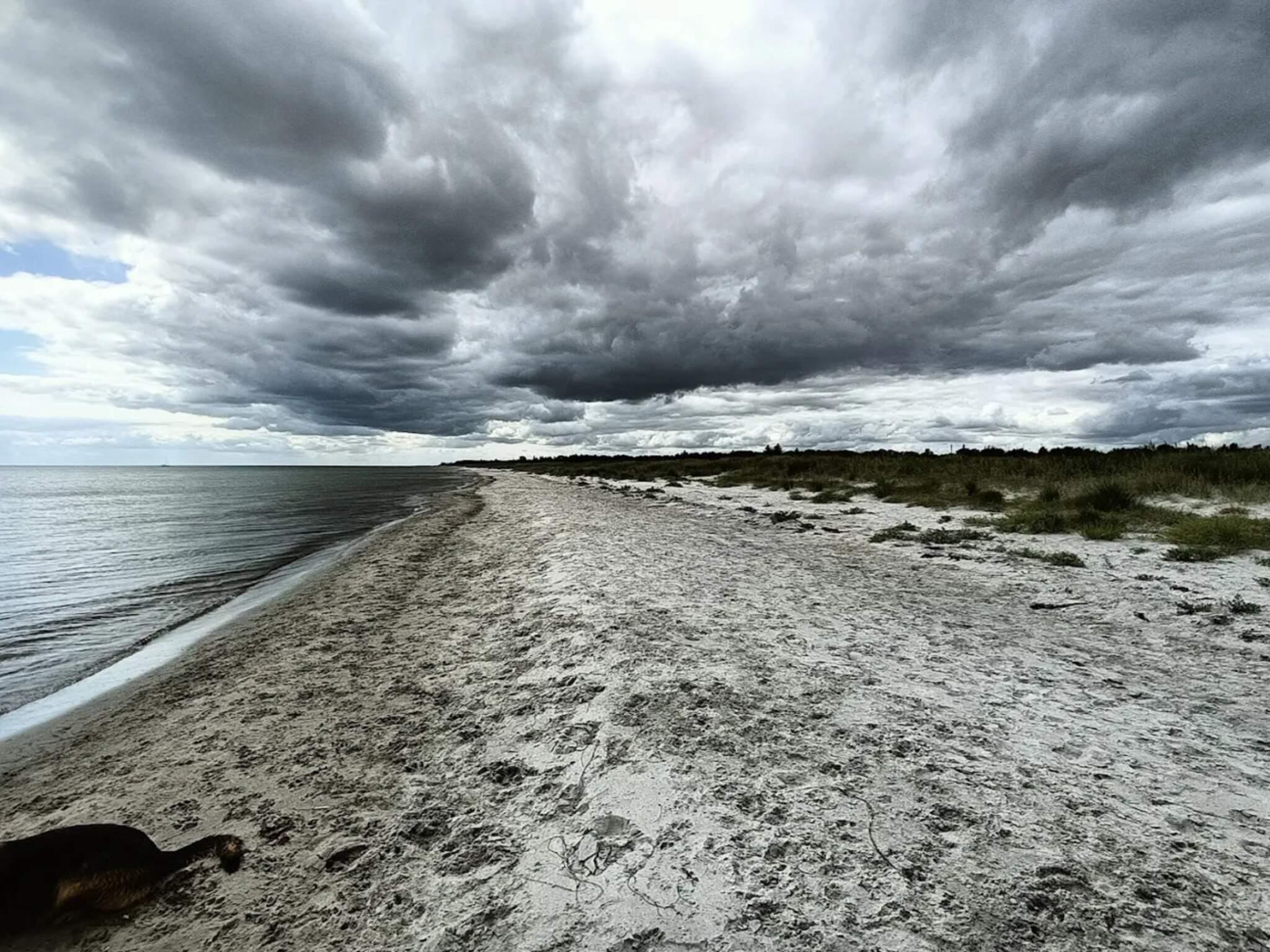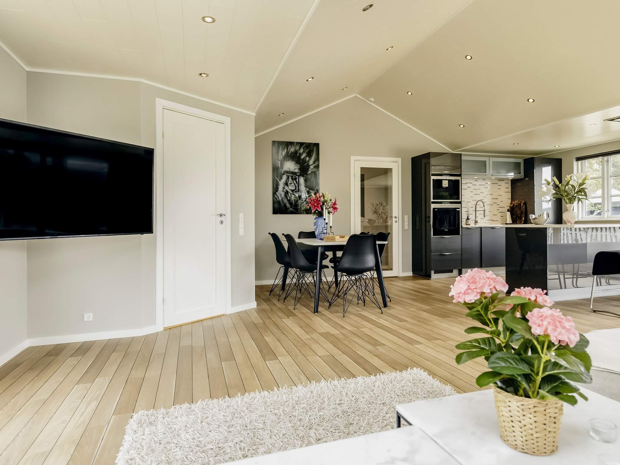 Sommerhuset indeholder sort dejligt køkken/alrum, hvor man kan samles ved den store køkkenø.