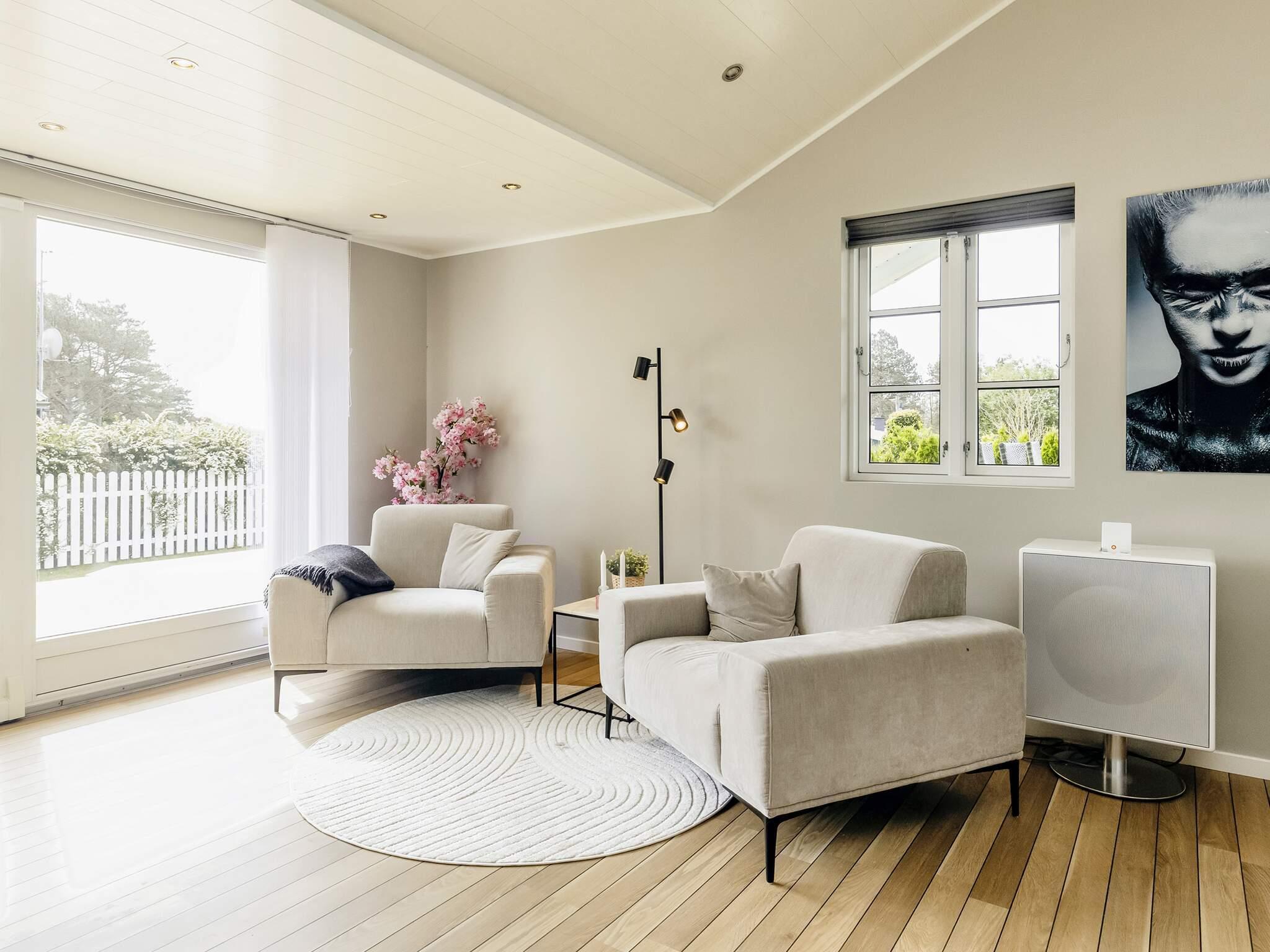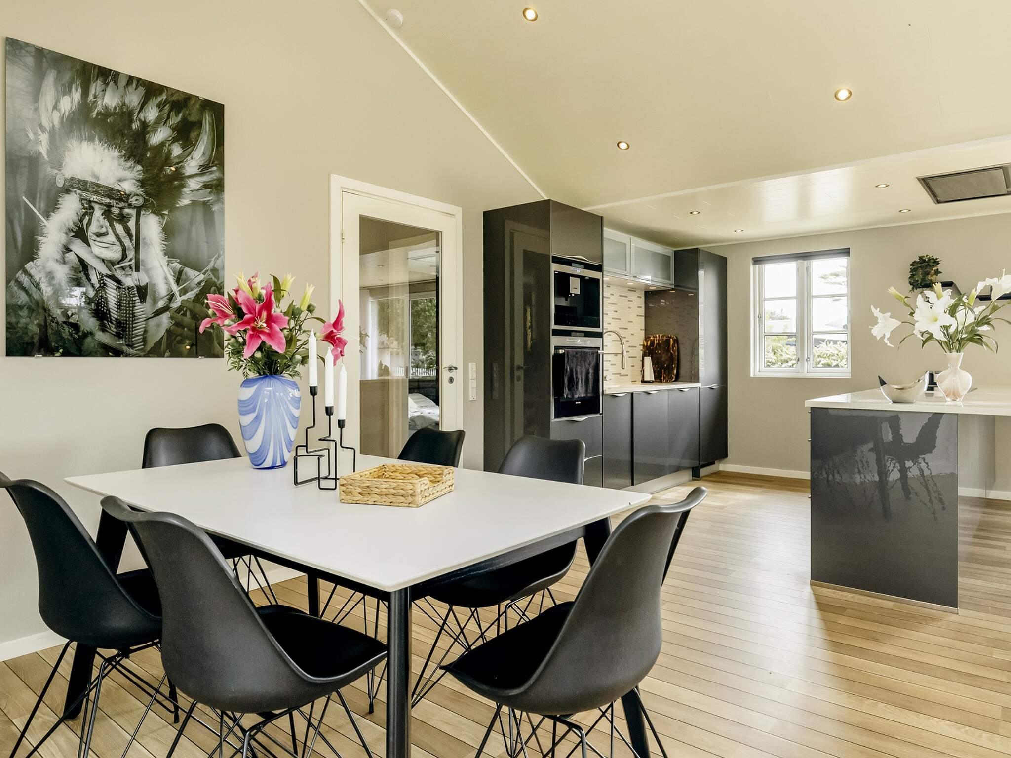 Fra spisestuen er der ligeledes udgang til stor terrasse med havemøbler samt liggestole.