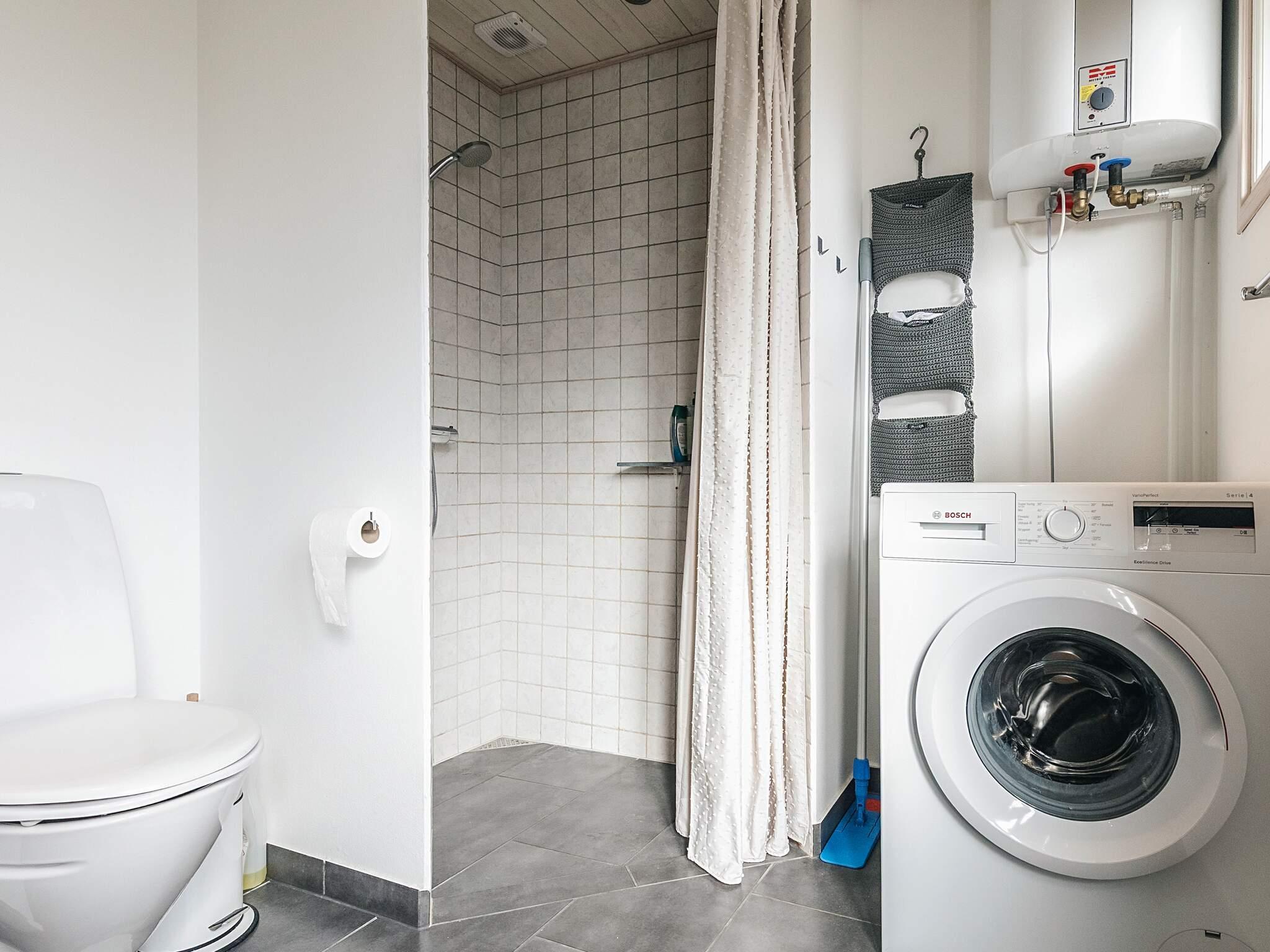 Badeværelset er også blevet opdateret og byder på moderne bekvemmeligheder for et behageligt ophold og mulighed for at vaske tøj i vaskemaskinen.