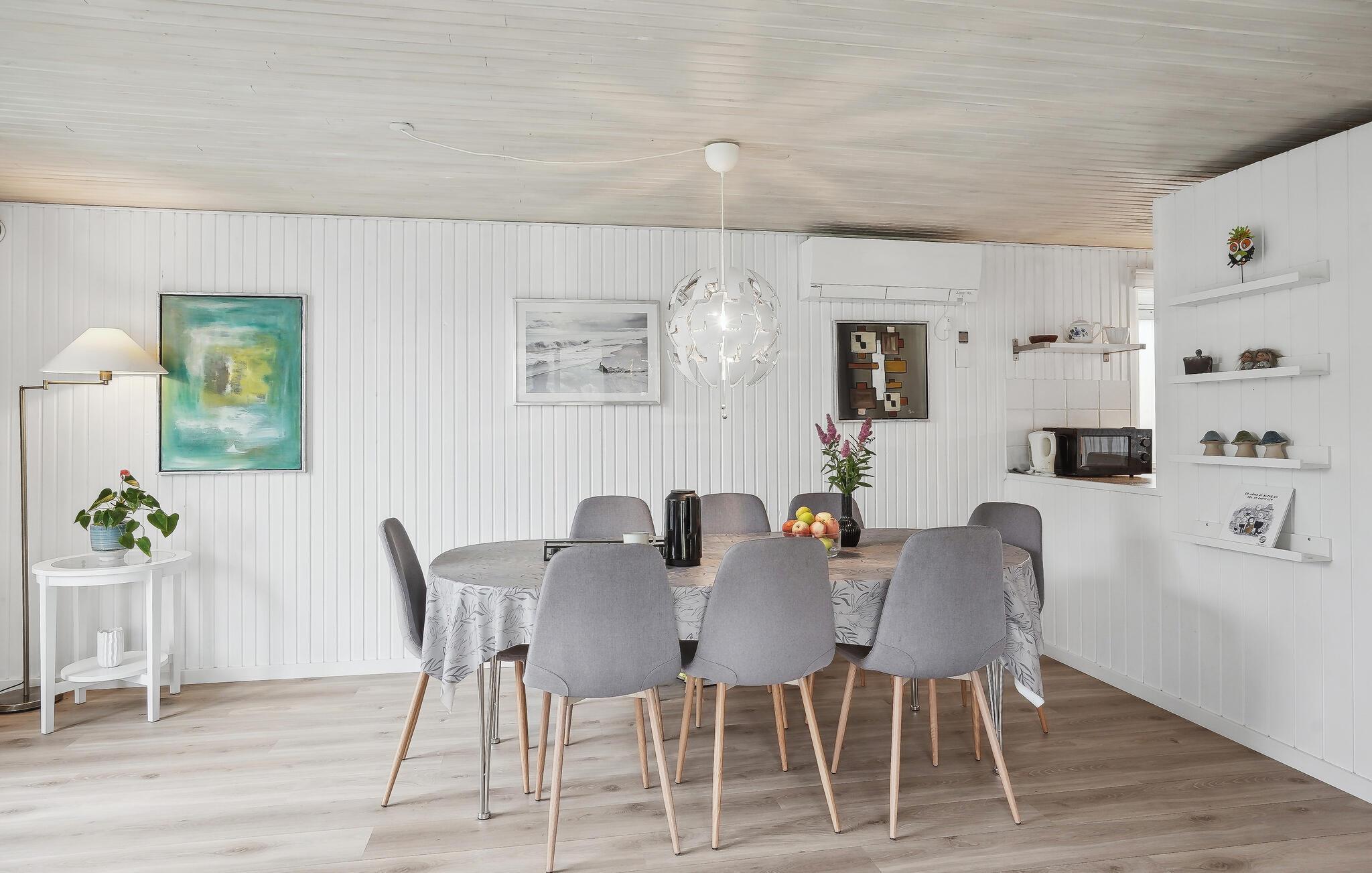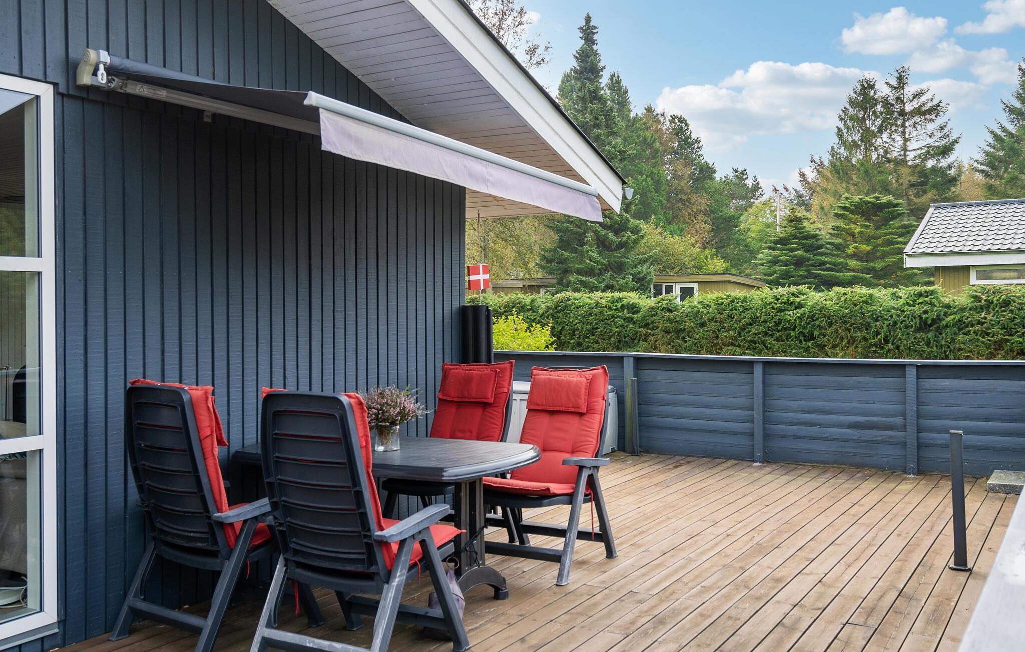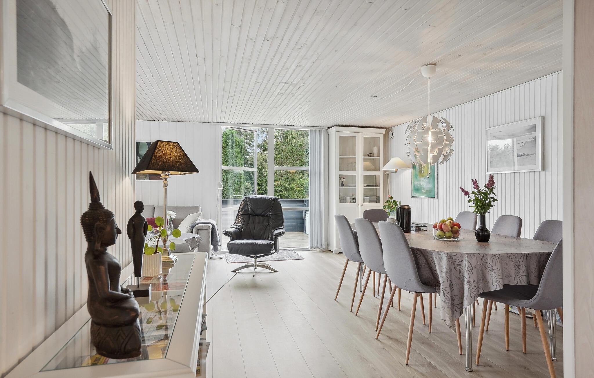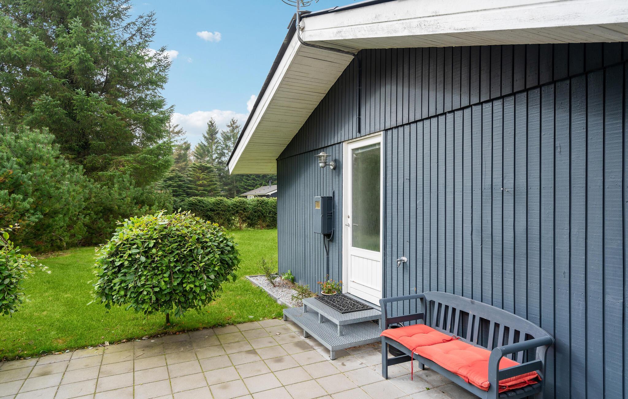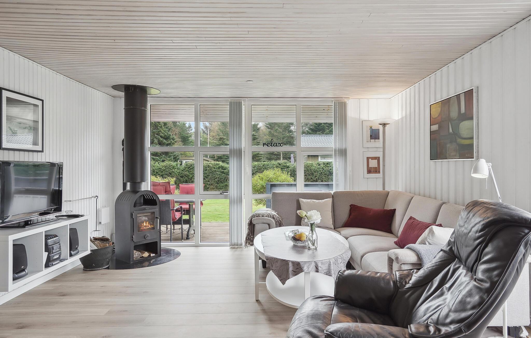 Velkommen til dette hyggelige og komfortable feriehus, hvorfra I kan gå til stranden. Indenfor bliver I mødt af en stilfuld atmosfære, hvor I kan slappe af sammen med dem, I holder af. De lyse værelser får deres charme fra de smagfulde og hjemlige møbler. Nyd hyggelige filmaftener i den indbydende sofa og skab en særlig behagelig atmosfære med ild i brændeovnen. Sæt jer ud på terrassen og slik sol med udsigt over de skønne træer. Her kan I afslutte en dejlig dag med et lækkert måltid fra grillen.