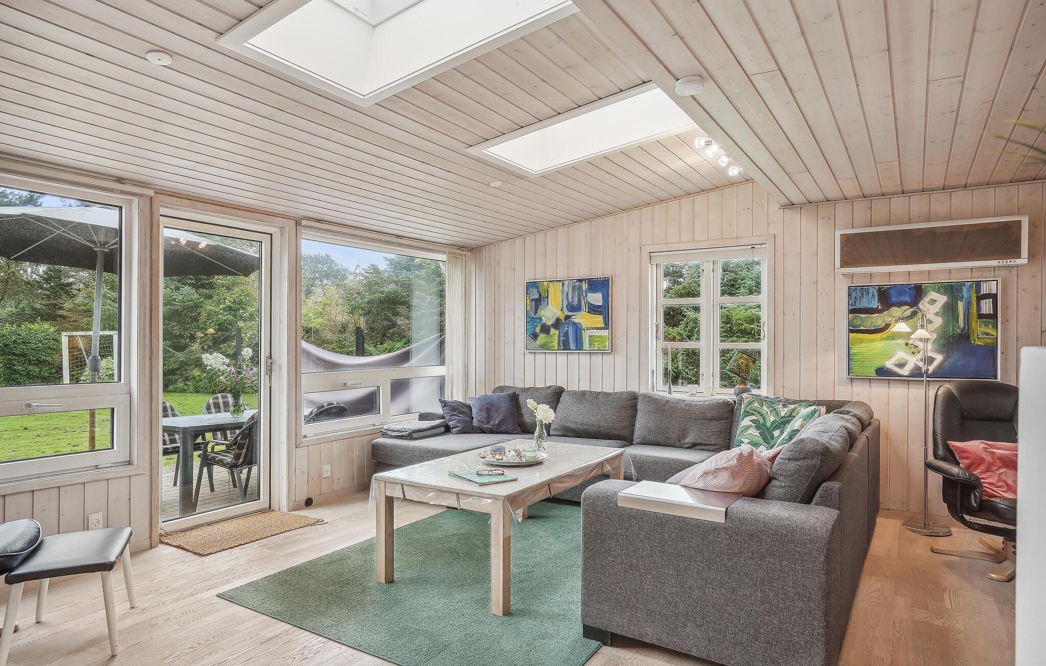 Dette fine sommerhus ligger ugenert på en stor naturgrund, omgivet af træer. Her kan I nyde en skøn ferie med fuldstændigt privatliv. Selve huset er hyggeligt, smagfuldt indrettet og byder bl.a. på en rummelig stue med brændeovn, fladskærm og vinduer i loftet, som giver et dejligt lysindfald. Men det er udeområdet, der virkelig imponerer.