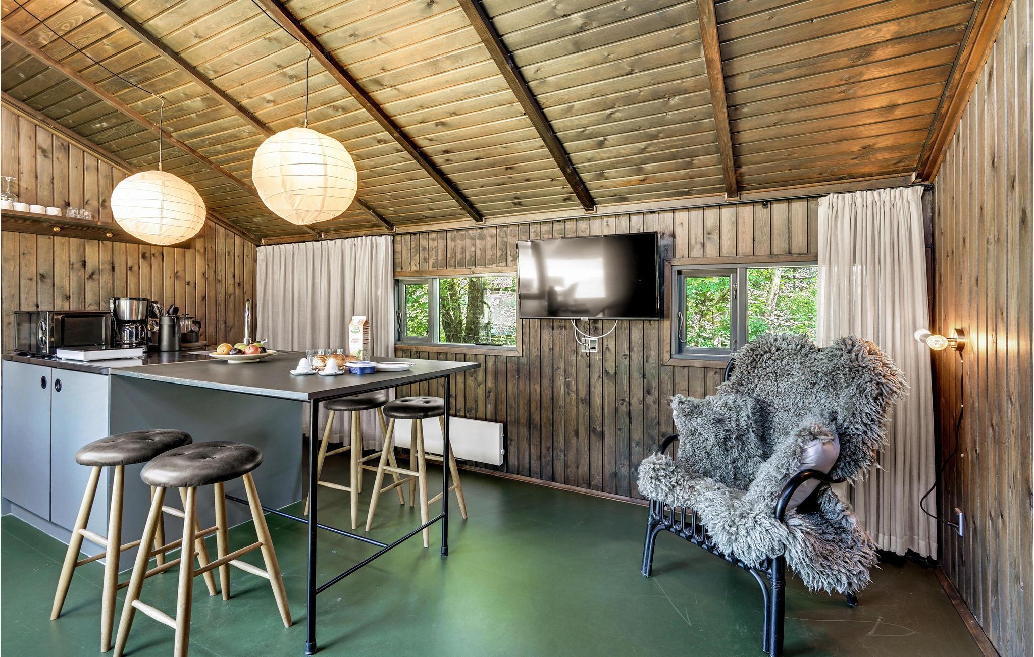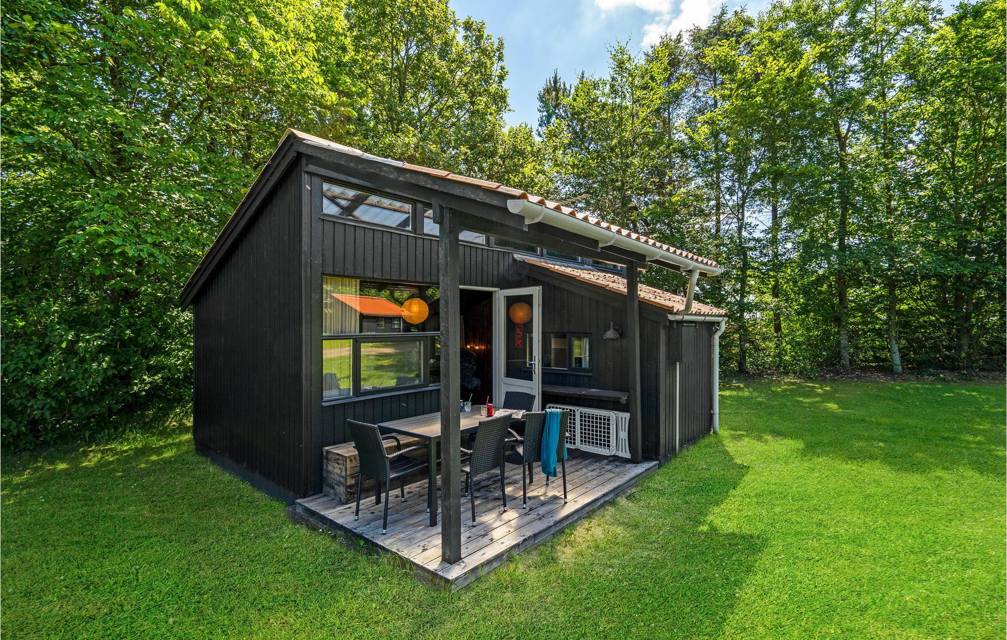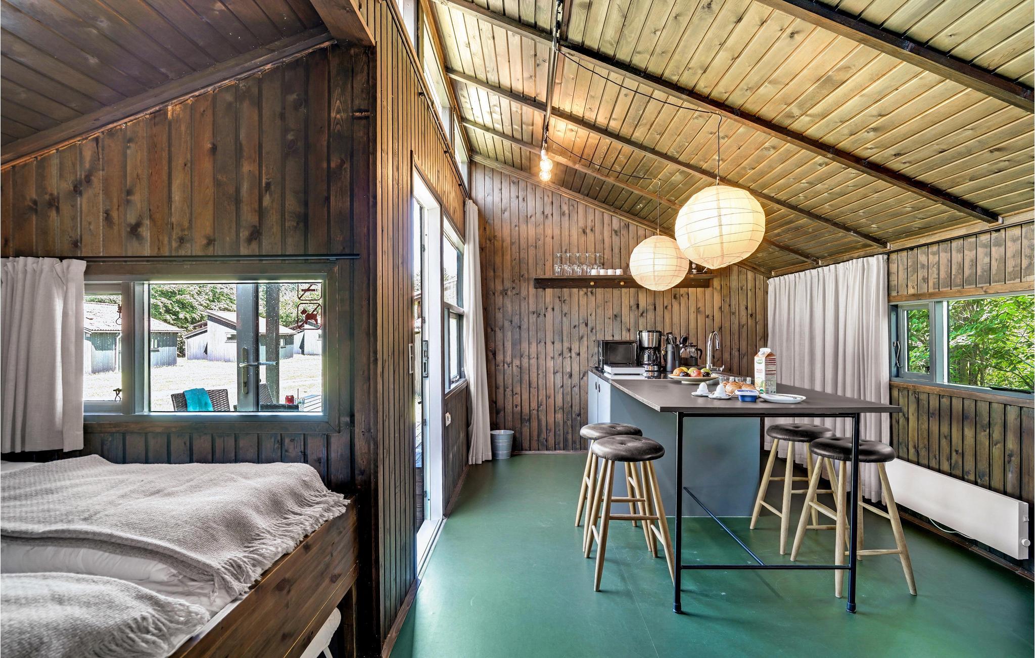 Tag familien med til dette enestående sommerhus, som er indrettet i flotte, gedigne materialer og hold en skøn ferie i naturskønne rammer. Huset ligger omgivet af skov og er tæt på en smuk badesø. Her kan I slappe af og nyde freden og roen med en lille familie eller vennegruppe. Huset består af et køkken med alle de nødvendige faciliteter samt sovepladser. På campingpladsen er der en lang række andre tilbud, som I kan få glæde af.