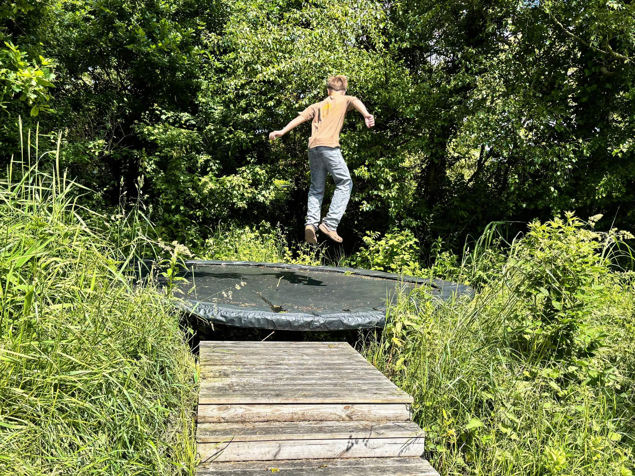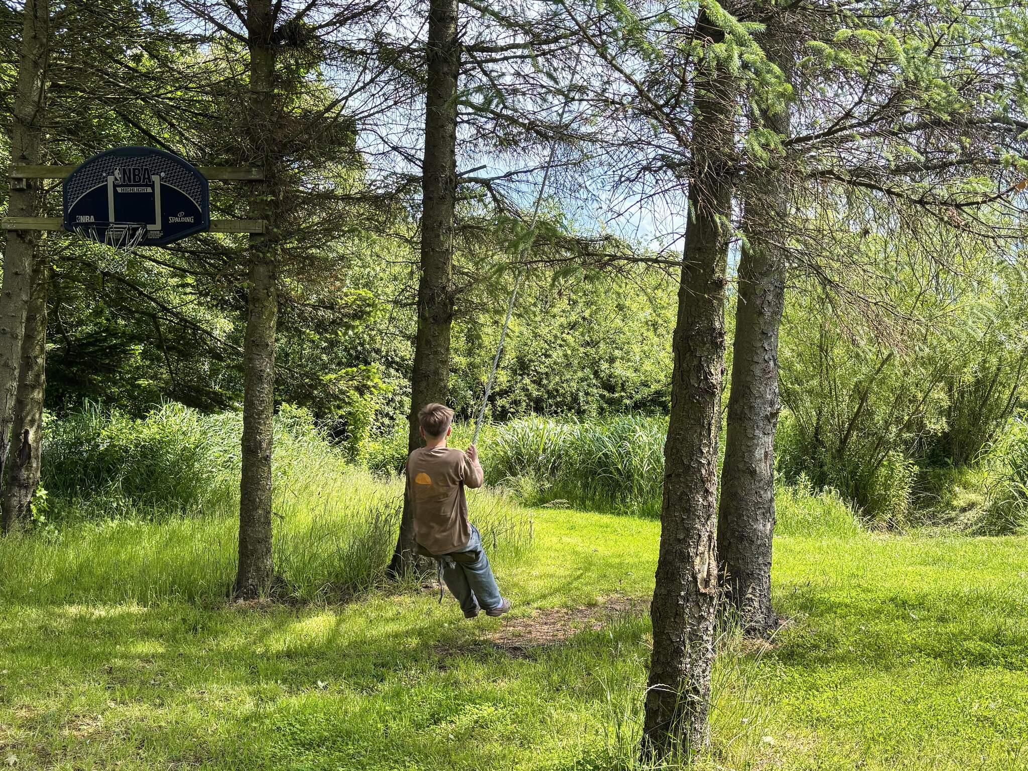 Huset ligger på en 1.980 m2 naturgrund, som er oplagt til udendørs aktiviteter med trampolin (brug på eget ansvar), leg, bålplads, og badning både sommer og vinter. Grunden har også en lille sø, og åen løber forbi. Der er bygget en træterrasse rundt om store dele af huset. Terrassen, der har udekøkken og udendørs bruser, bliver hurtigt et naturligt samlingssted. Terrassen ligger godt i læ for den til tider friske vind fra Limfjorden.