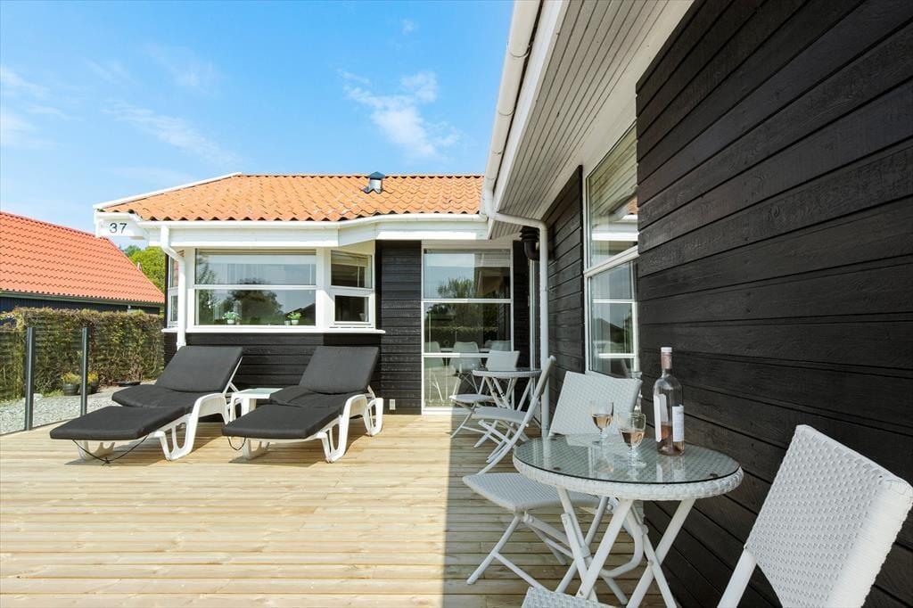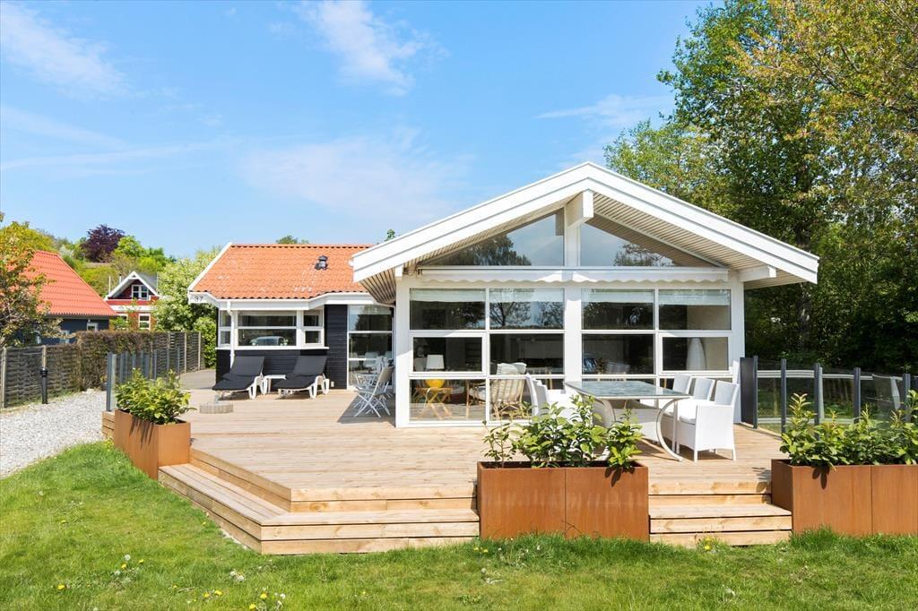 Huset ligger på en smuk grund med en stor græsplæne og fine terrassearealer, hvor du kan nyde både solen og den betagende udsigt til vandet lige på den anden side af vejen. Uanset om solen skinner eller regnen falder, er der mulighed for at grille og nyde måltiderne udendørs – under halvtaget på bagsiden af huset kan man finde læ. Her er masser af plads til leg og afslapning i den friske luft.