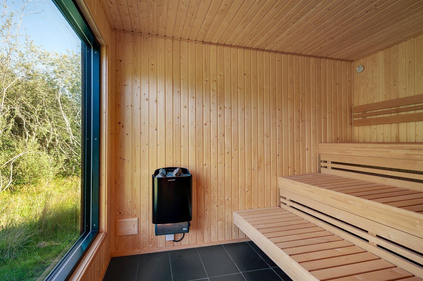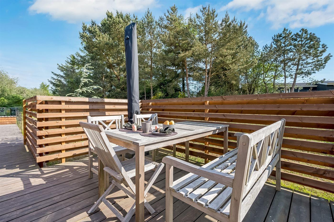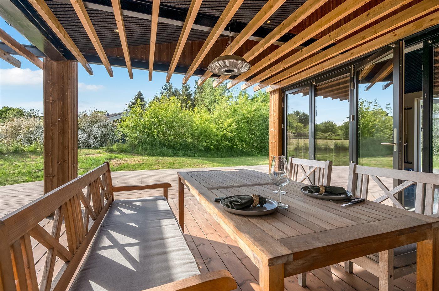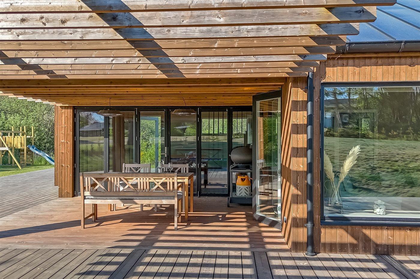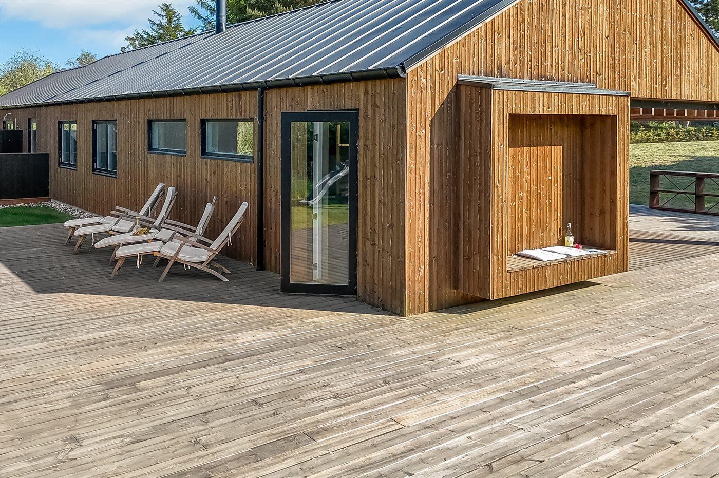 Udenfor god og stor terrasse samt udesauna og vildmarksbad. Udebruseren er til rådighed fra uge 17 til og med uge 44. Feriehuset ligger på en dejlig, stor grund i fredelige omgivelser.