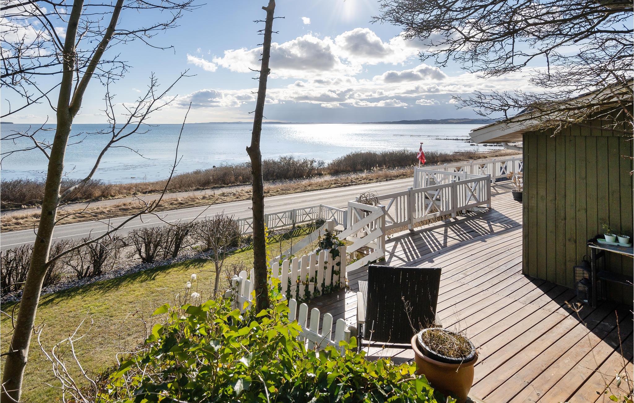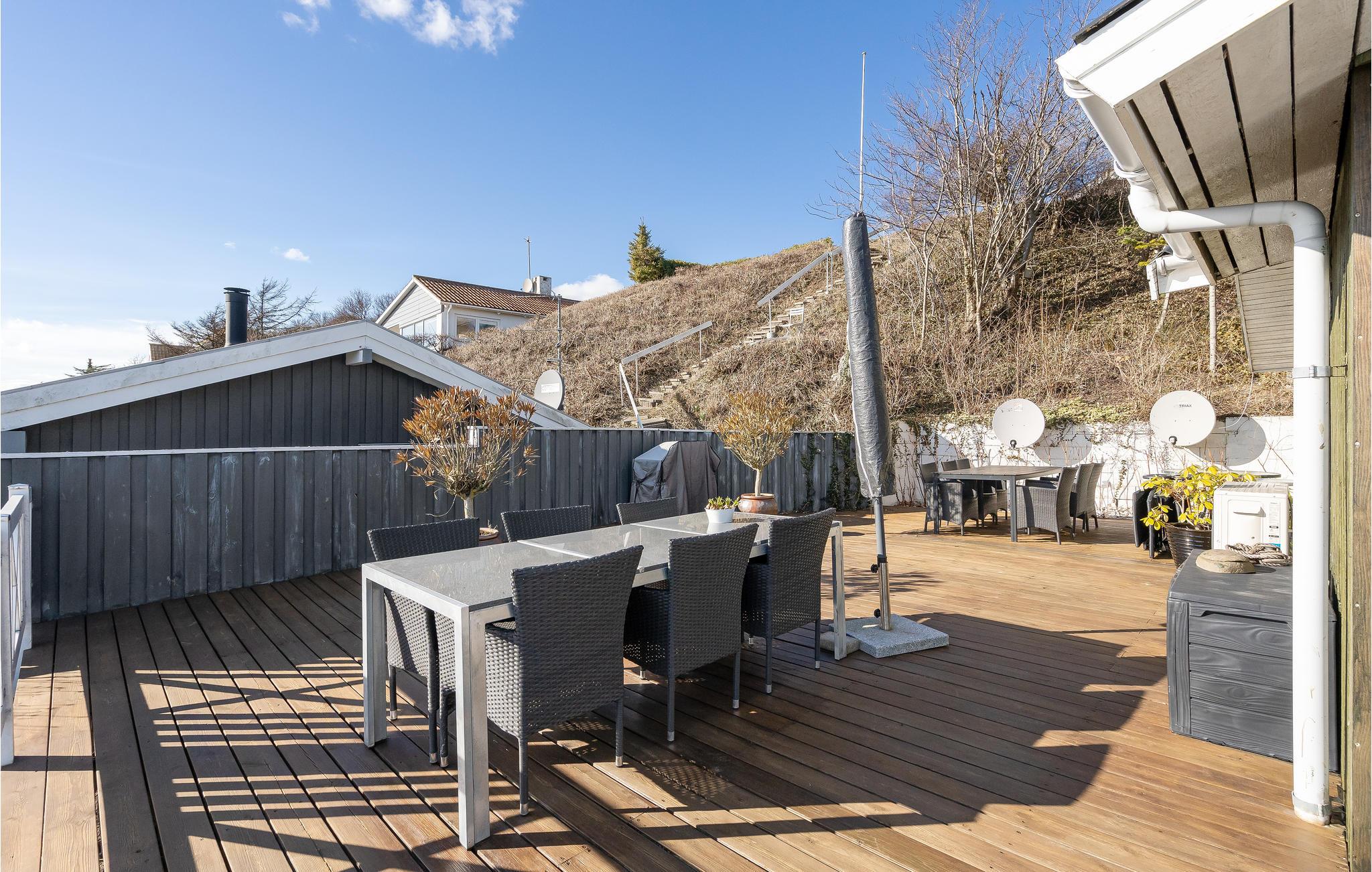 Et højdepunkt i huset er den åbne terrasse med havemøbler og havudsigt. Tilbring afslappende timer her med en god bog, eller afslut dagen med et glas vin efter en dag på stranden.