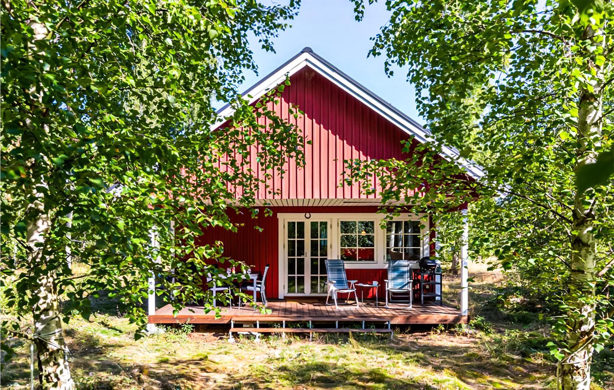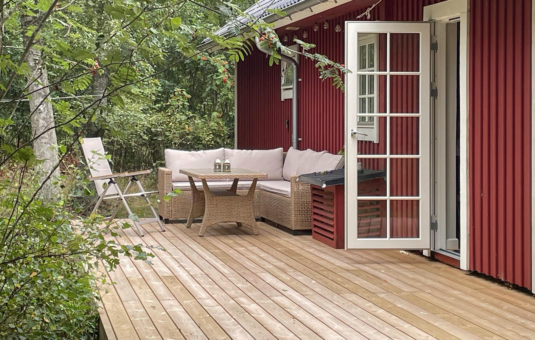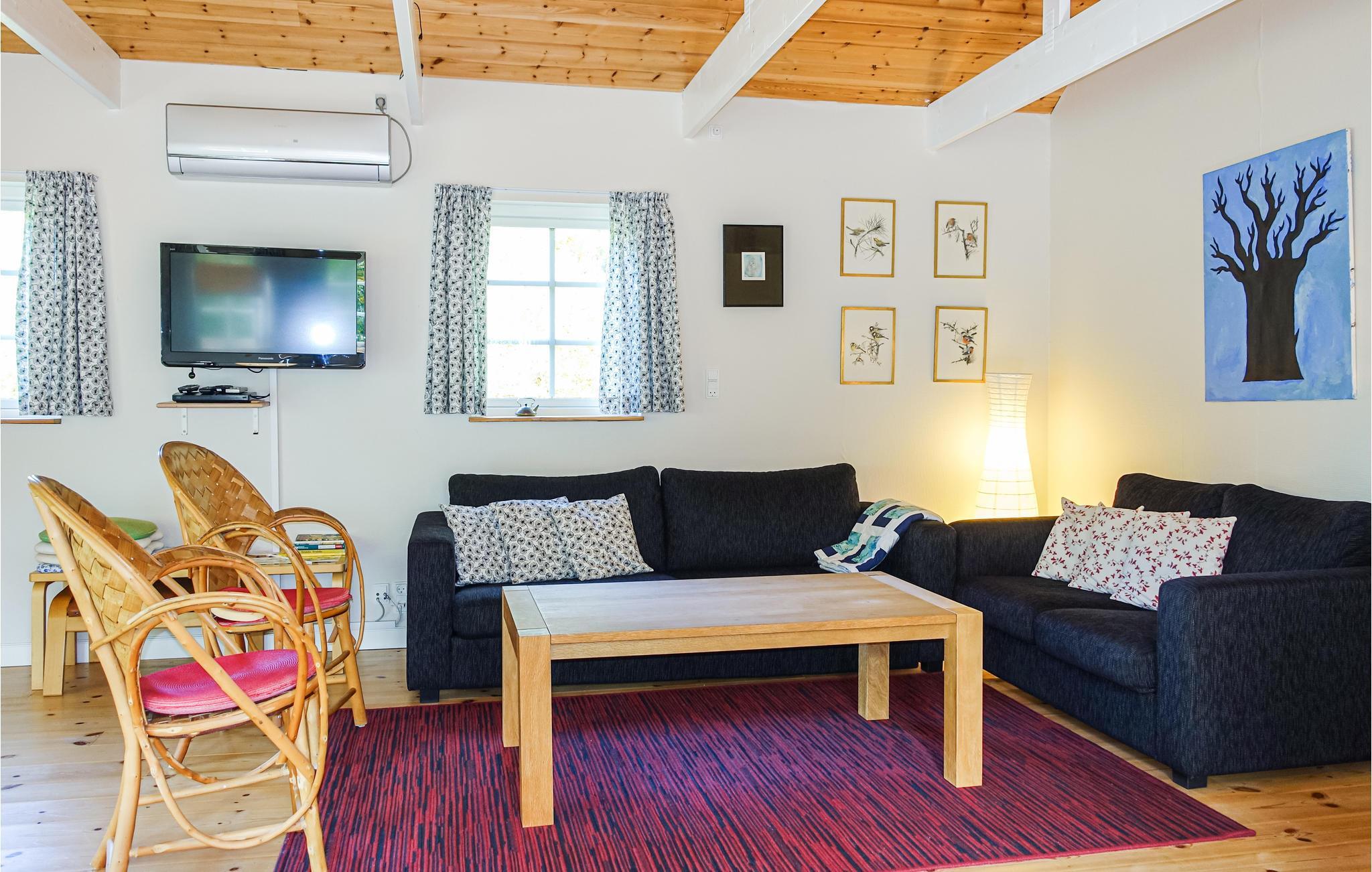 Hyggeligt træsommerhus nær børnevenlig strand med brændeovn, gratis WiFi og overdækket terrasse.
