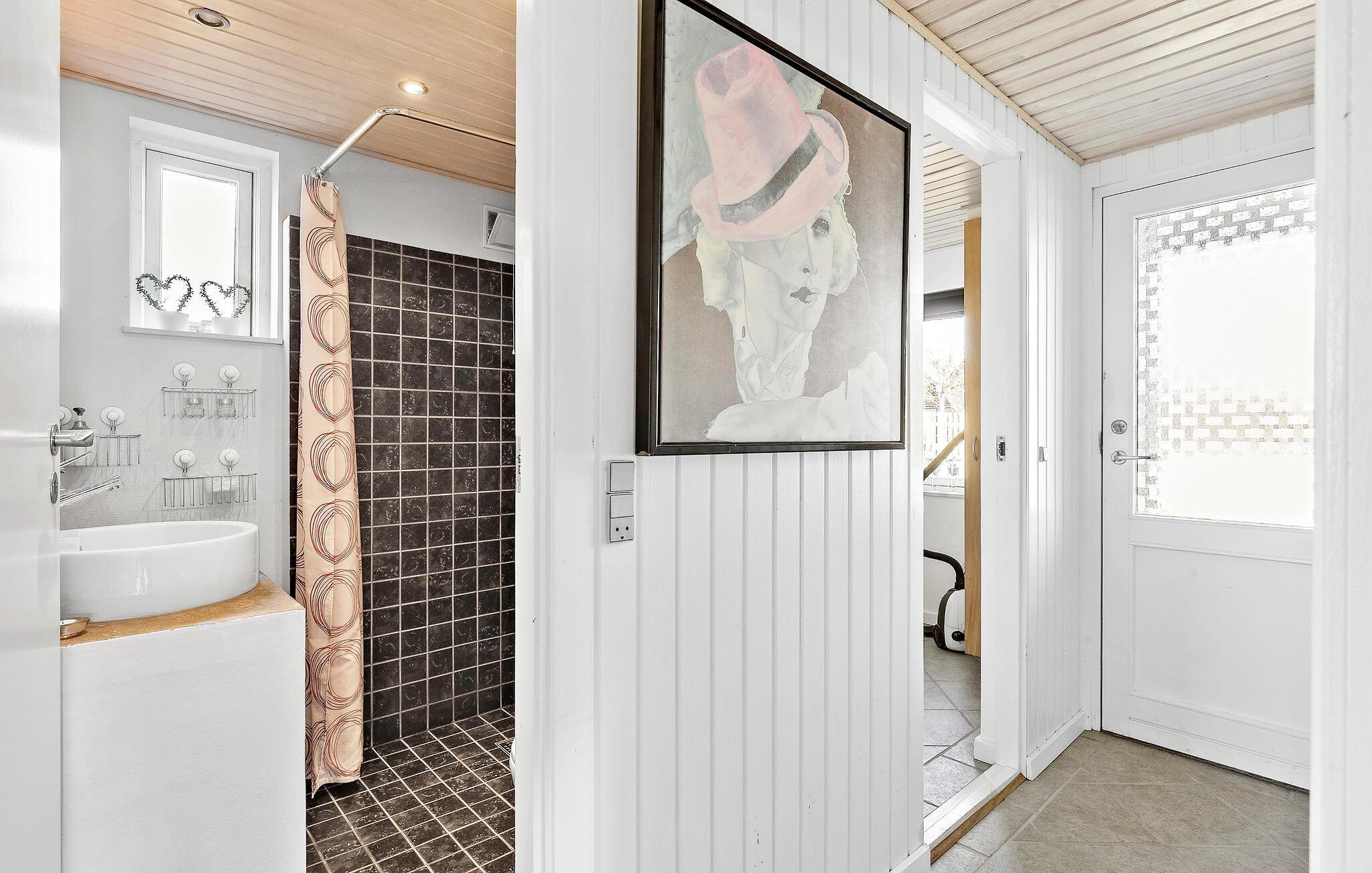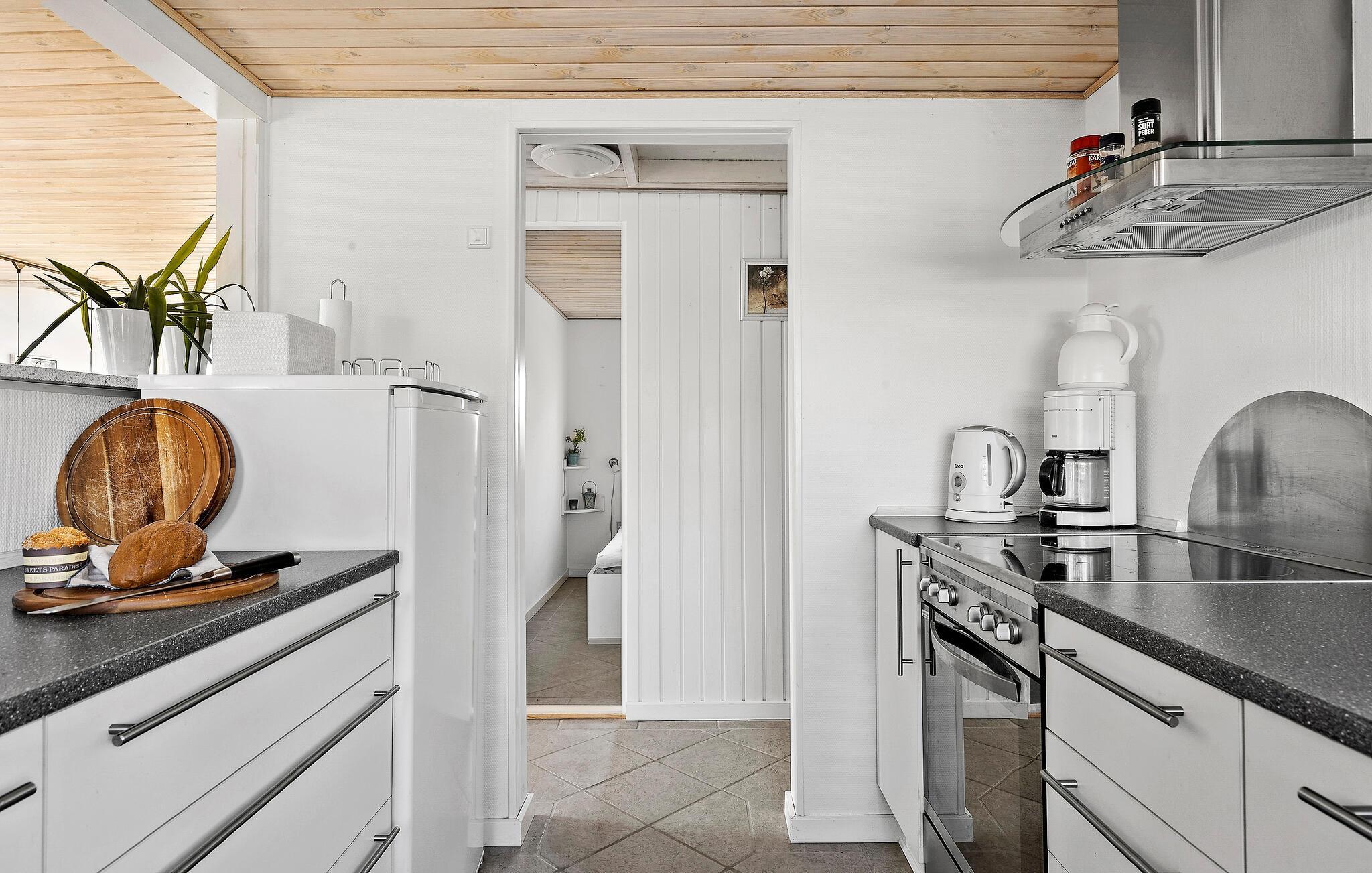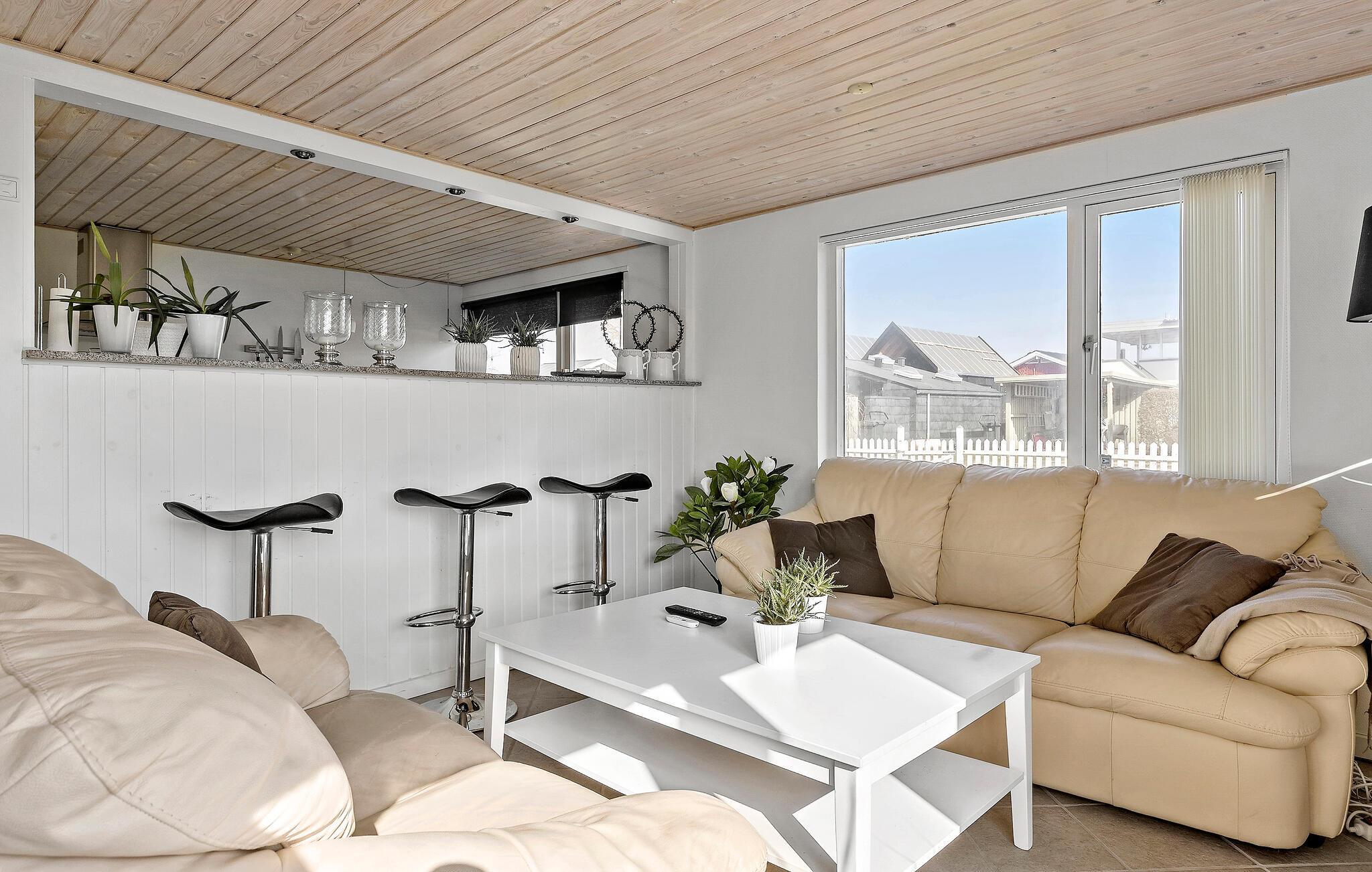 Dette sommerhus byder på en lys og indbydende atmosfære med moderne komfort. Slap af på de komfortable sofaer i opholdsområdet eller se en film sammen. Spisepladsen er placeret direkte ved vinduet og giver plads til hyggelige måltider. Lav mad i det elegante køkken med udsigt over haven. på kølige dage giver brændeovnen hyggelig varme og hyggelige timer.