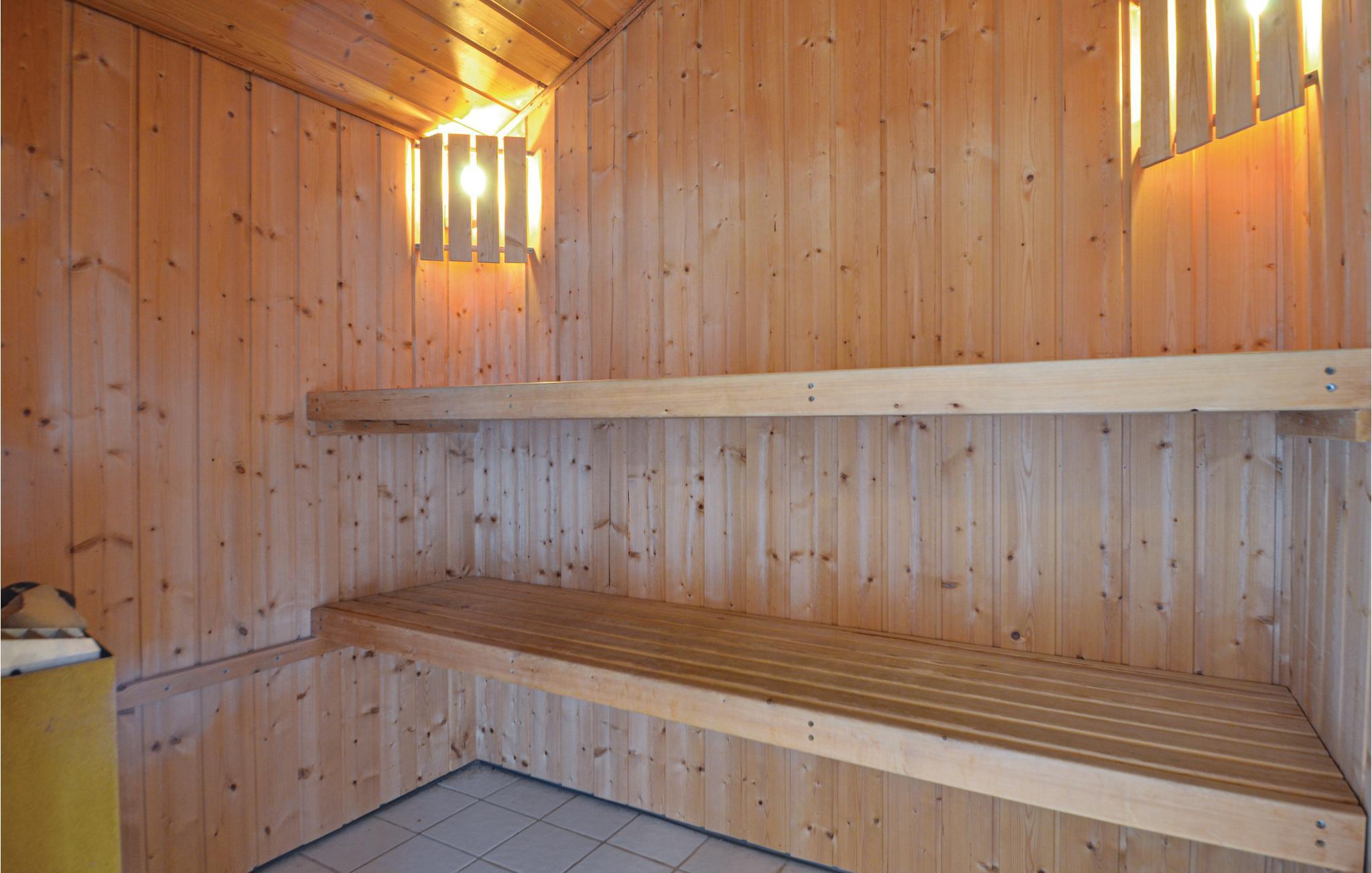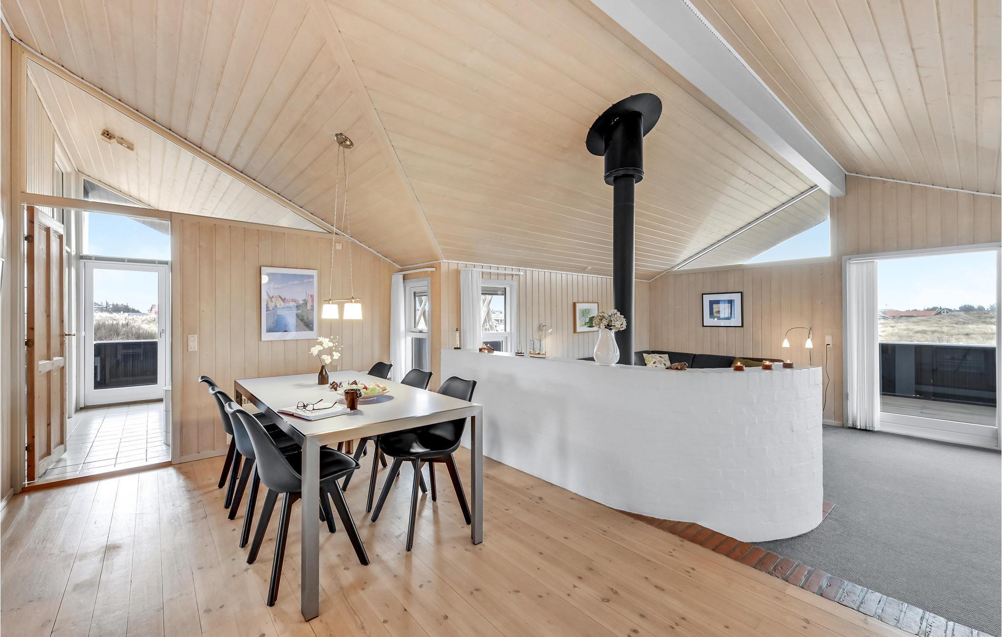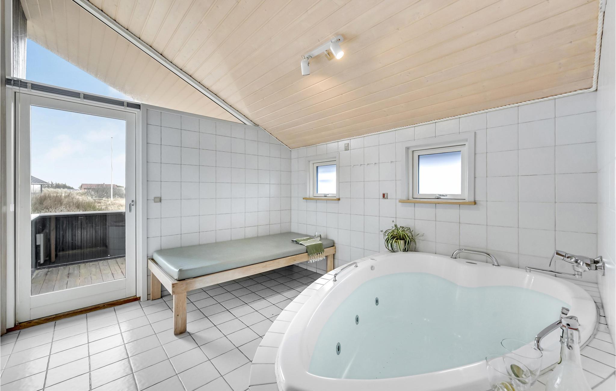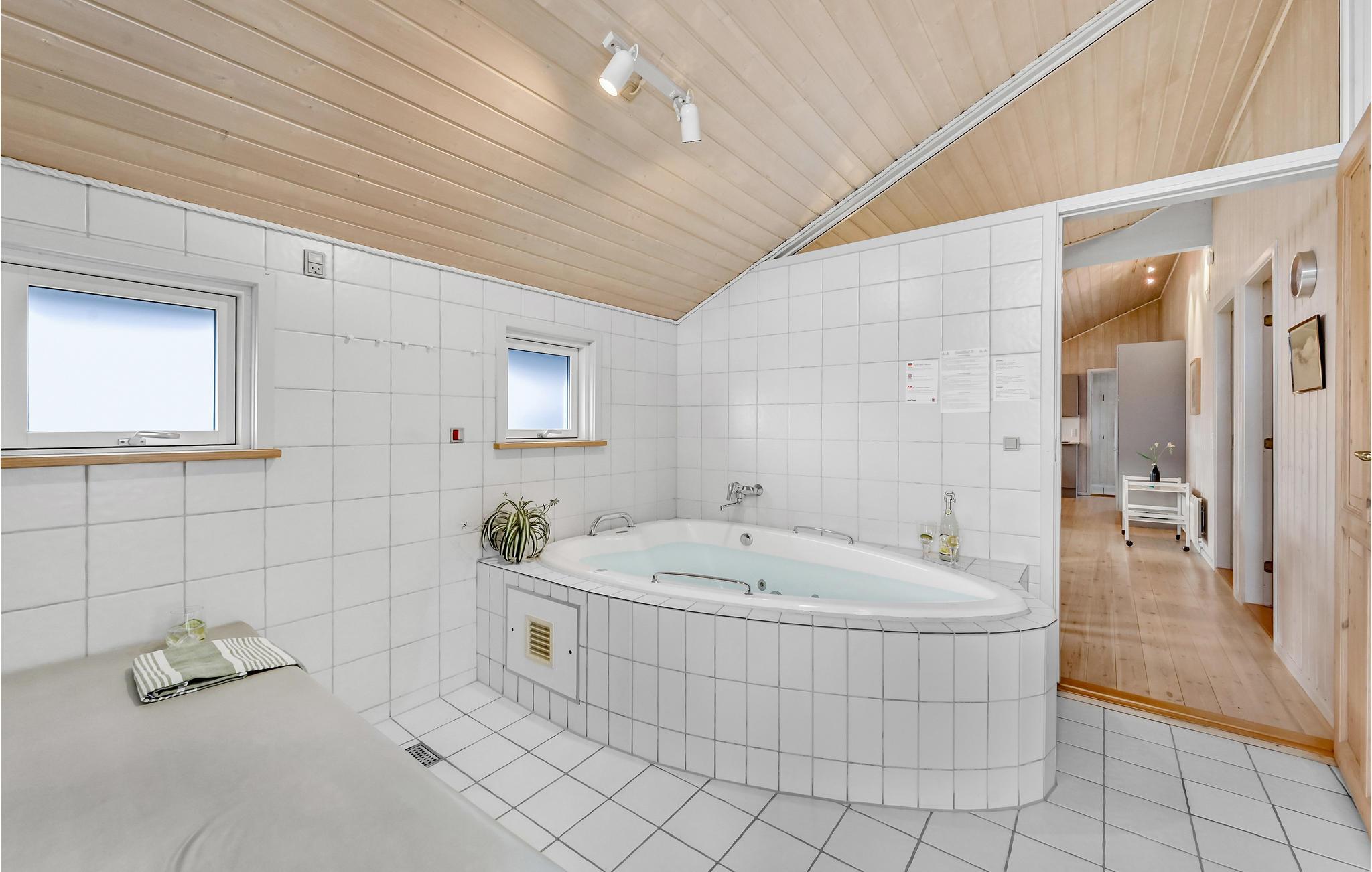 En meget charmerende, lys og let nedsænket opholdsstue med en dekorativ halvmur mod den åbne spisestue med skrå lofter, er med til at give dette feriehus en utraditionel indretning. I både det åbne og meget rummelige køkken samt stuen er der trægulve. Det meget store badeværelse er let opdelt og udstyret med et stort hjerteformet spabad og en sauna. Udendørs finder I den 70 m2 store lukkede terrasse, som er ideel, hvis I har børn eller mindre hunde med. Netop fordi den er lukket, er der også god læ her. Generelt er dette et meget velholdt og anderledes indrettet feriehus med fin plads til den store familie.