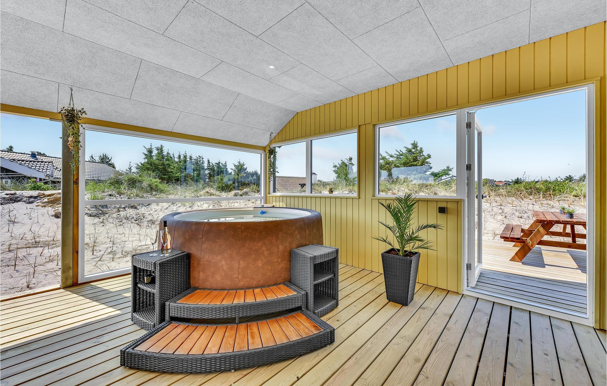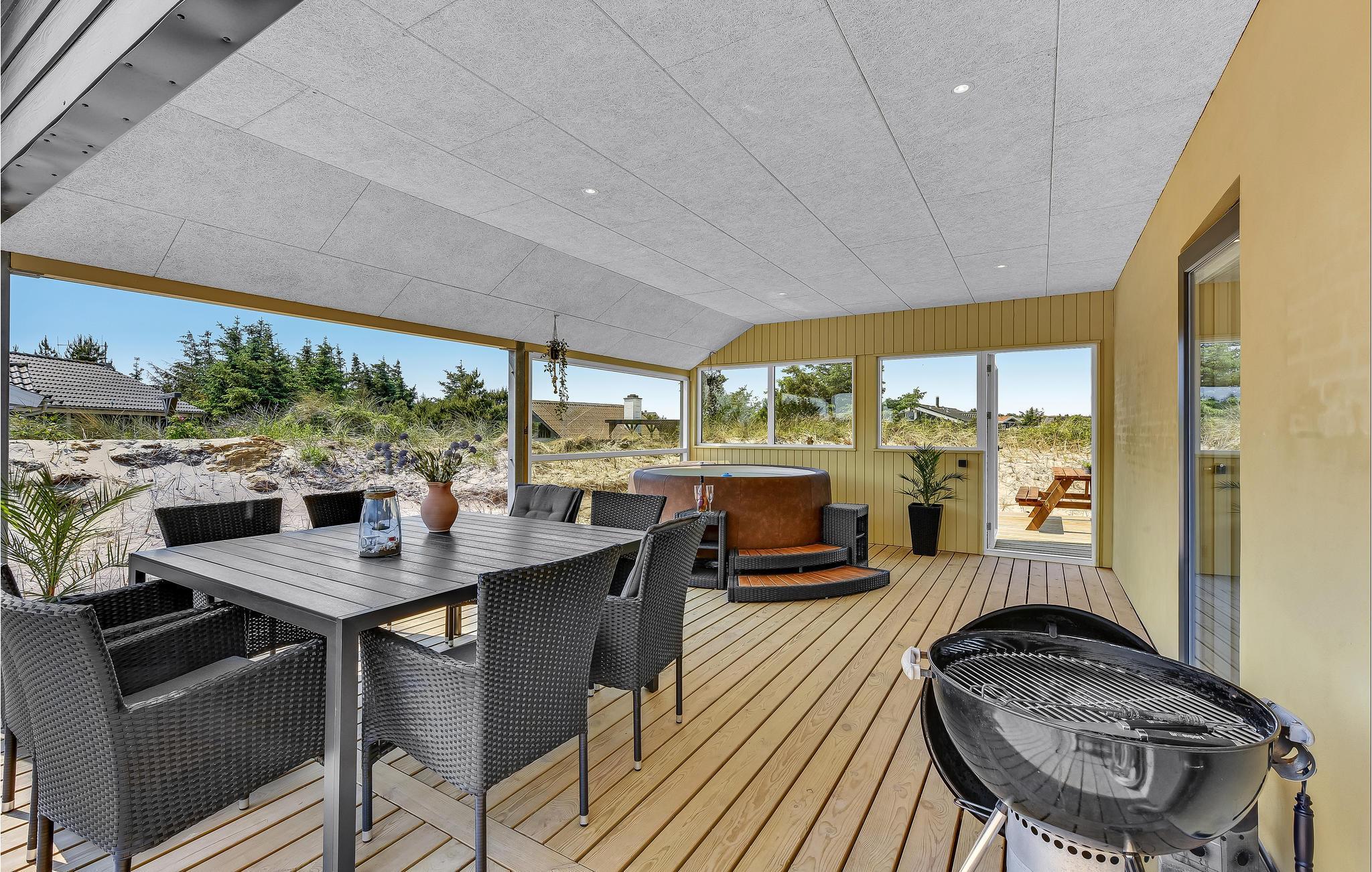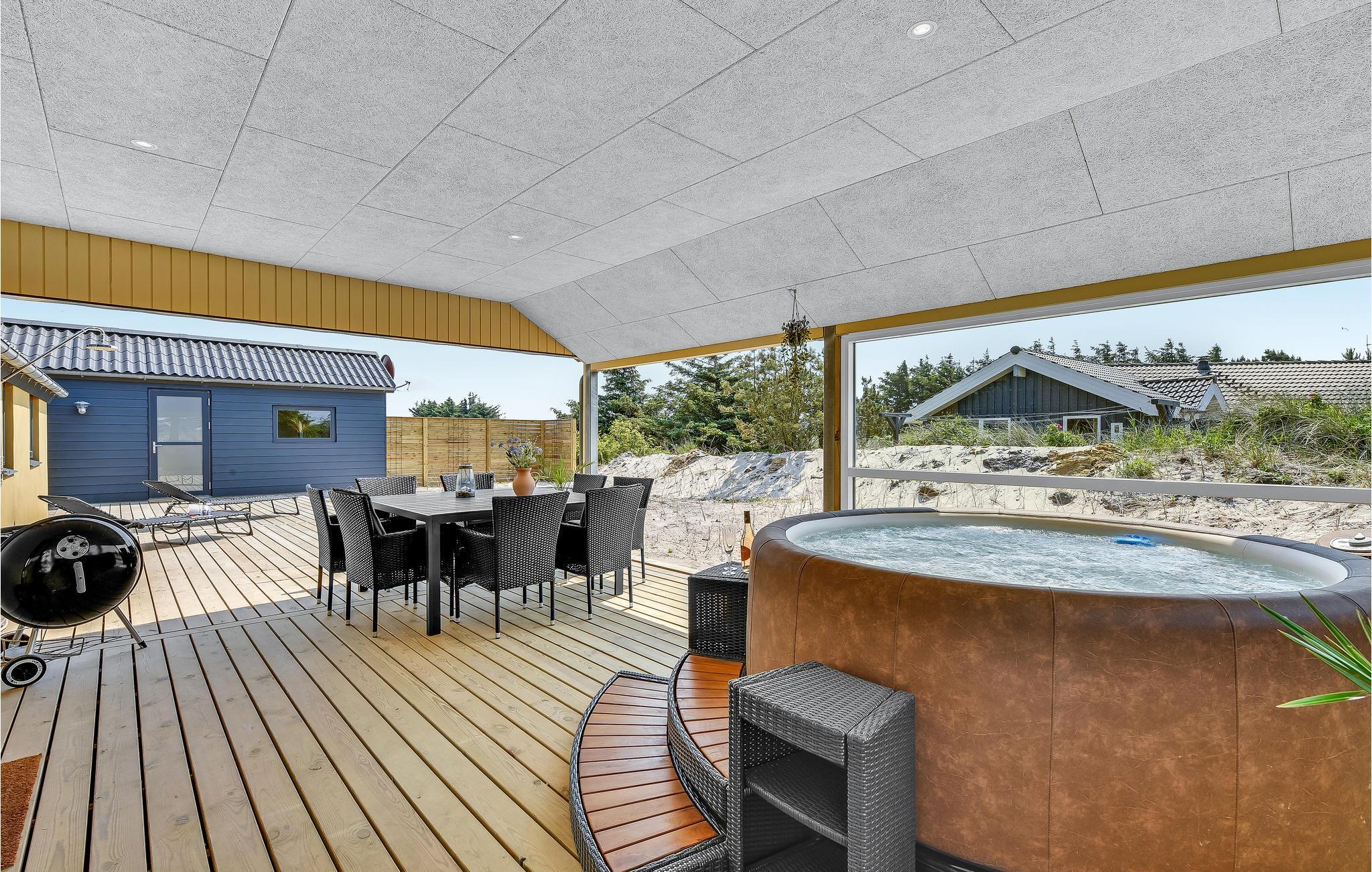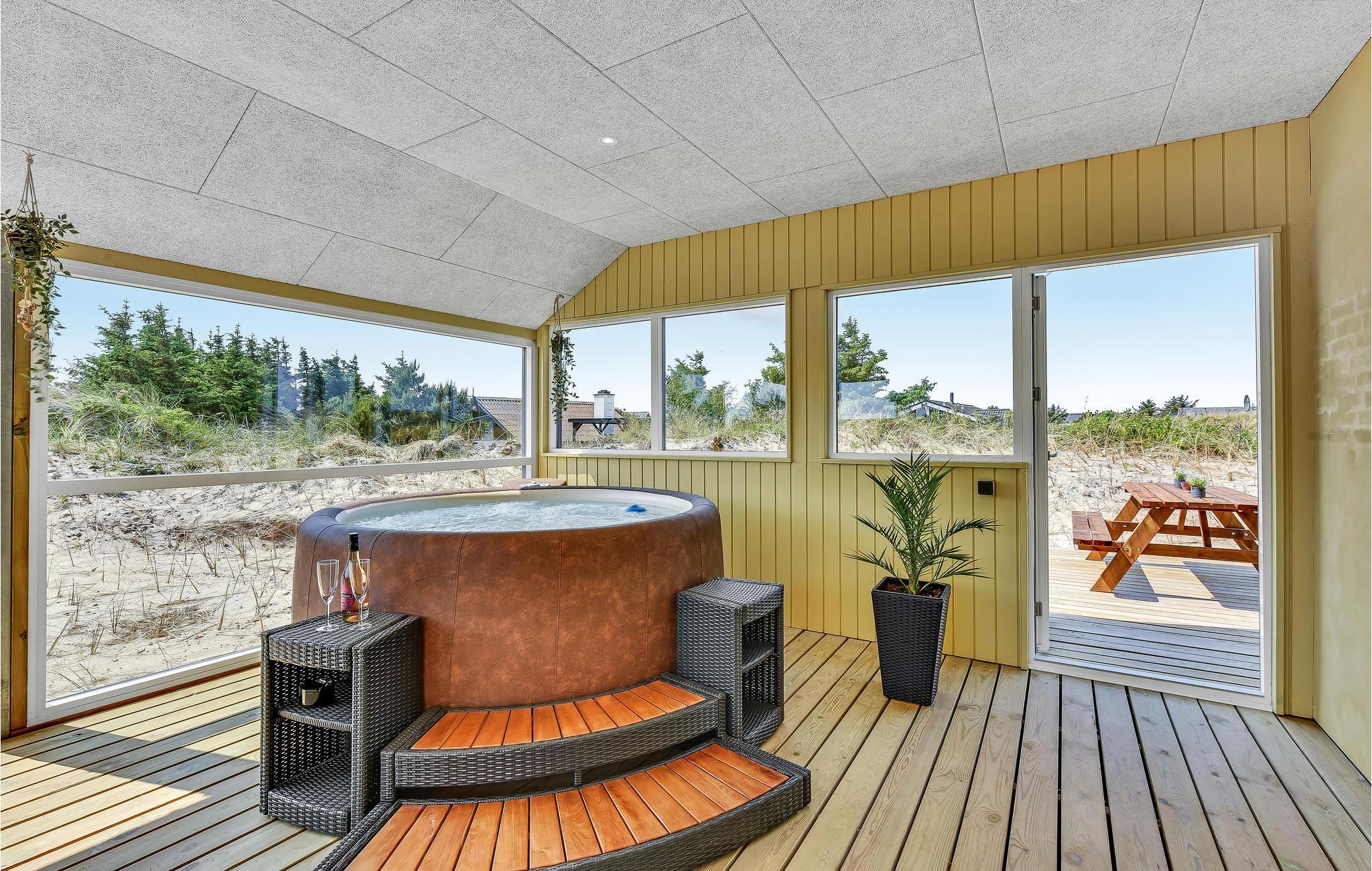 Moderne sommerhus ved Vesterhavet med udendørs spa og naturskøn beliggenhed.