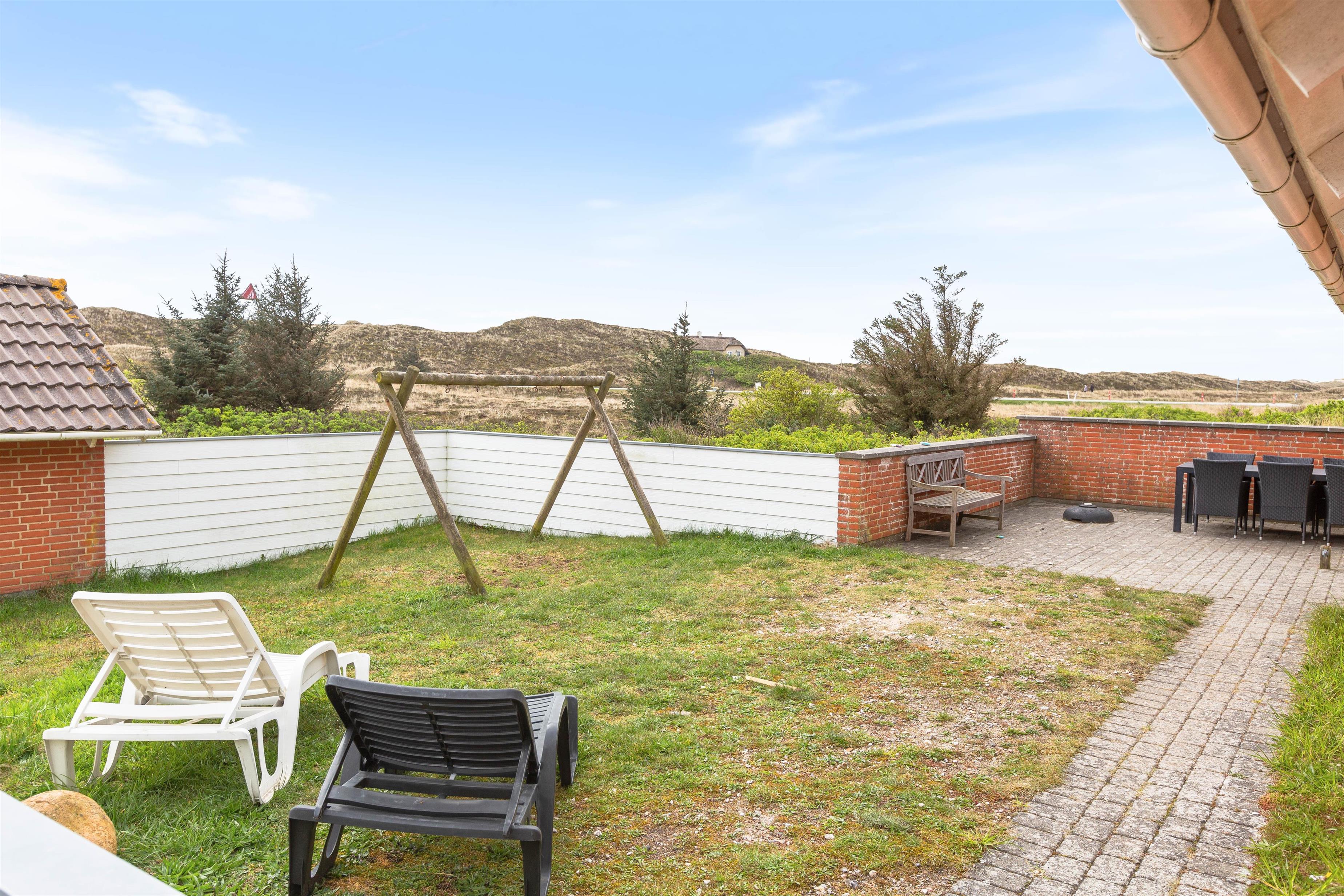 Udsigten fra alle sommerhusets vinduer er fantastisk, her er åbne vidder og et fantastisk lys. Klart, at man vil tilbringe så meget tid som muligt ude i den smukke natur med den skønne havluft. På Vinterlejevej 5 er der fra stuen direkte udgang til en rigtig stor lukket terrasse, hvor I altid kan finde et sol- og læhjørne, og hunden ikke kan smutte nogen steder. Og imens I hygger jer med avisen på feriehusets liggestole vil børnene elske, at svinge gennem luften på sommerhusets gynger.