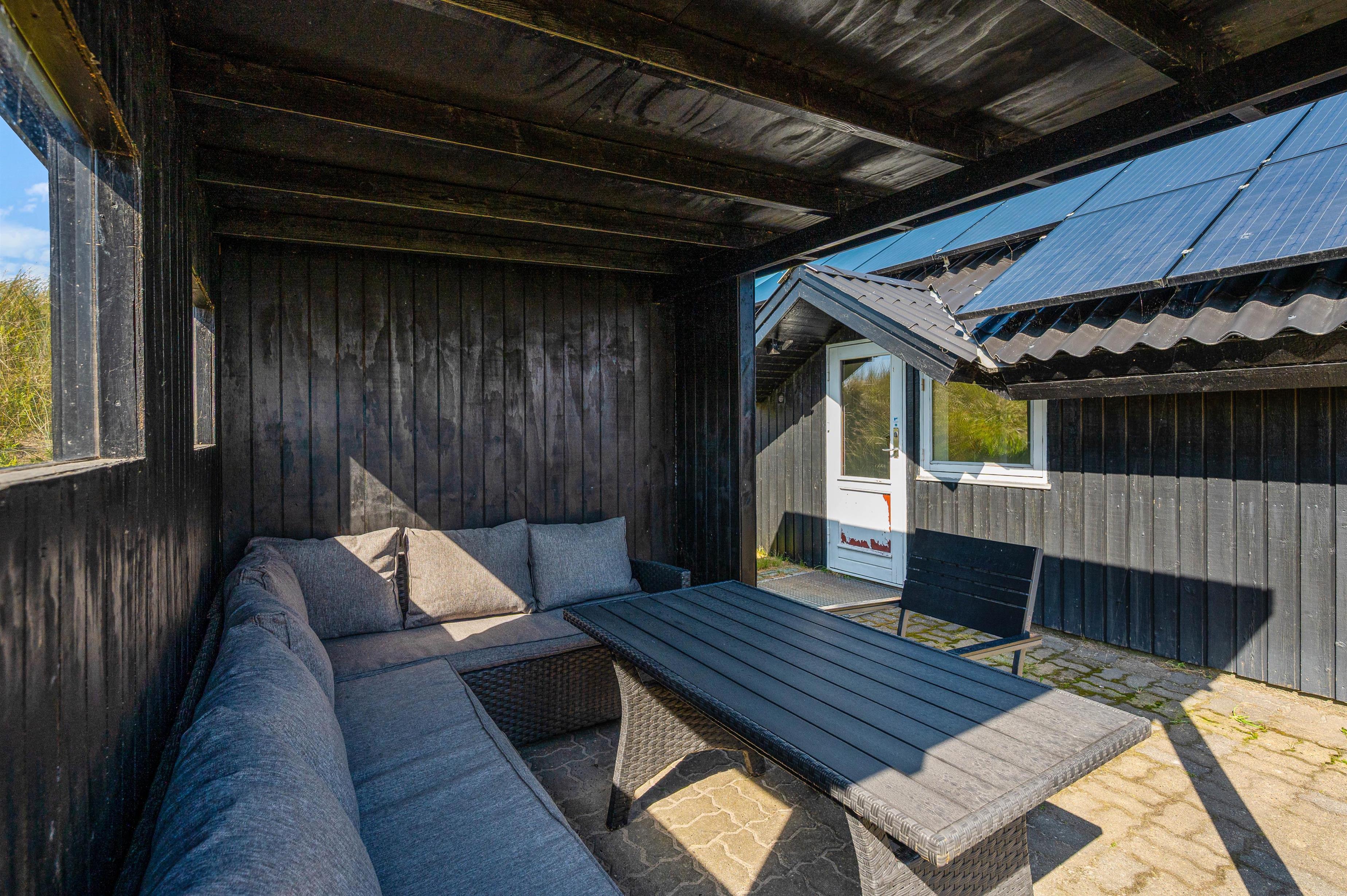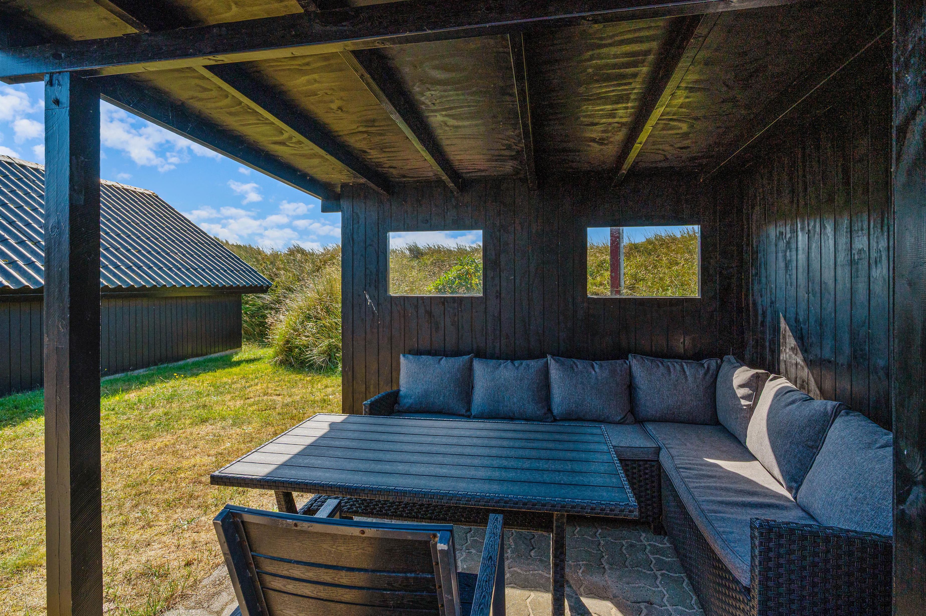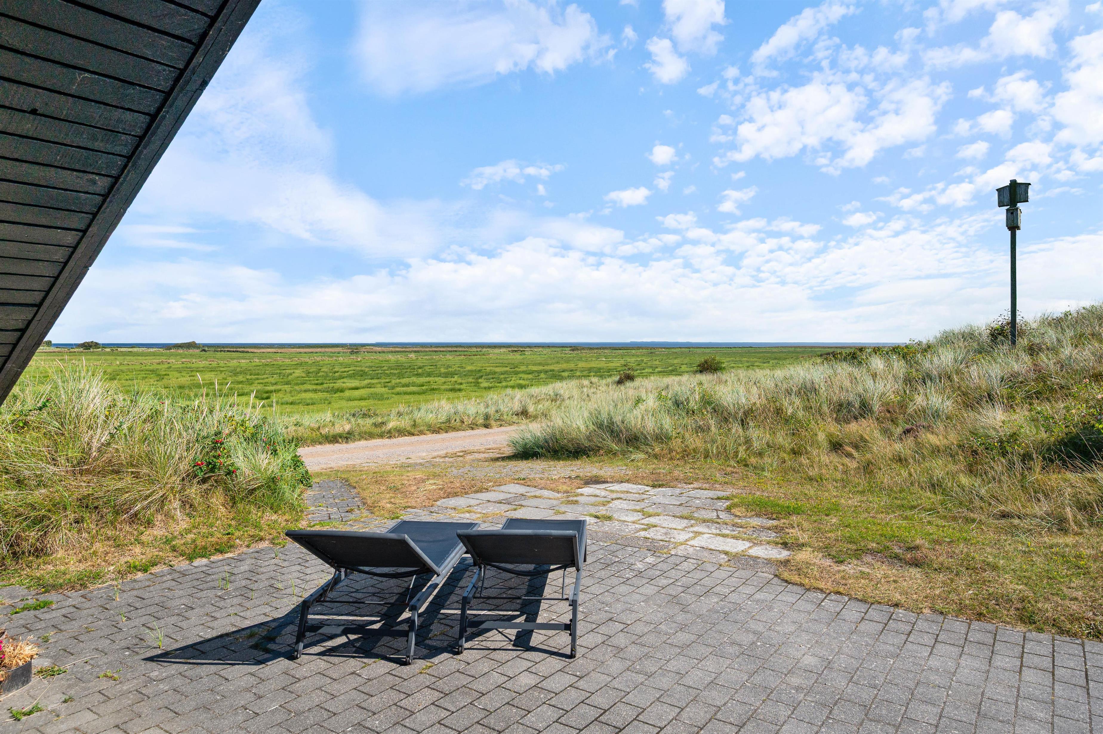 På den åbne terrasse står havemøbler og liggestole klar, så I kan sætte jer udenfor på de solrige dage. Herfra har I udsigt til fjorden og de åbne marker, og på de rigtig skønne sommerdage kan I drikke morgenkaffen ved havebordet i morgensolens skær.