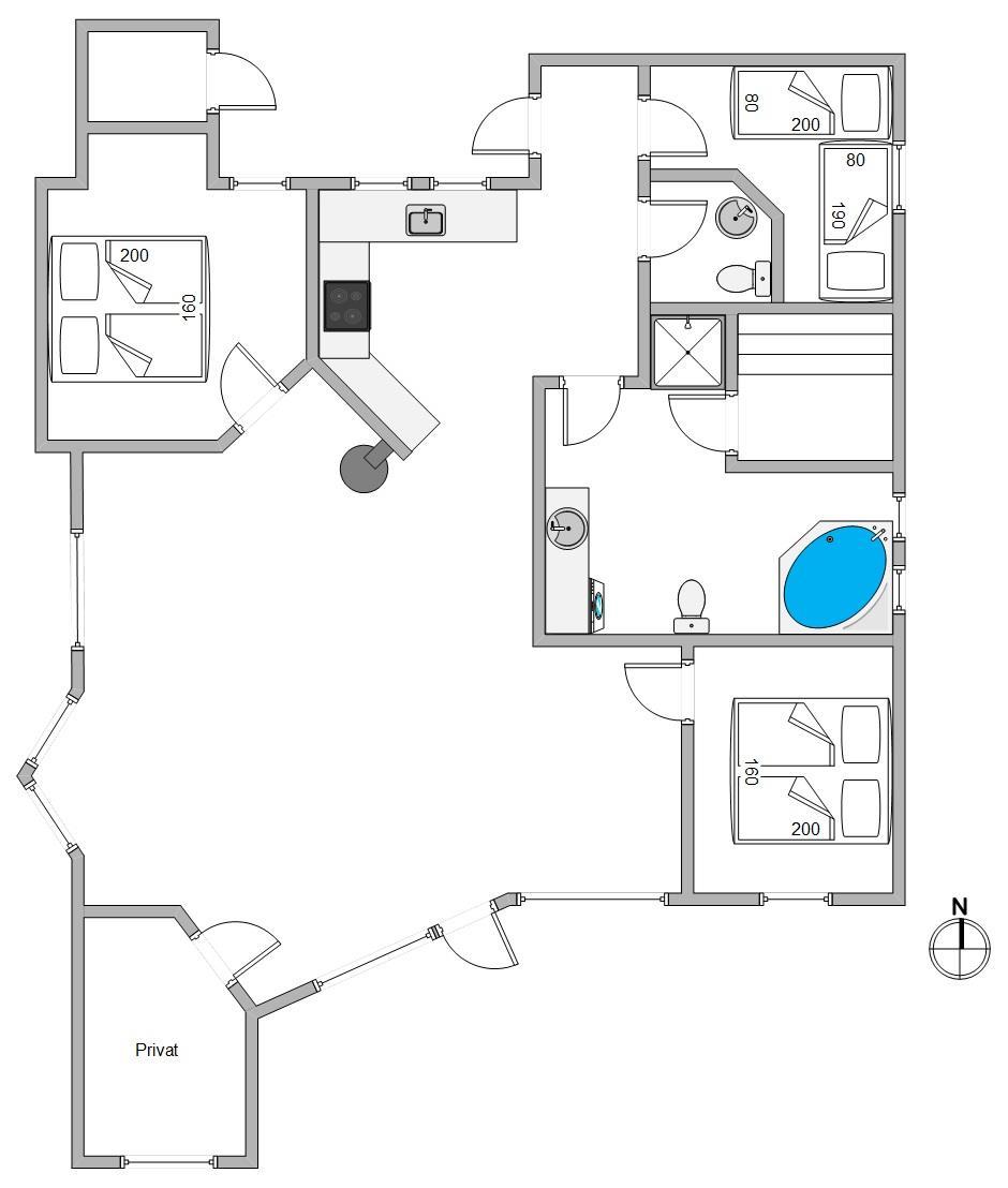 Sommerhusets badeværelse er med spabad og sauna, og derudover er der også et gæstetoilet. I sommerhuset er der desuden gratis, trådløst internet, så du kan gå på nettet, når det passer dig.