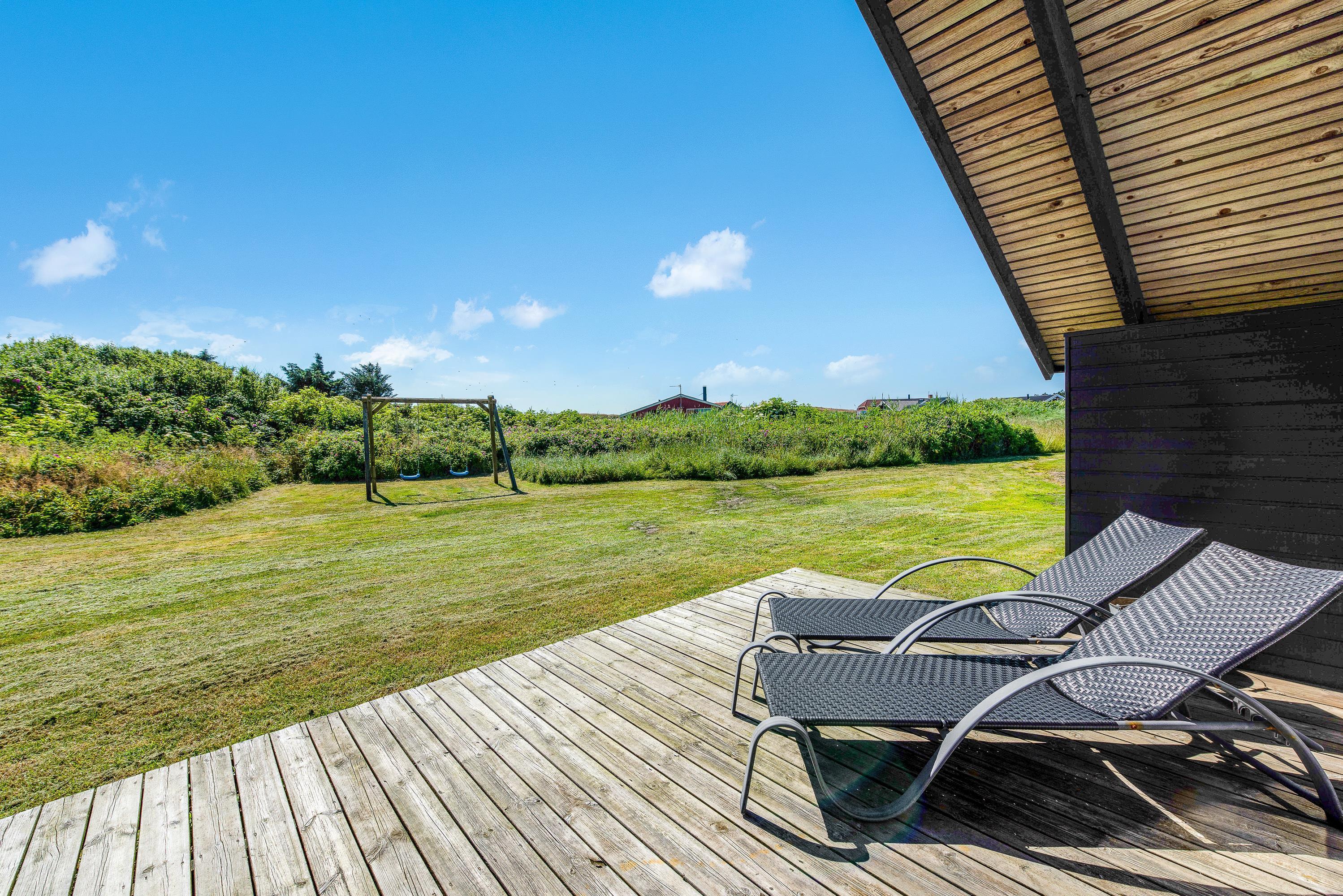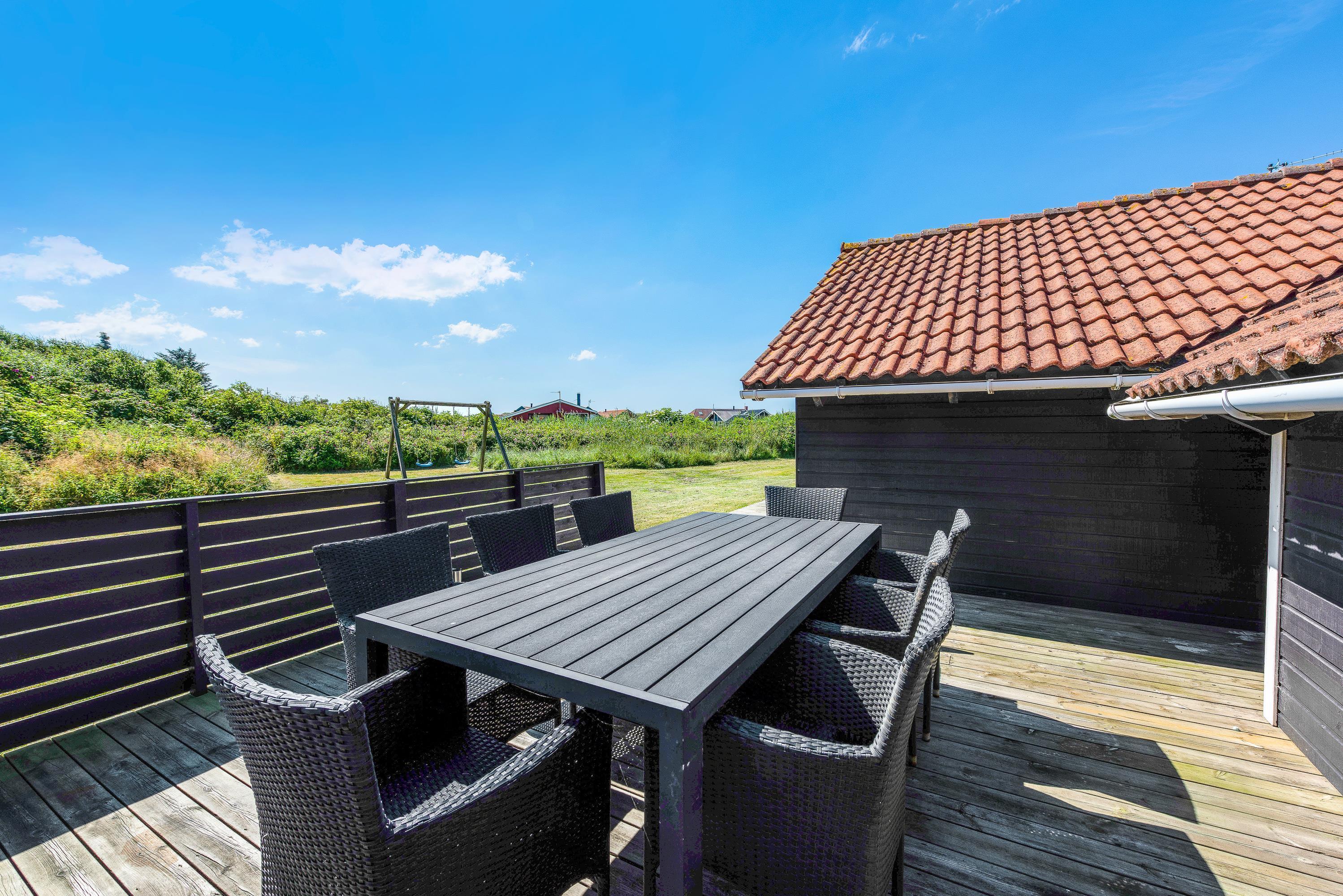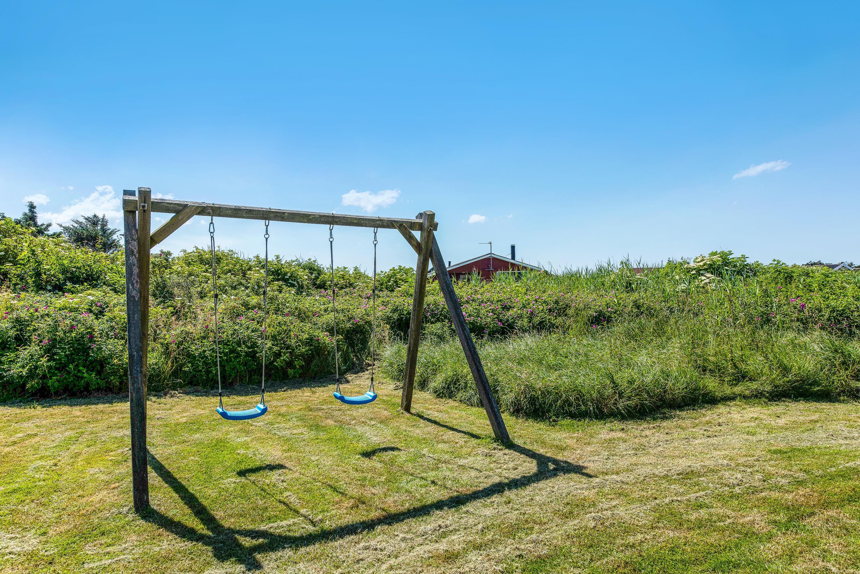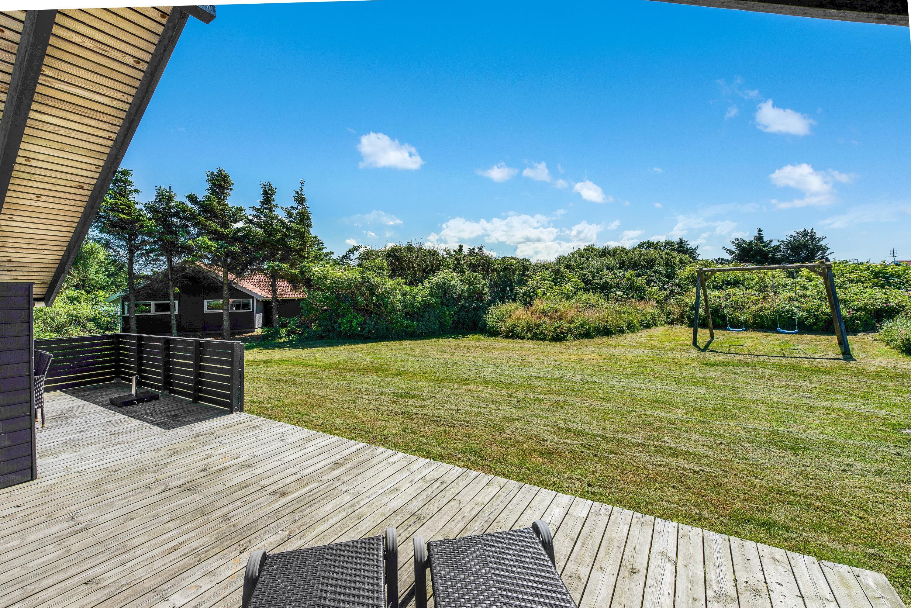 På den sydvestlige side af feriehuset er terrassen, der er delvist afskærmet, hvor I rigtig kan nyde udelivet. Her venter havemøblerne blot på jer! På den store græsplæne er der både sandkasse og gynge m.m. – alletiders til leg og sjov for den store familie.