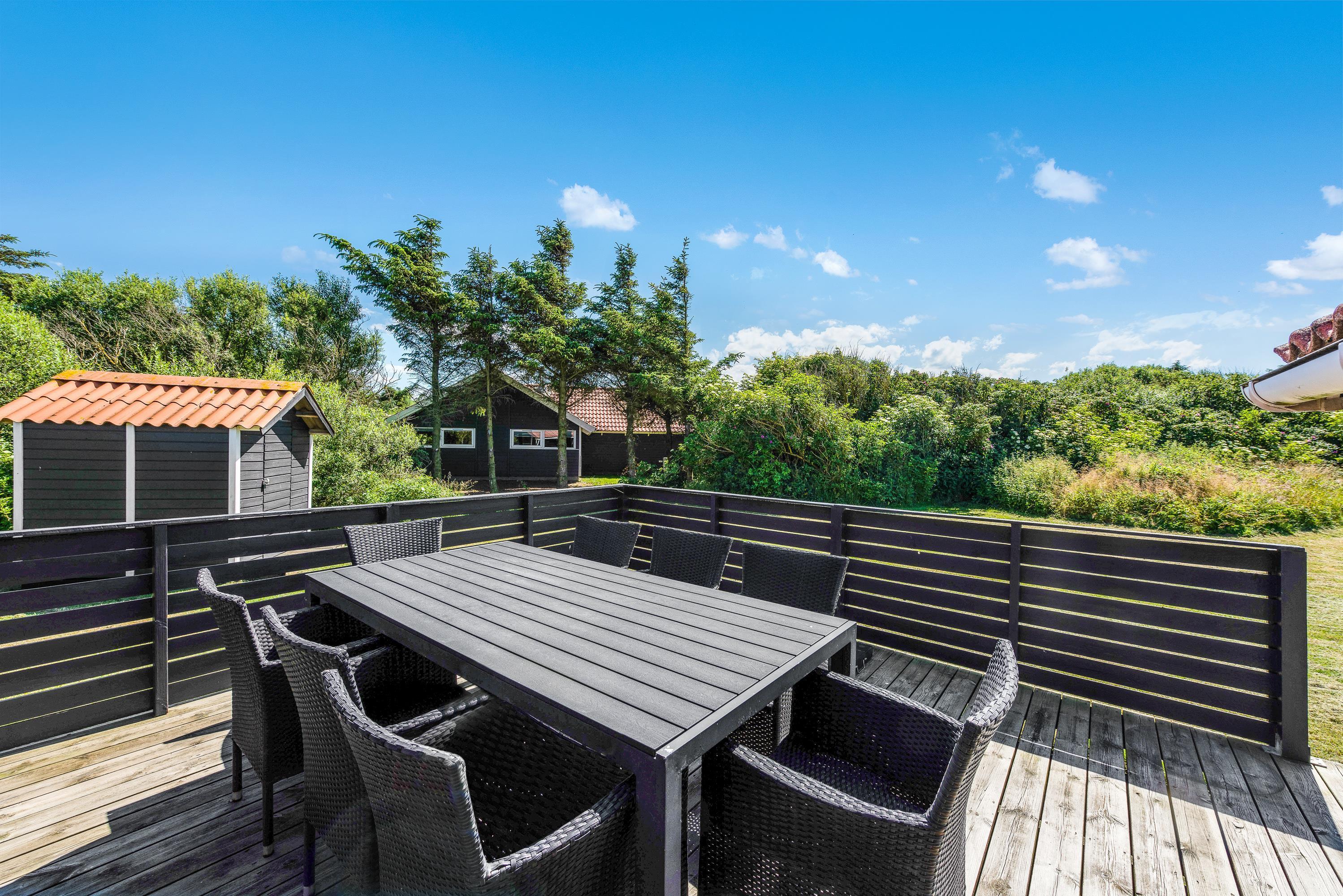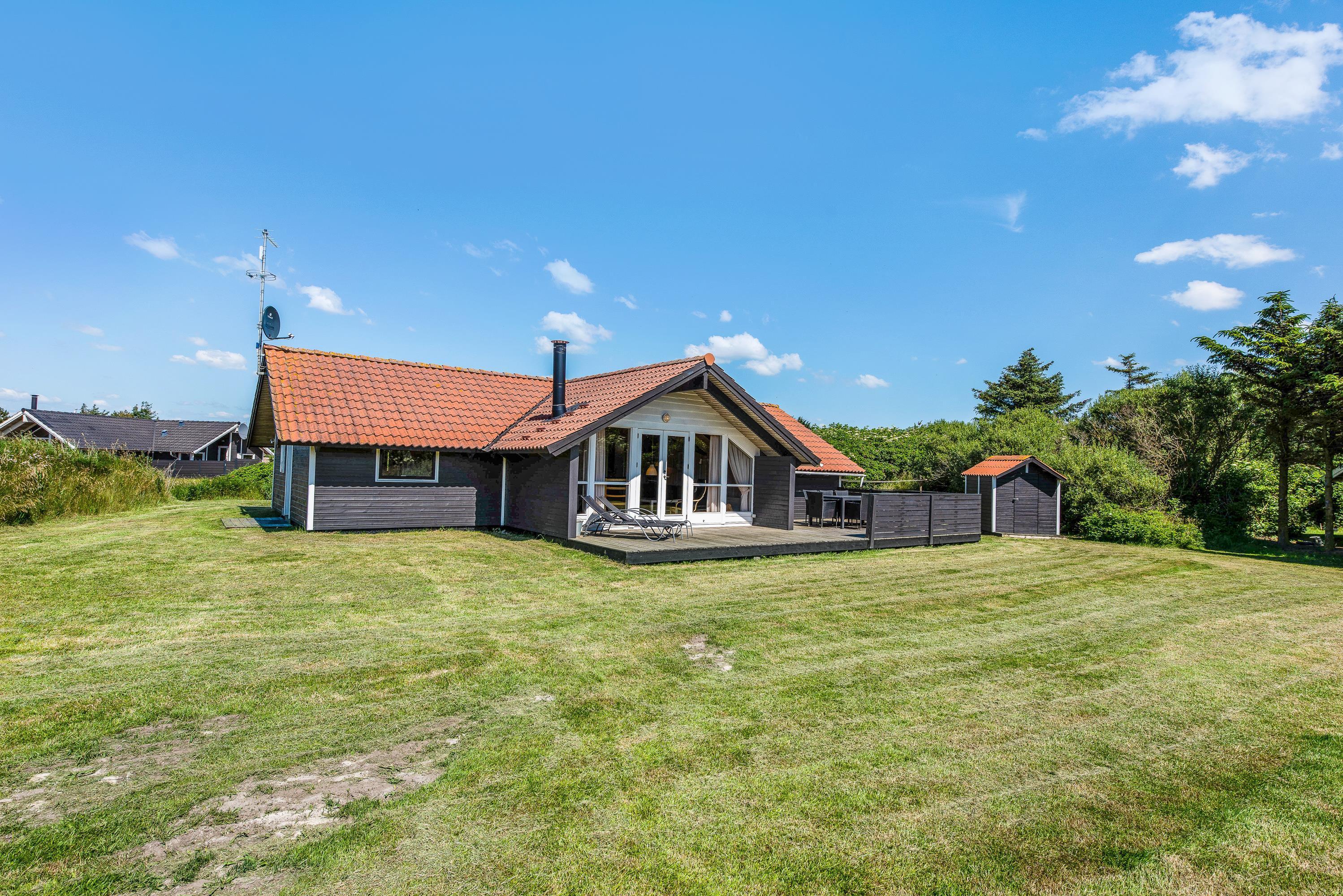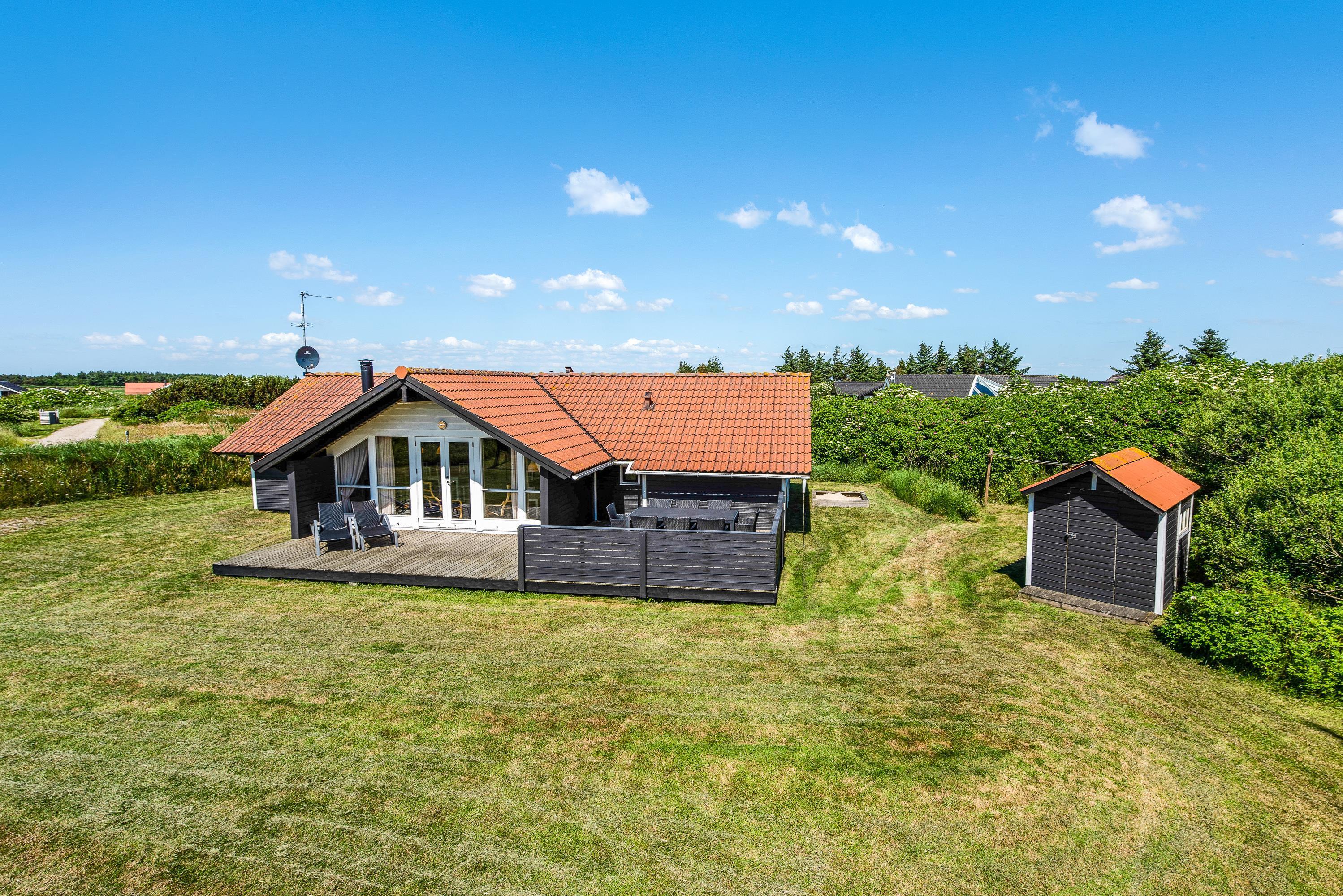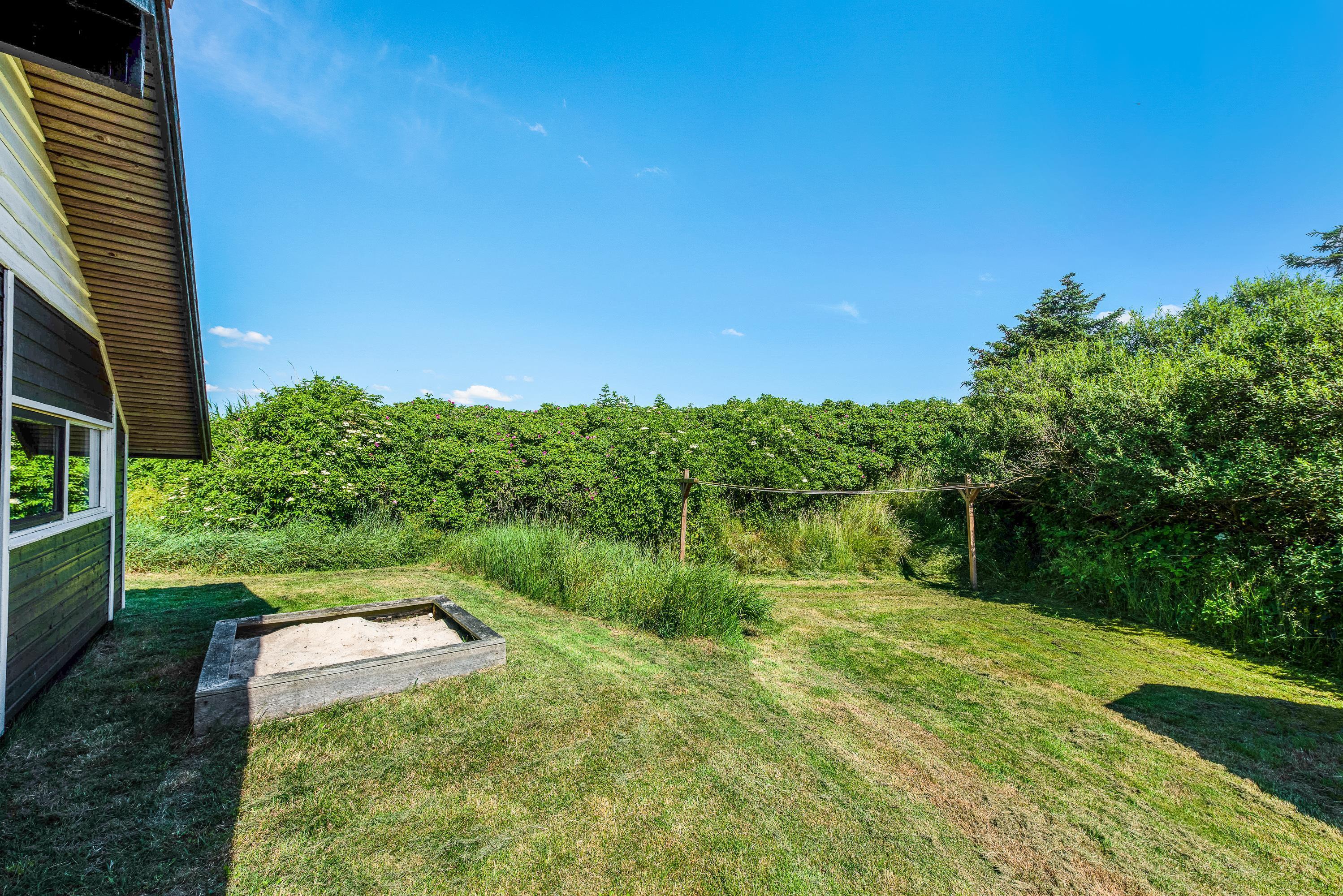 På den sydvestlige side af feriehuset er terrassen, der er delvist afskærmet, hvor I rigtig kan nyde udelivet. Her venter havemøblerne blot på jer! På den store græsplæne er der både sandkasse og gynge m.m. – alletiders til leg og sjov for den store familie.