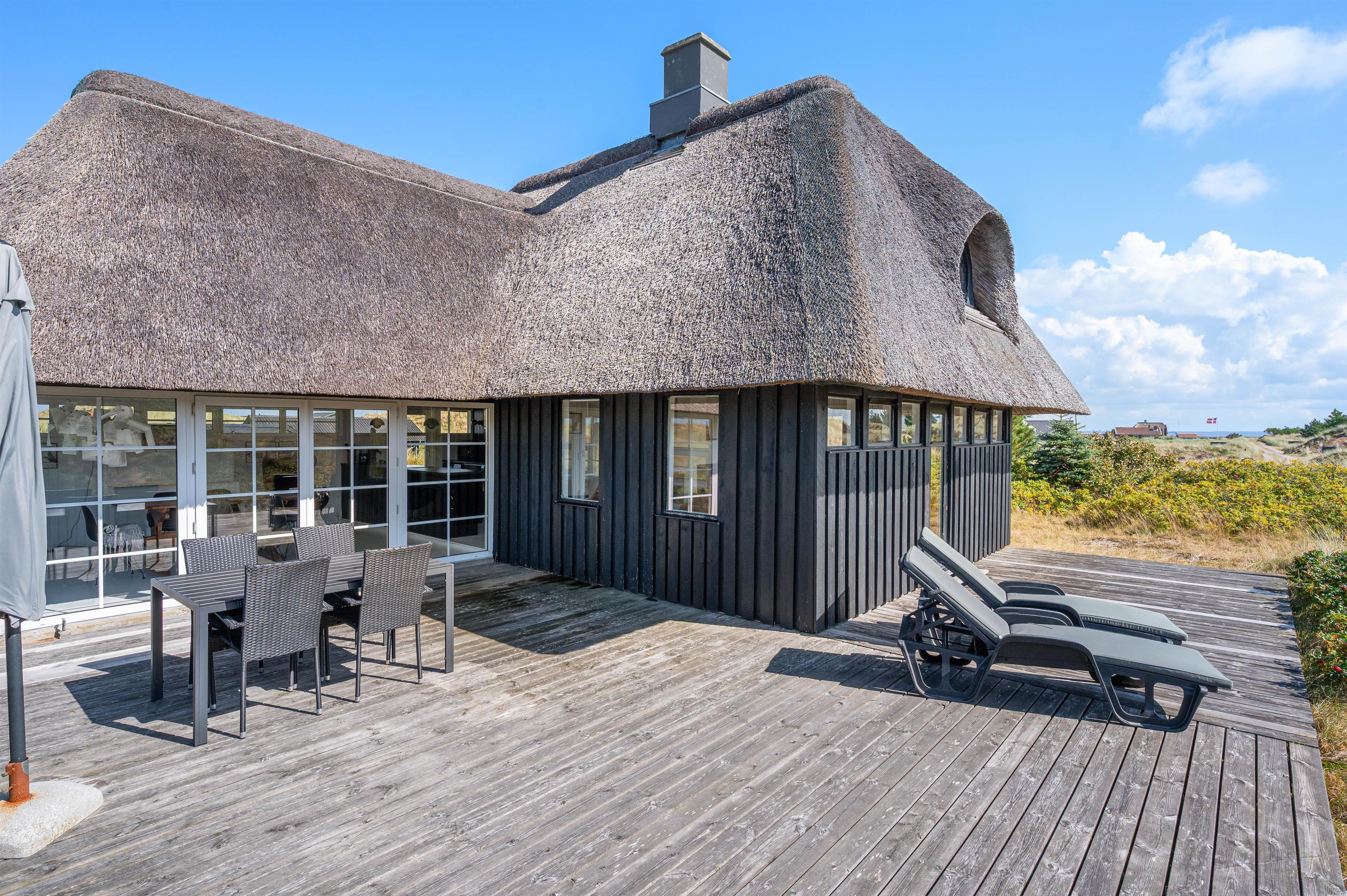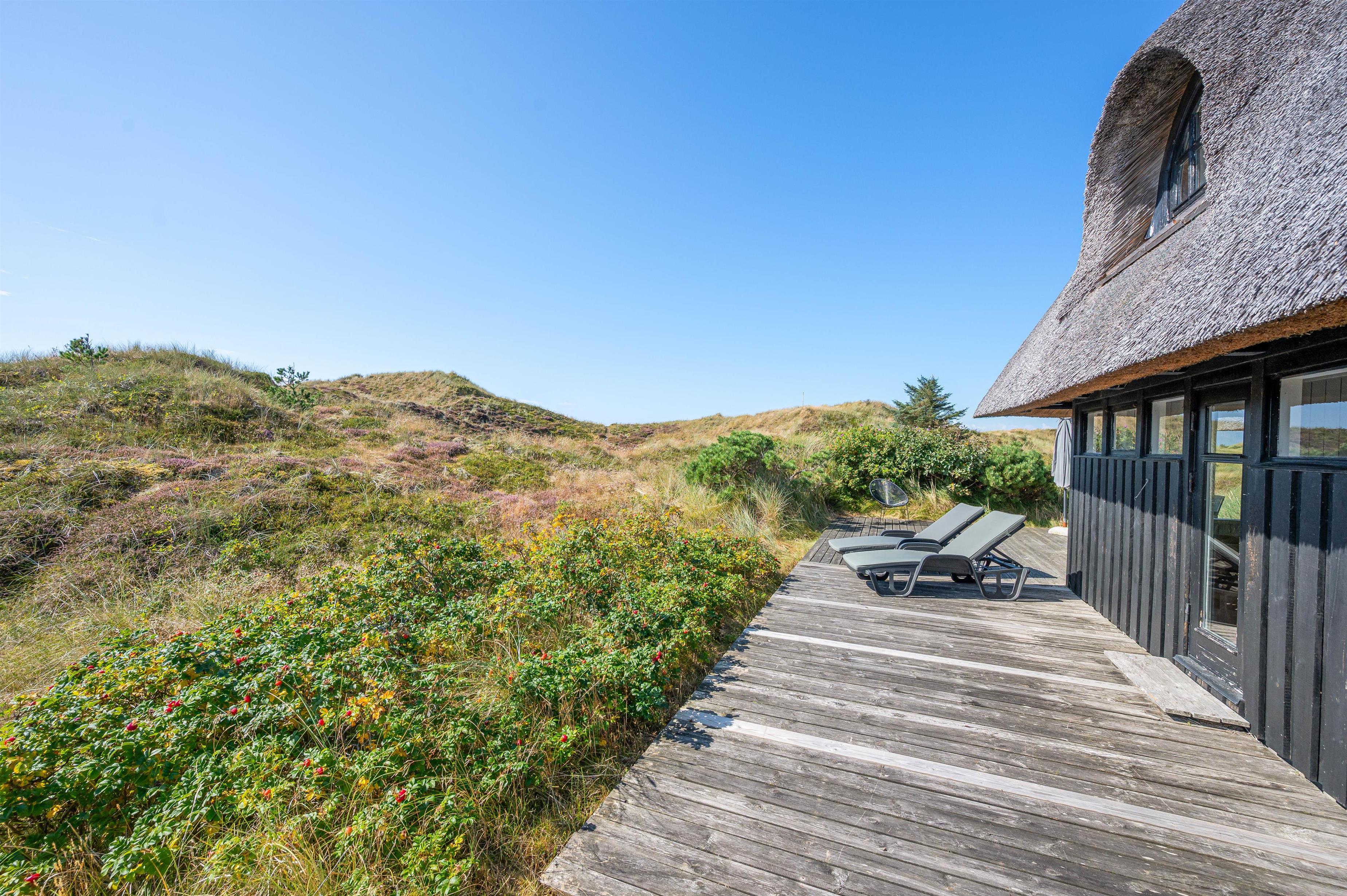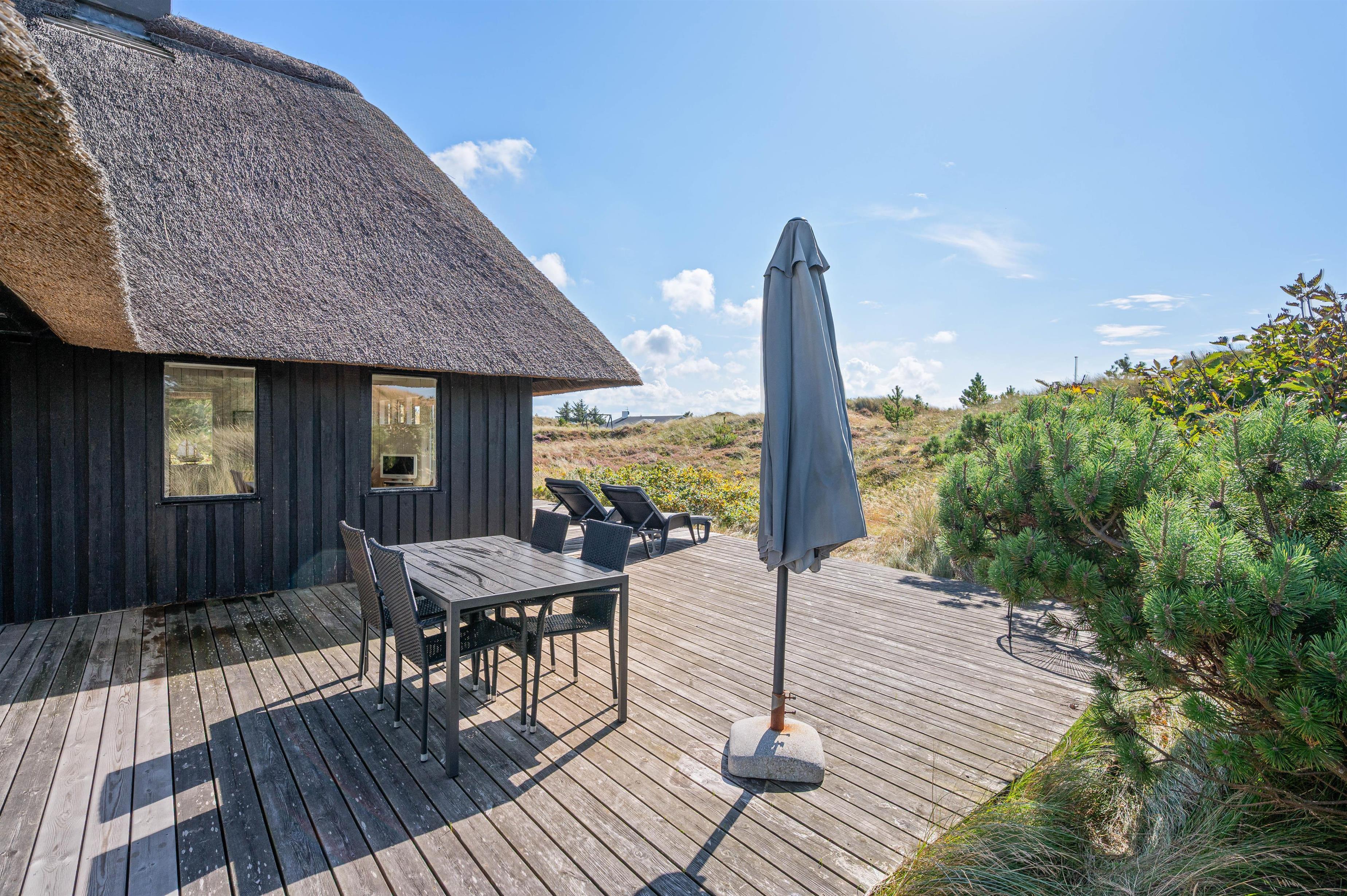 Det er ikke kun indretningen, der charmer. Også udvendigt oser feriehjemmet af klassisk sommerhus med det fine stråtag og det vestjyske klitlandskab i baggrunden. På den åbne terrasse kan I nyde de naturskønne omgivelser og den friske luft i fulde drag - ganske ugeneret.