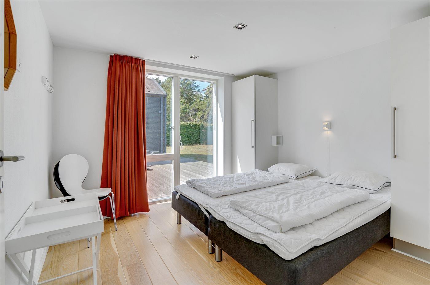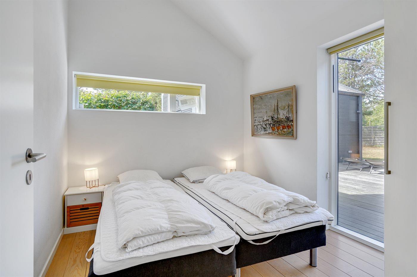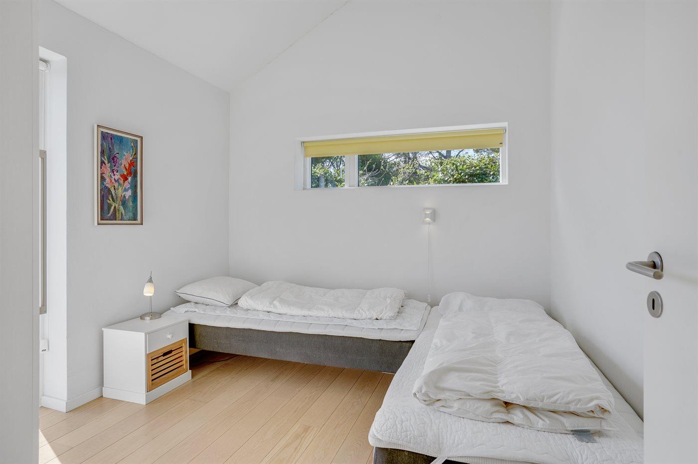 Der er i alt 4 soveværelser. Sovepladserne fordeler sig på: 6 sovepladser i dobbeltsenge. 2 sovepladser i enkeltsenge. 3 sovepladser på madrasser. 3 af disse sovepladser befinder sig på husets hems. Derudover er der 2 stk. barnesenge.