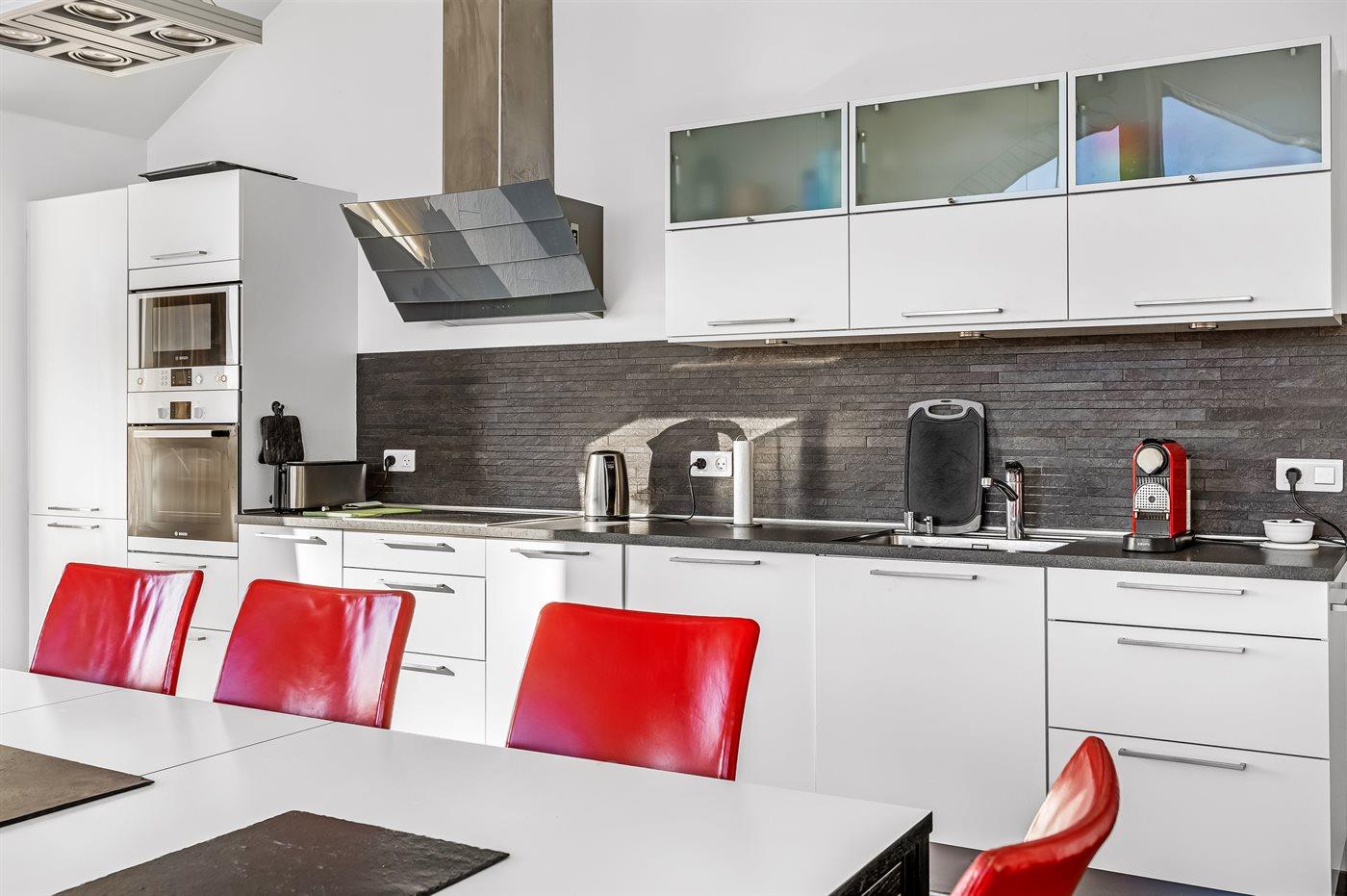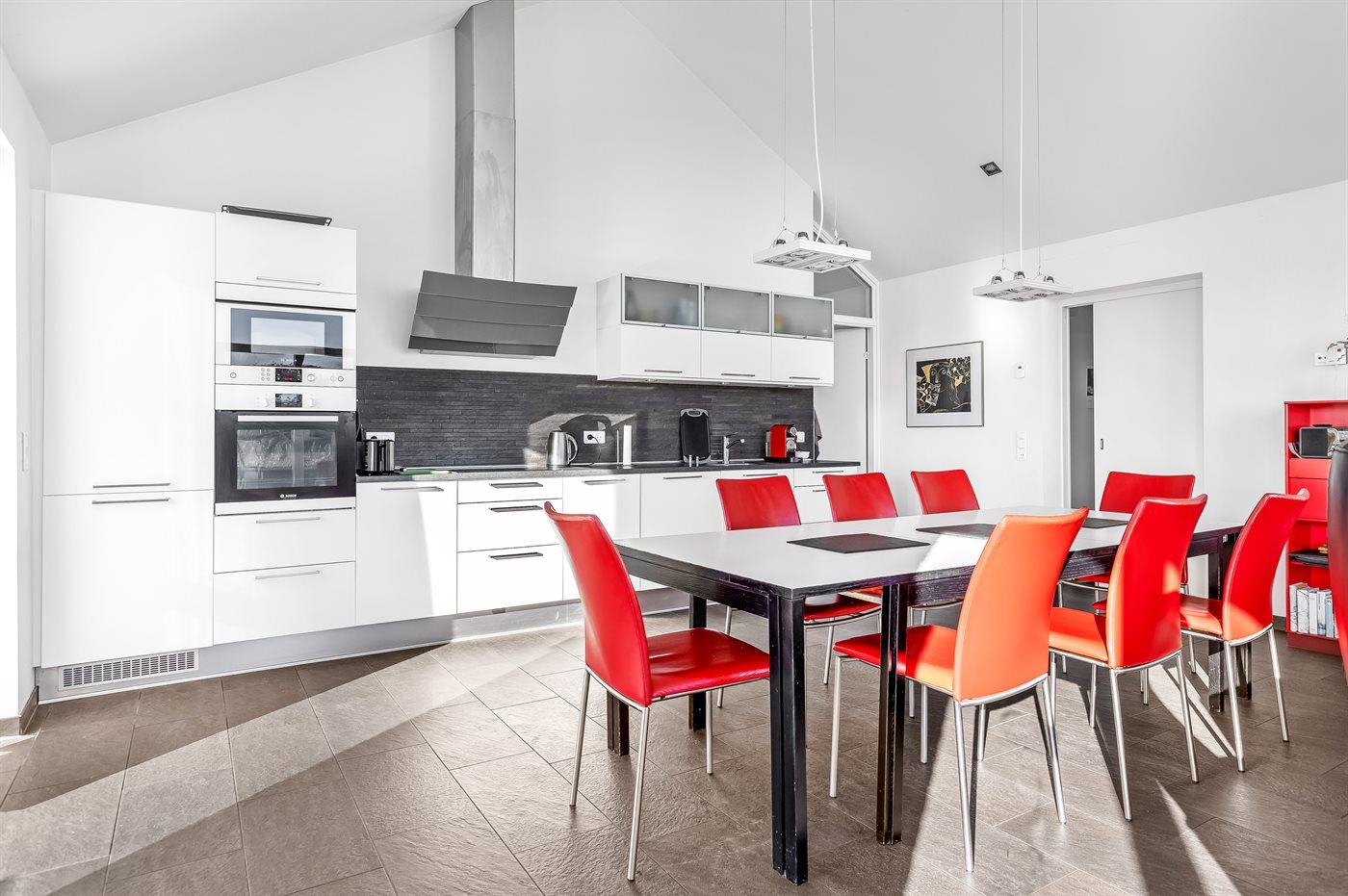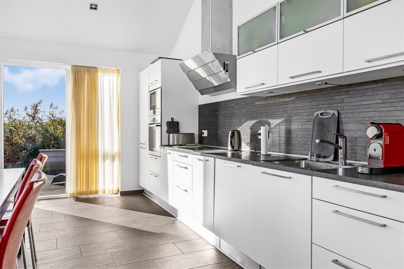 Køkkenet er udstyret med 1 køleskab. Der er 4 keramiske kogeplader, varmluftovn, mikrobølgeovn, opvaskemaskine samt en Nespresso-kaffemaskine.