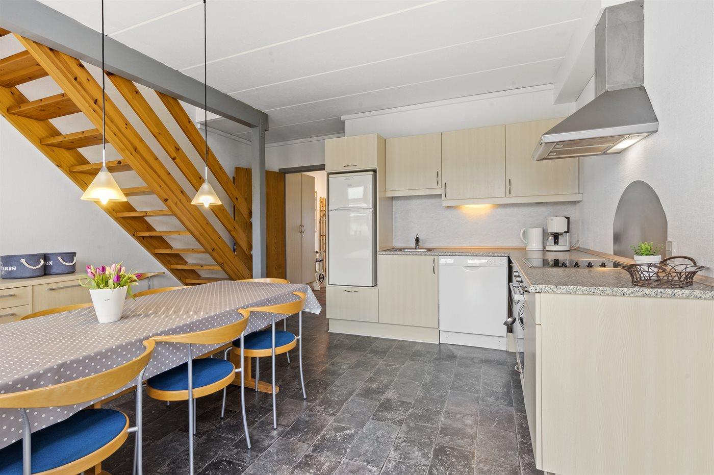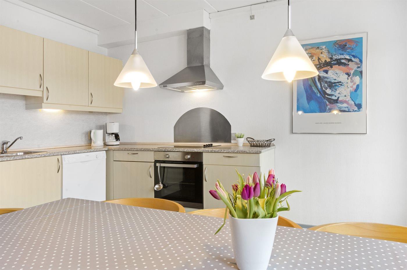 Køkkenet er udstyret med 1 køleskab. Der er 4 keramiske kogeplader, varmluftovn, mikrobølgeovn samt opvaskemaskine.