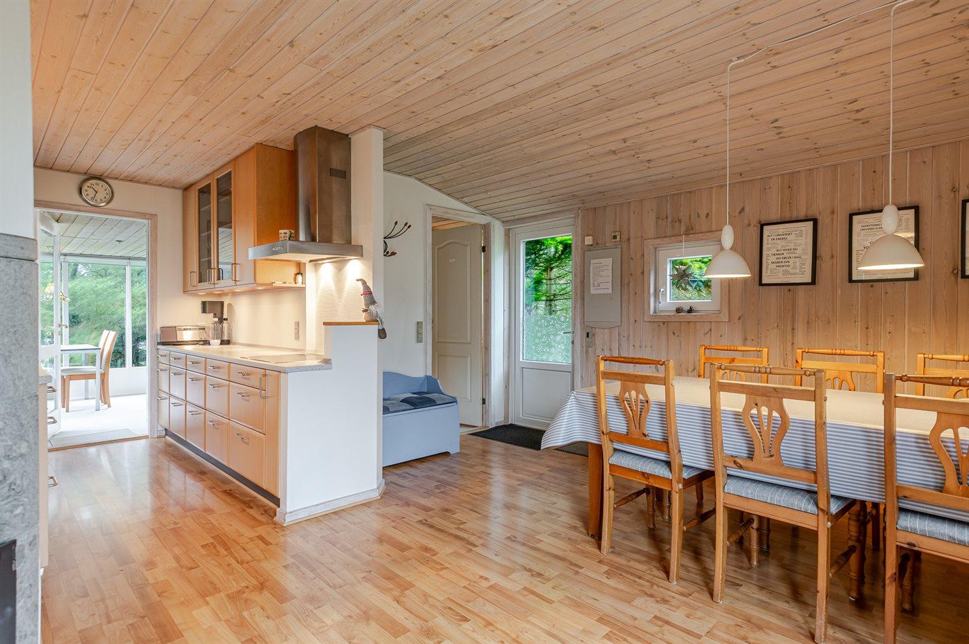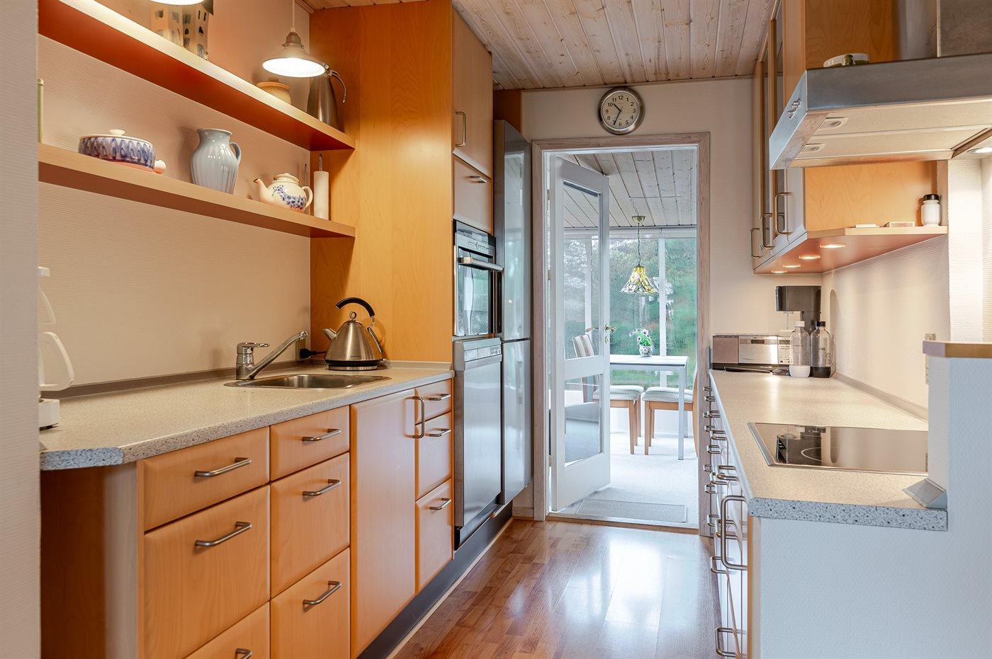 Køkkenet er udstyret med 1 køleskab. Der er 4 keramiske kogeplader, varmluftovn samt opvaskemaskine.