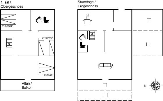 Der er i alt 3 soveværelser. Sovepladserne fordeler sig på: 4 sovepladser i dobbeltsenge. 2 sovepladser i enkeltsenge. Derudover er der 1 stk. barneseng.