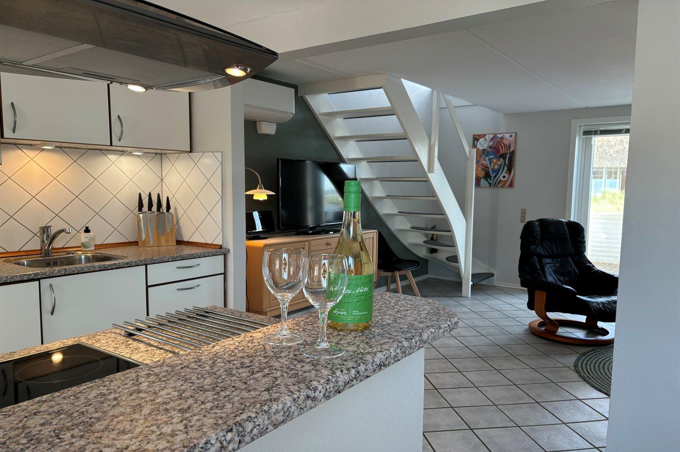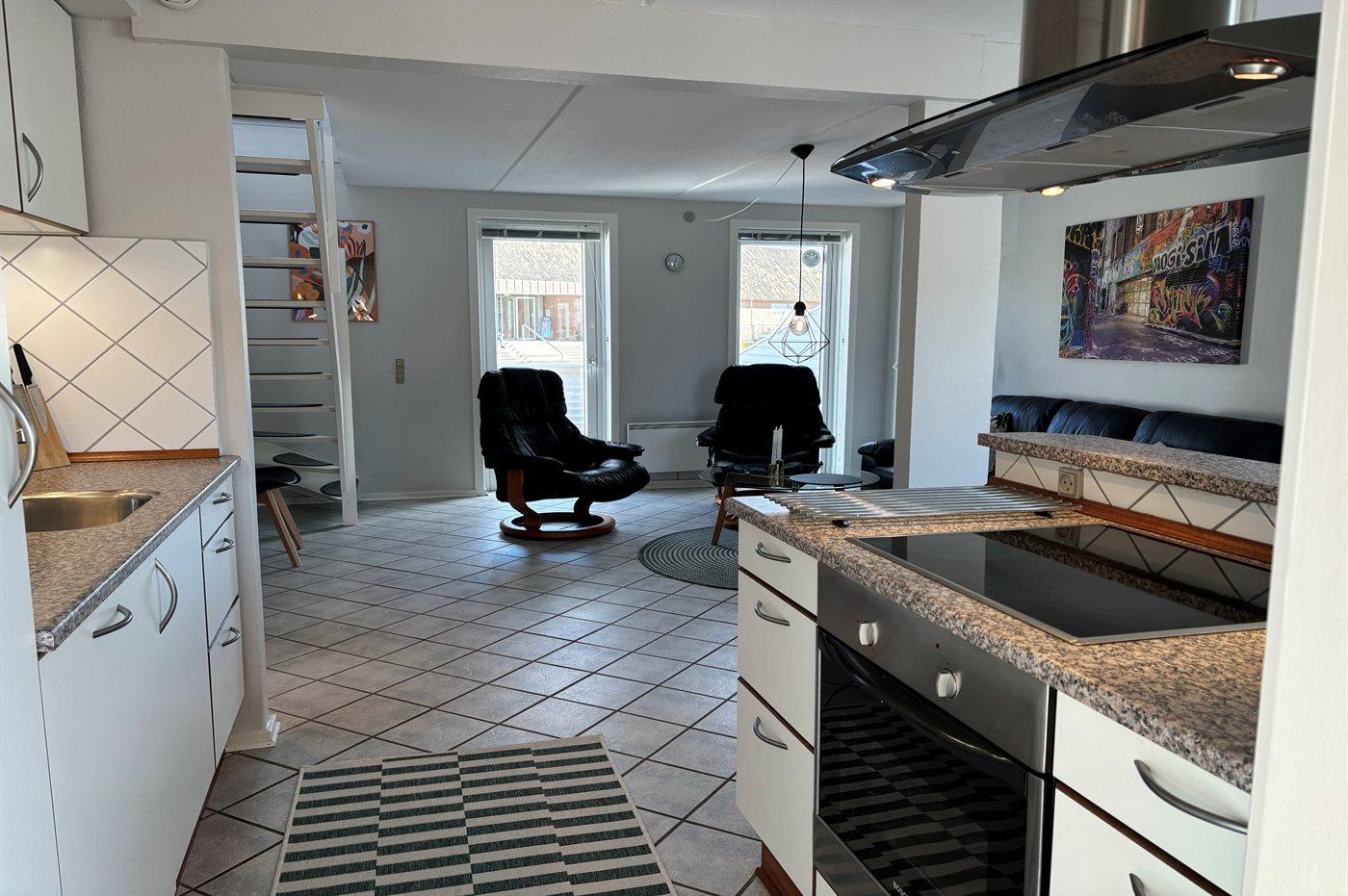 Køkkenet er udstyret med 1 køleskab. Der er 4 elkogeplader, bageovn, mikrobølgeovn samt opvaskemaskine.