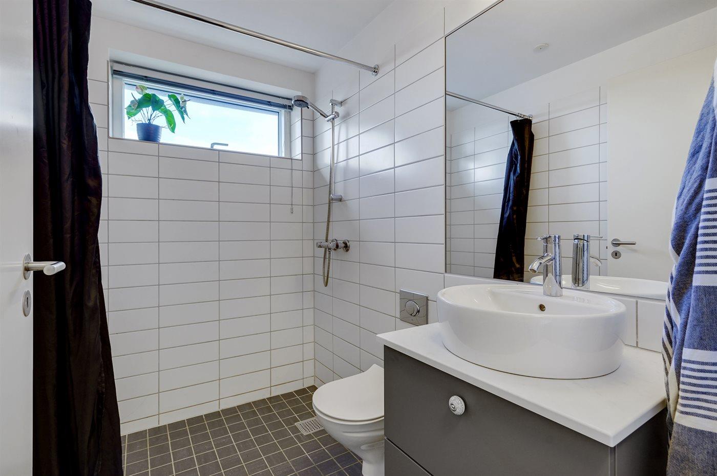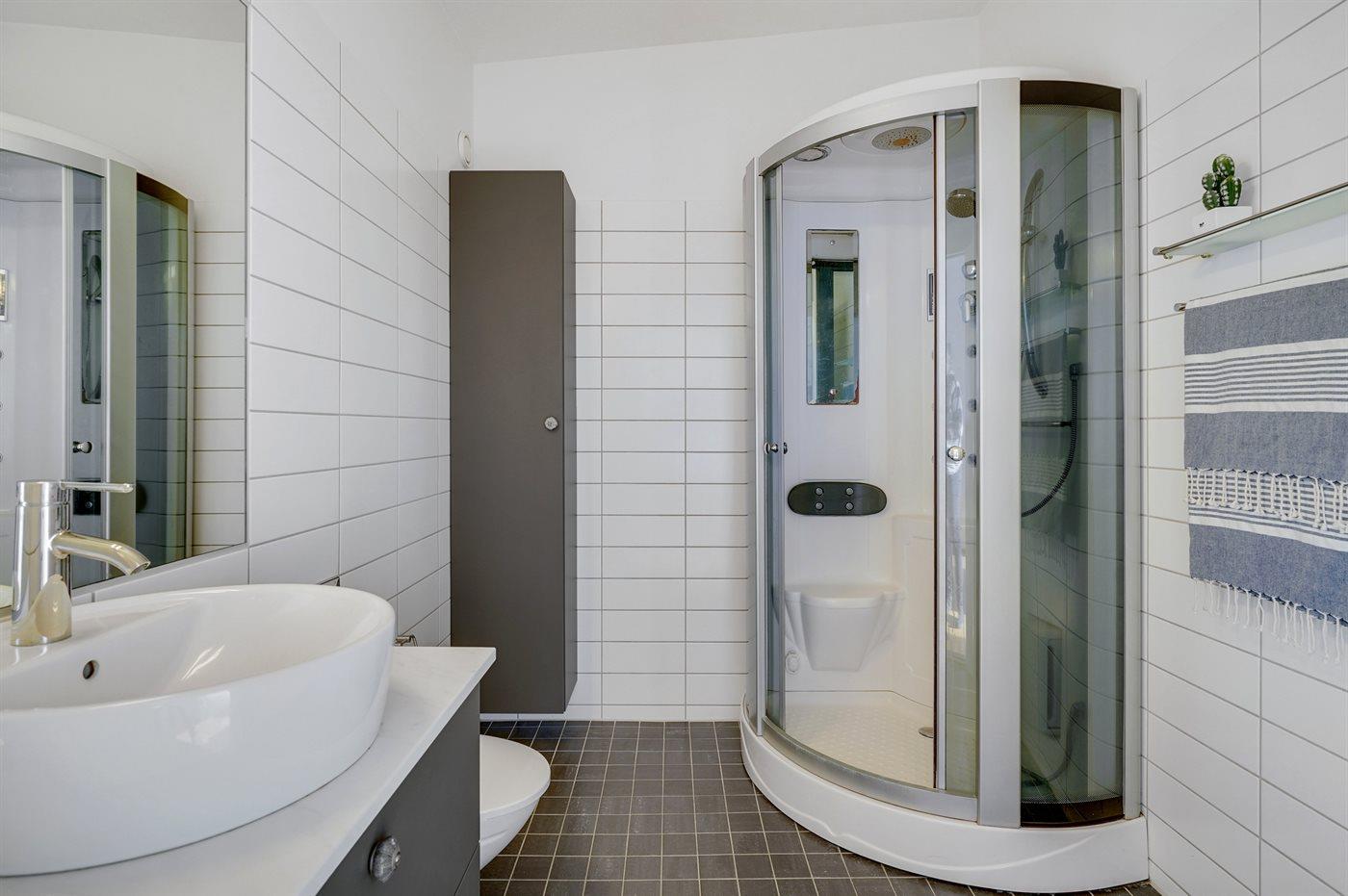 Der er 2 badeværelser med bruser og 2 toiletter. Der er gulvvarme på 1 badeværelse. Dampkabine.