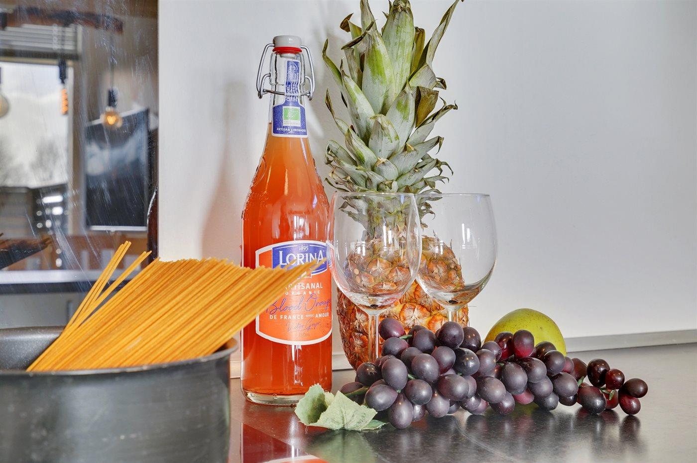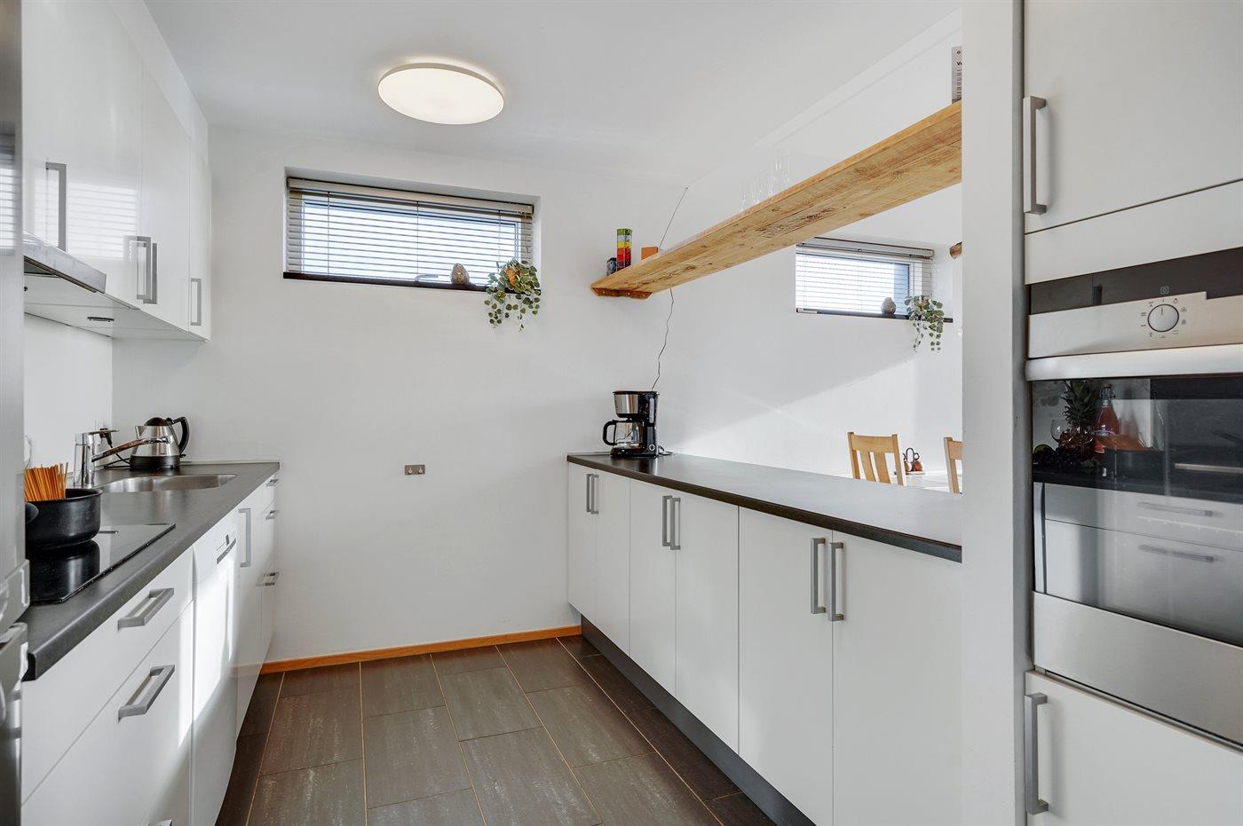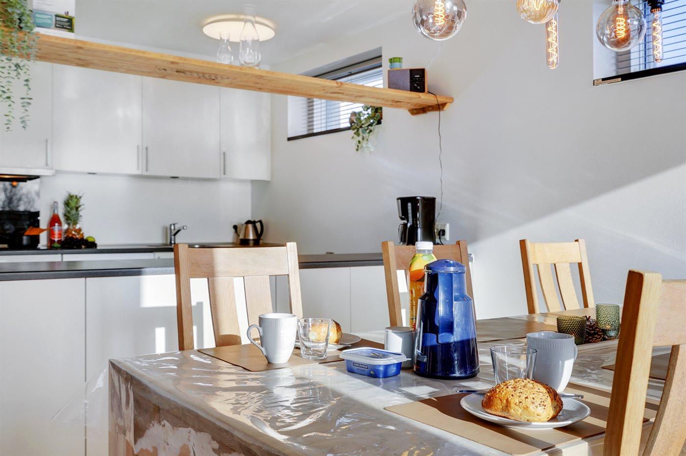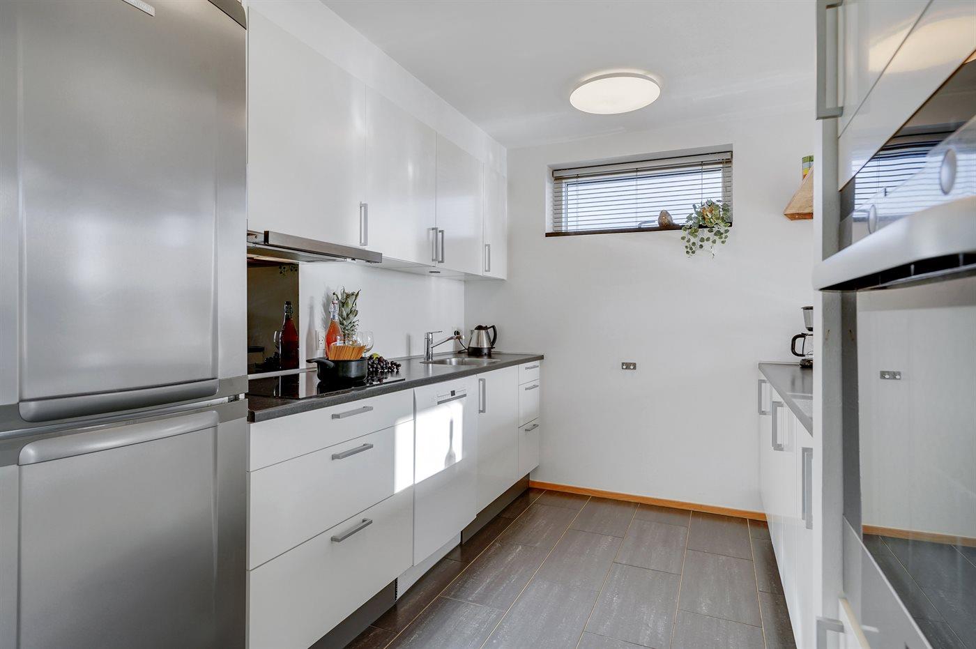 Køkkenet er udstyret med 1 køleskab. Der er 4 keramiske kogeplader, varmluftovn samt opvaskemaskine.