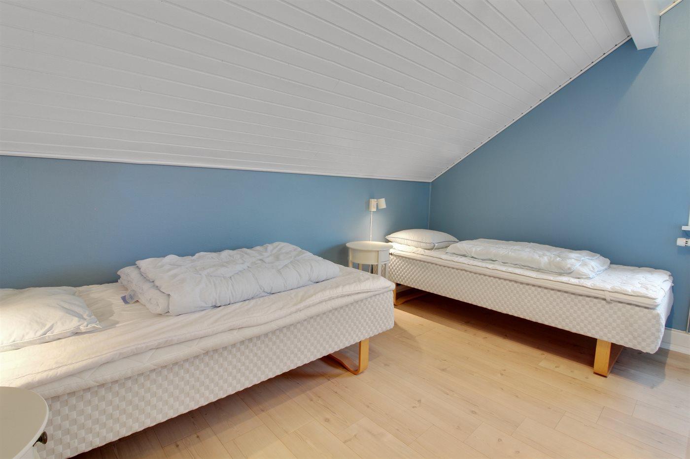 Der er i alt 3 soveværelser. Sovepladserne fordeler sig på: 2 sovepladser i dobbeltseng. 3 sovepladser i enkeltsenge. Derudover er der 1 stk. barneseng.