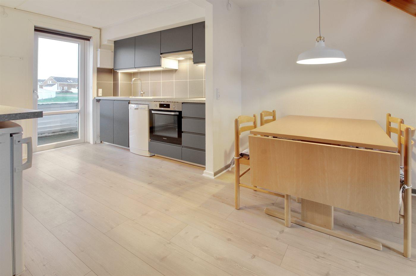 Køkkenet er udstyret med 1 køleskab. Der er 4 induktionskogeplader, varmluftovn, mikrobølgeovn samt opvaskemaskine.