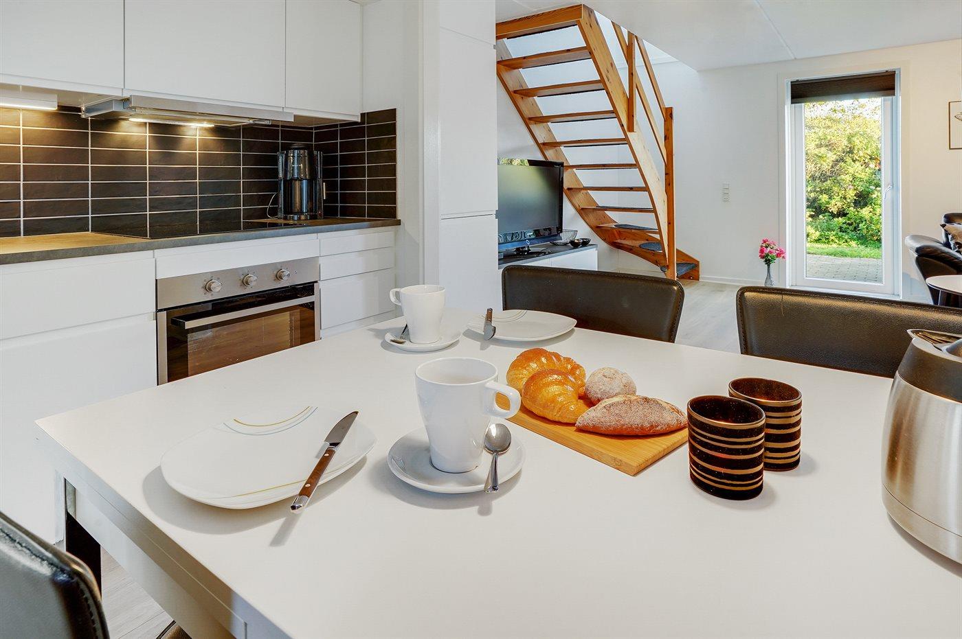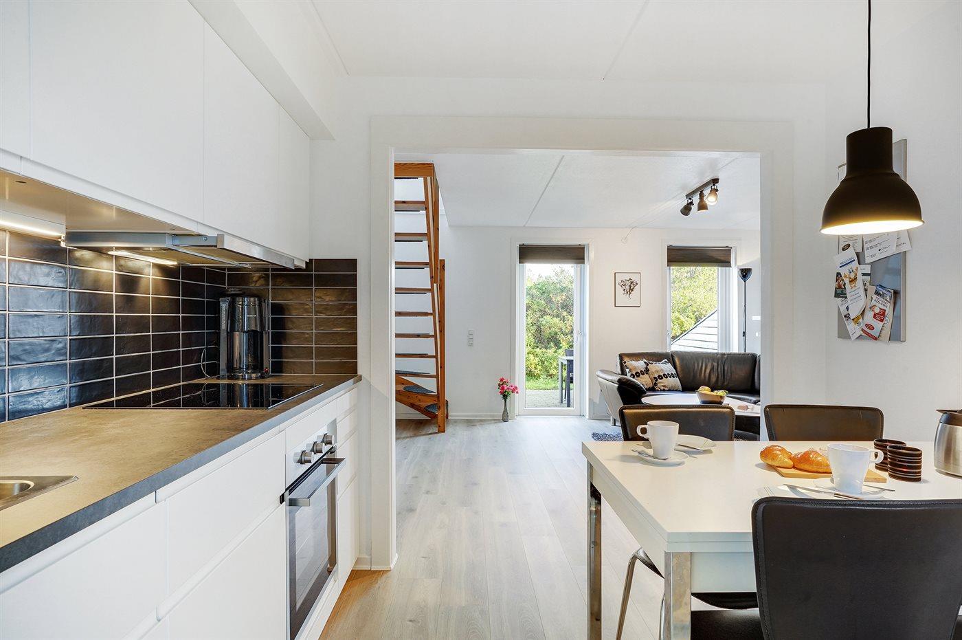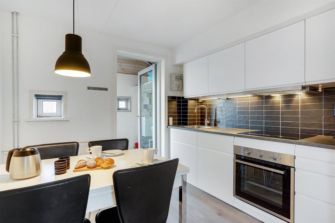 Køkkenet er udstyret med 1 køleskab. Der er 4 elkogeplader, varmluftovn, mikrobølgeovn samt opvaskemaskine.