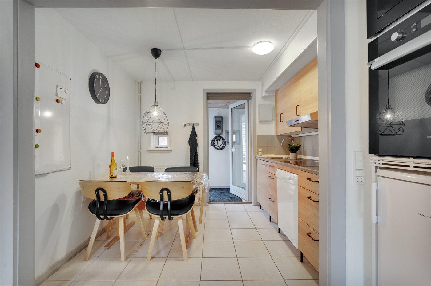 Køkkenet er udstyret med 1 køleskab. Der er 4 keramiske kogeplader, varmluftovn, kombineret miniovn og mikrobølgeovn samt opvaskemaskine.