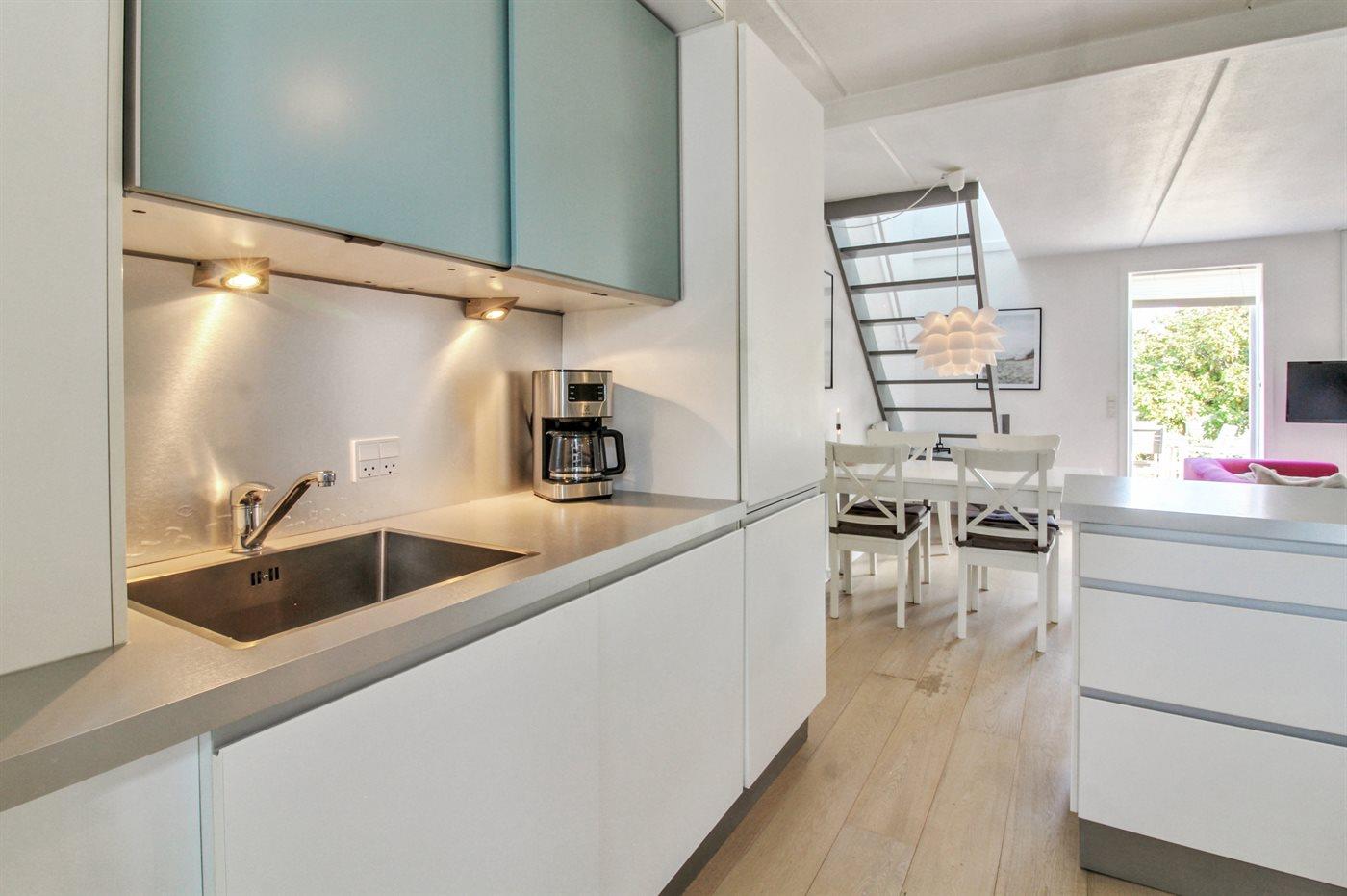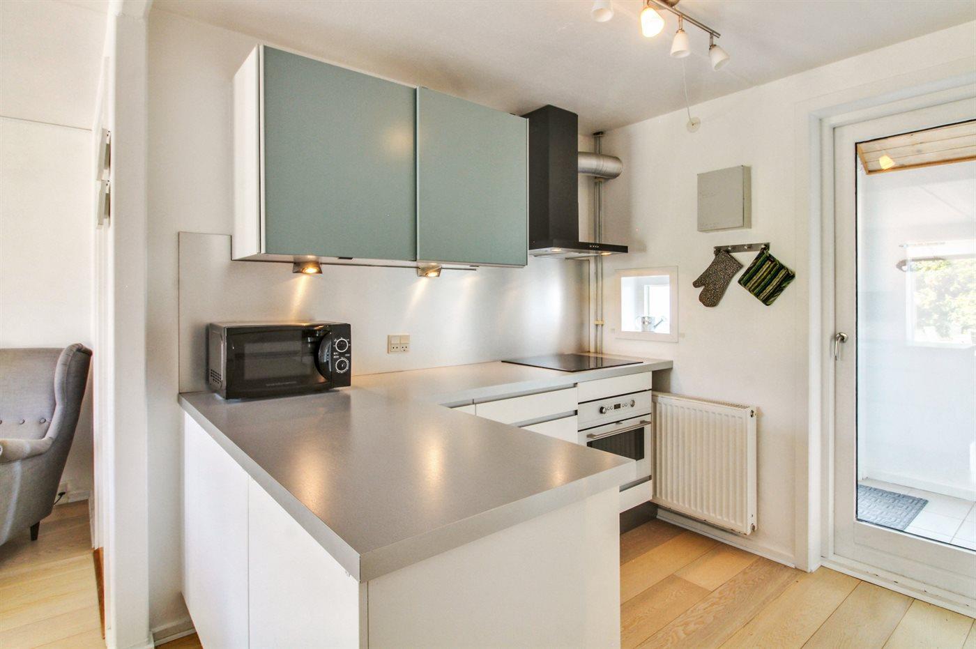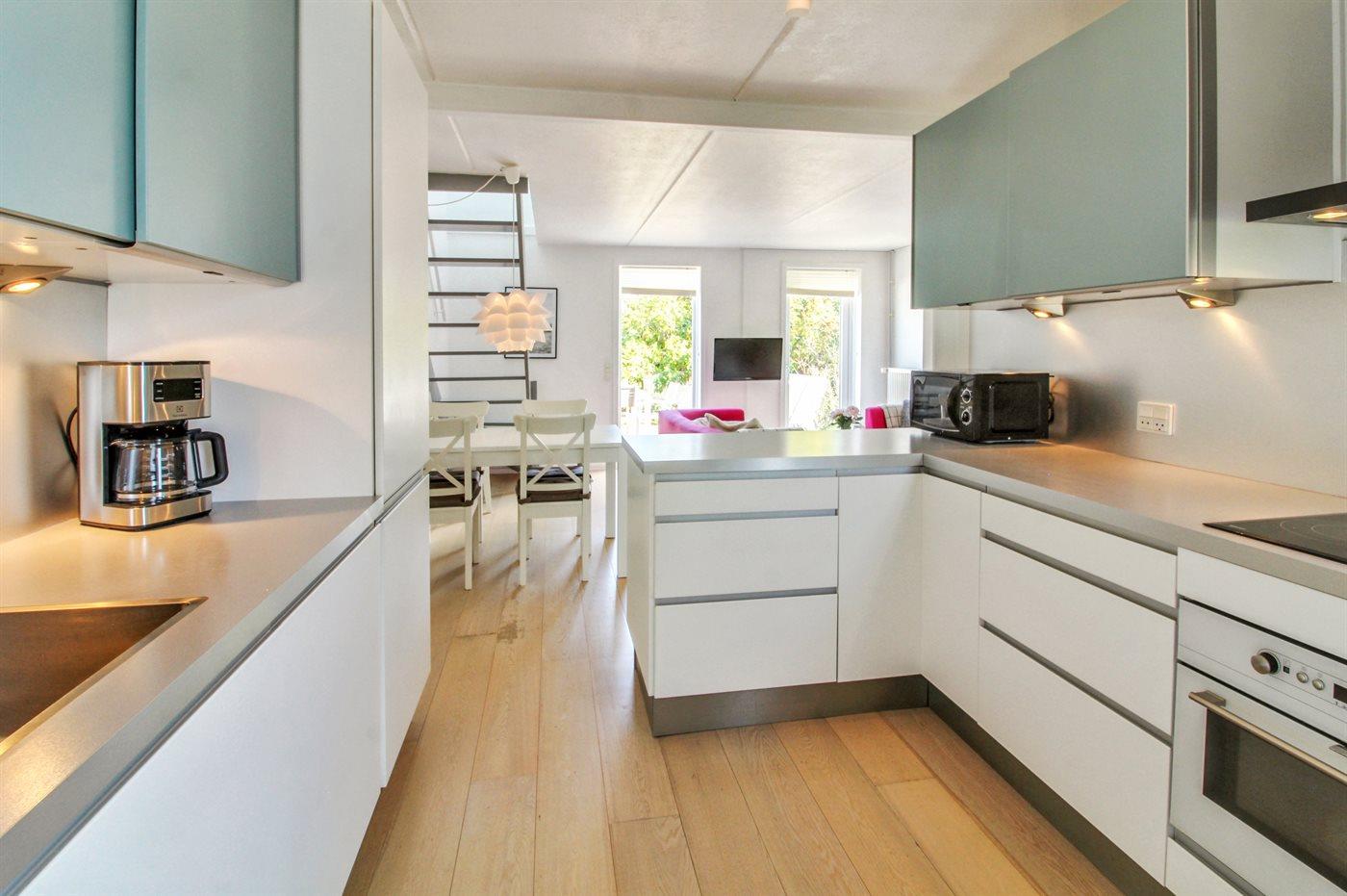 Køkkenet er udstyret med 1 køleskab. Der er 4 induktionskogeplader, varmluftovn, mikrobølgeovn samt opvaskemaskine.