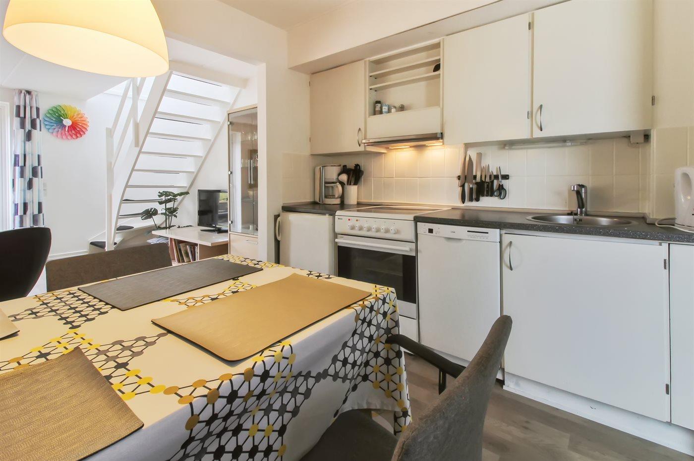Køkkenet er udstyret med 1 køleskab. Der er 4 elkogeplader, bageovn samt opvaskemaskine.