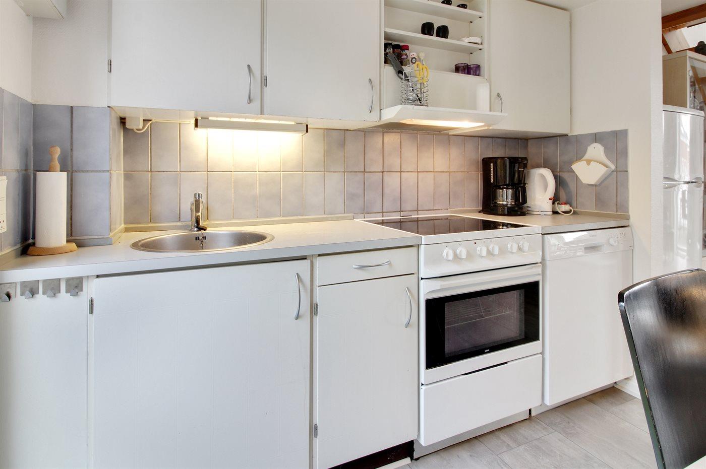 Køkkenet er udstyret med 1 køleskab. Der er 4 elkogeplader, varmluftovn, mikrobølgeovn samt opvaskemaskine.