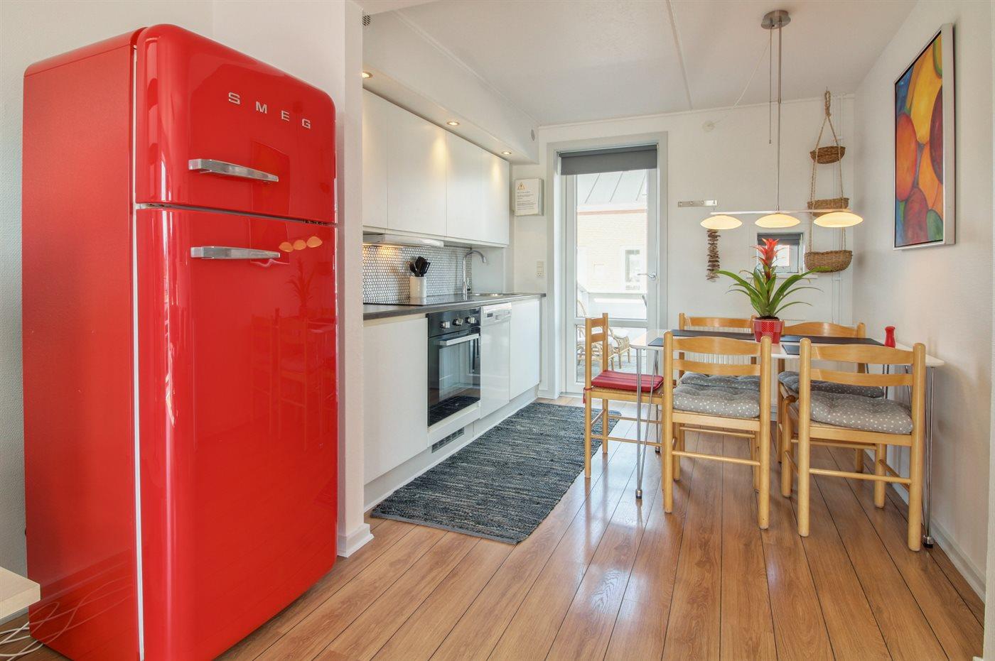 Køkkenet er udstyret med 1 køleskab. Der er 4 elkogeplader, bageovn, mikrobølgeovn samt opvaskemaskine.