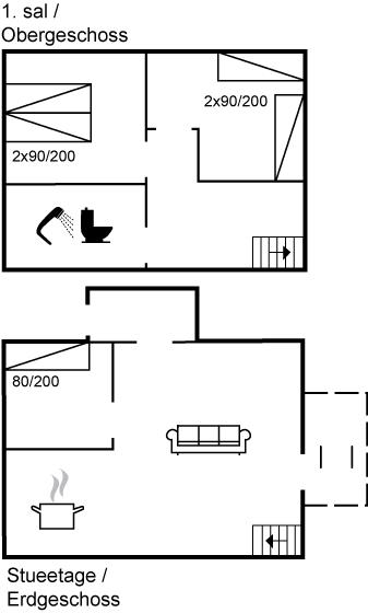 Der er i alt 3 soveværelser. Sovepladserne fordeler sig på: 2 sovepladser i dobbeltseng. 3 sovepladser i enkeltsenge. Derudover er der 1 stk. barneseng.