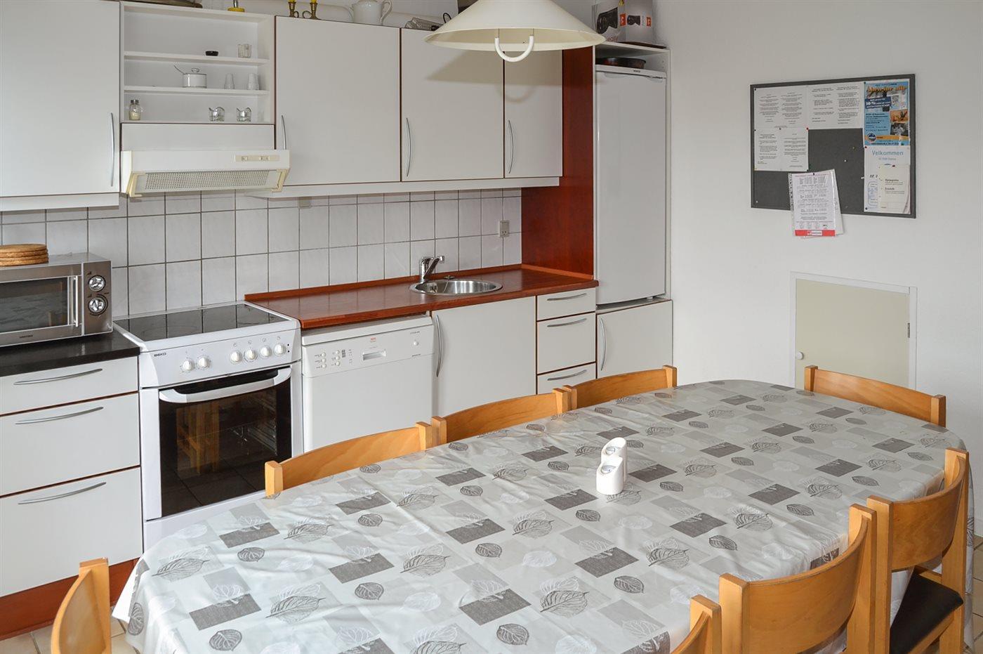 Køkkenet er udstyret med 1 køleskab. Der er 4 keramiske kogeplader, mikrobølgeovn samt opvaskemaskine.