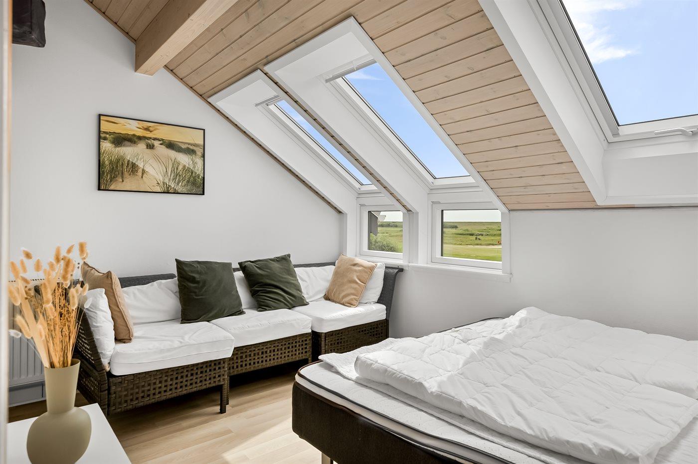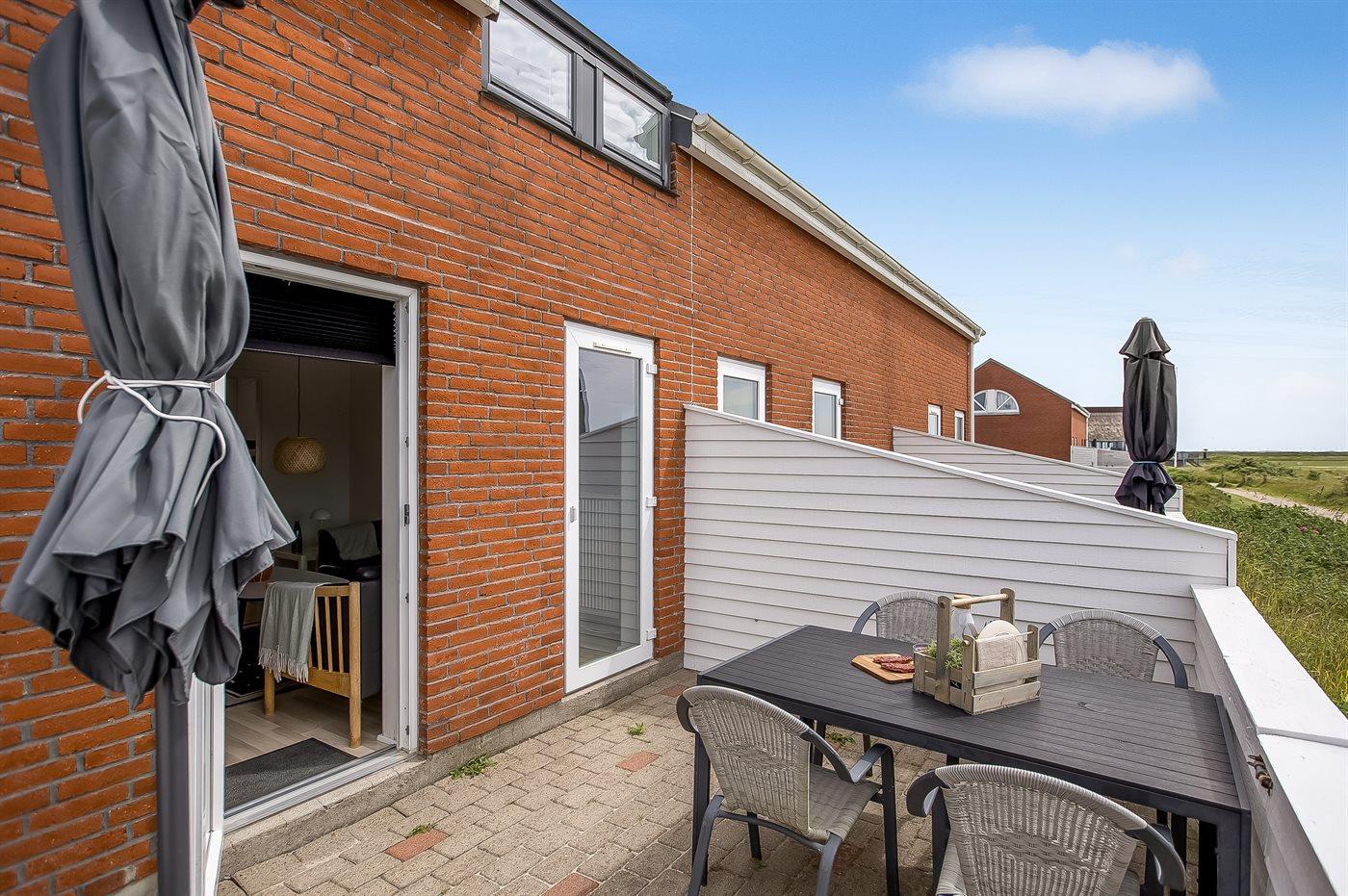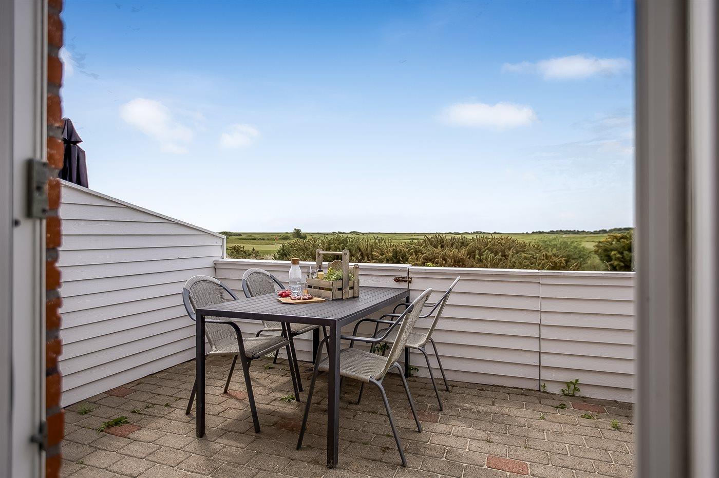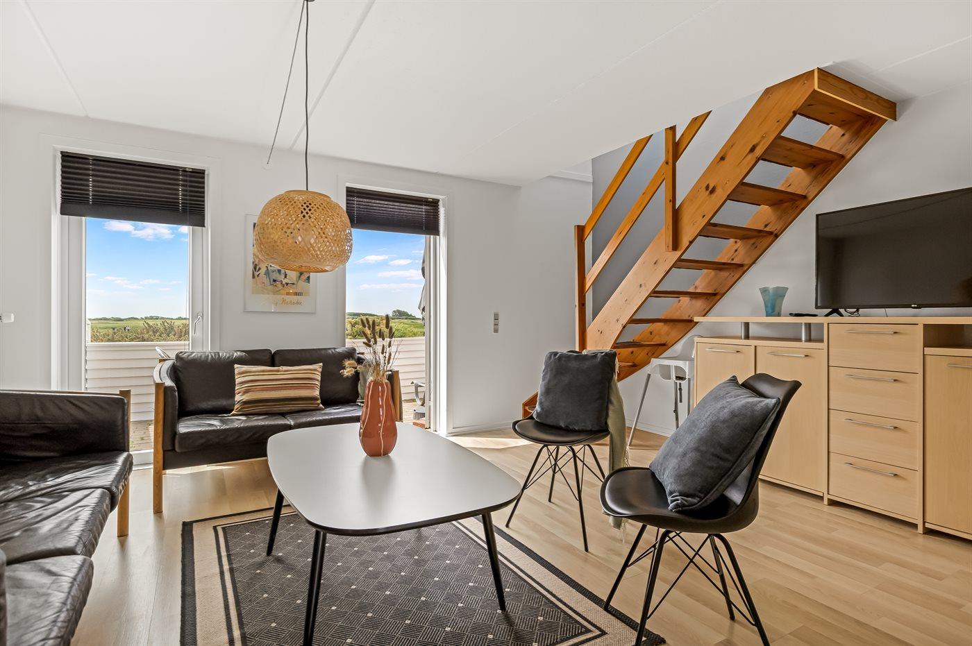 Moderne 2-etages feriebolig i første række ud mod ny golfbane. Til ferielejligheden, som er totalrenoveret i 2015, hører en dejlig sydvendt terrasse med ugenert udsigt til golfbanen. Fra 1. sal er der en pragtfuld udsigt over Vadehavet til øen Sild. Lejligheden er meget lys og udsigts-/ovenlysvinduerne gør, at der også om vinteren bliver dejlig lyst så snart solen er fremme. Om sommeren, når solen rigtig skinner bliver der hurtigt varmt og man kan sidde indenfor med åbne vinduer. Til lejligheden hører en dejlig sydvestvendt terrasse med havemøbler og på den anden side af lejligheden findes flot legeplads med stor hoppepude. 2 svømmehaller til gratis afbenyttelse og tennisbane mod betaling. Ferieboligen, der er på 71 m2 og bygget i 1992, er indrettet med nye møbler og har nyanlagt terrasse. På gulvene er der tæpper, dog vinylgulv i køkkenet. Lofter og vægge er malede. Badeværelse med bruseniche og vaskemaskine. Det åbne køkken er bl.a. udstyret med komfur med keramiske kogeplader og varmluftovn. Hyggelig stue med 32" TV med parabolantenne og stereoanlæg med CD-afspiller. Desuden gratis internetforbindelse til rådighed (computer skal medbringes). 2 store soveværelser på 1. sal; 1 med dobbeltseng og 1 med 2 enkeltsenge. Desuden er der 1 værelse med køjeseng i stueetagen. Fjernvarme installeret - hvilket giver en billig opvarmning og et behageligt indeklima.