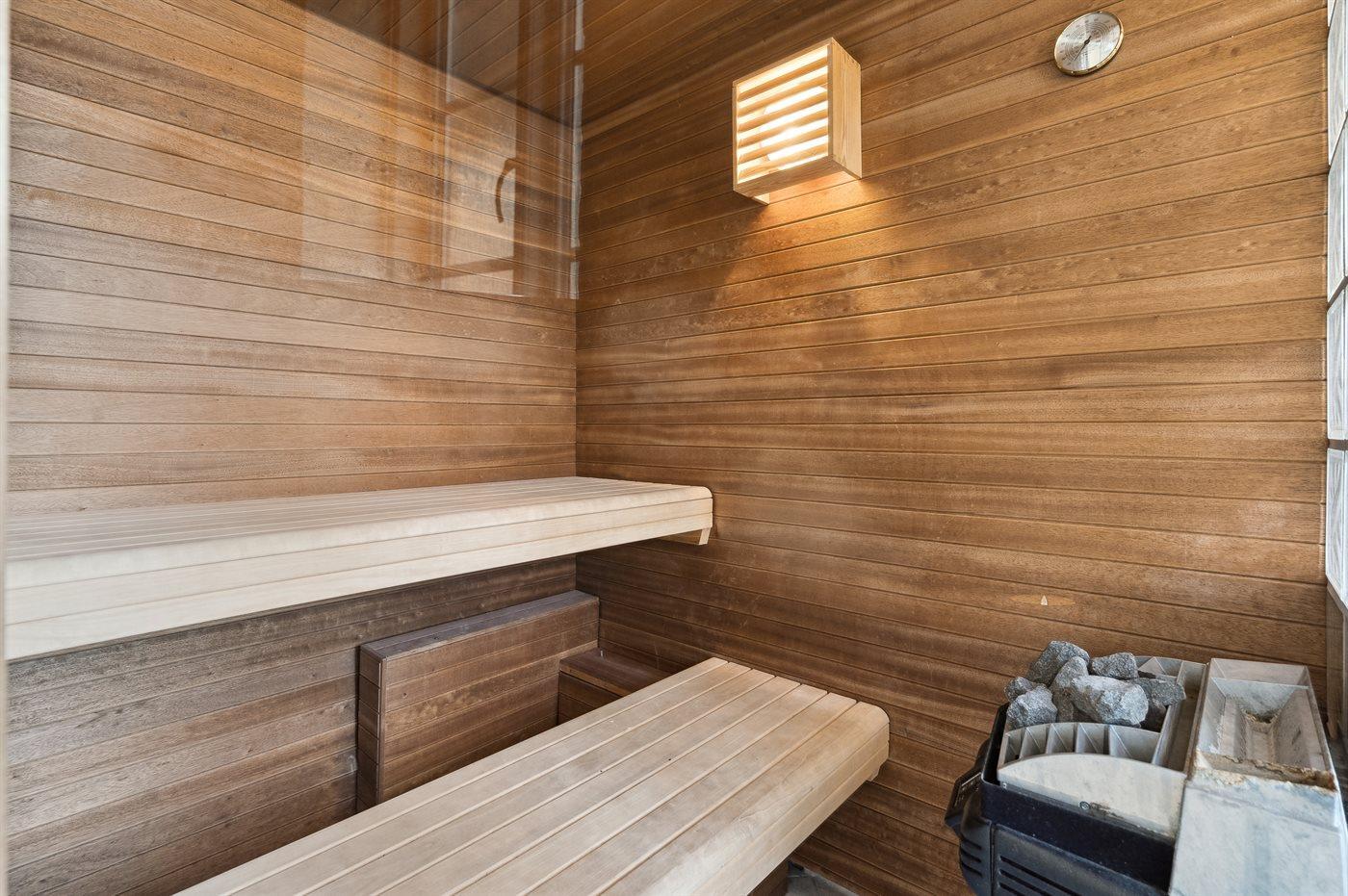 Køkkenet er udstyret med køleskab, fryser, 4 keramiske kogeplader, varmluftovn, mikrobølgeovn samt opvaskemaskine. Der er 2 badeværelser med bruseniche, toiletter og gulvvarme samt en sauna og spa til 2 personer.