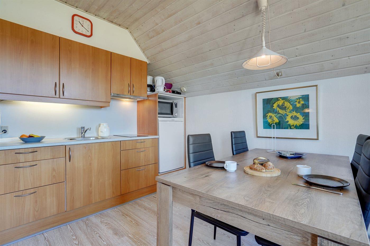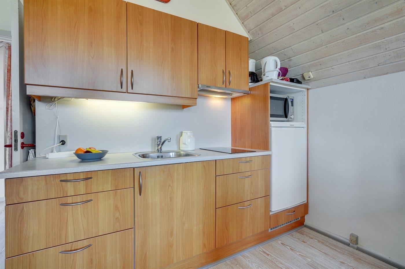 Køkkenet er udstyret med 1 køleskab. Der er 2 keramiske kogeplader, mikrobølgeovn.