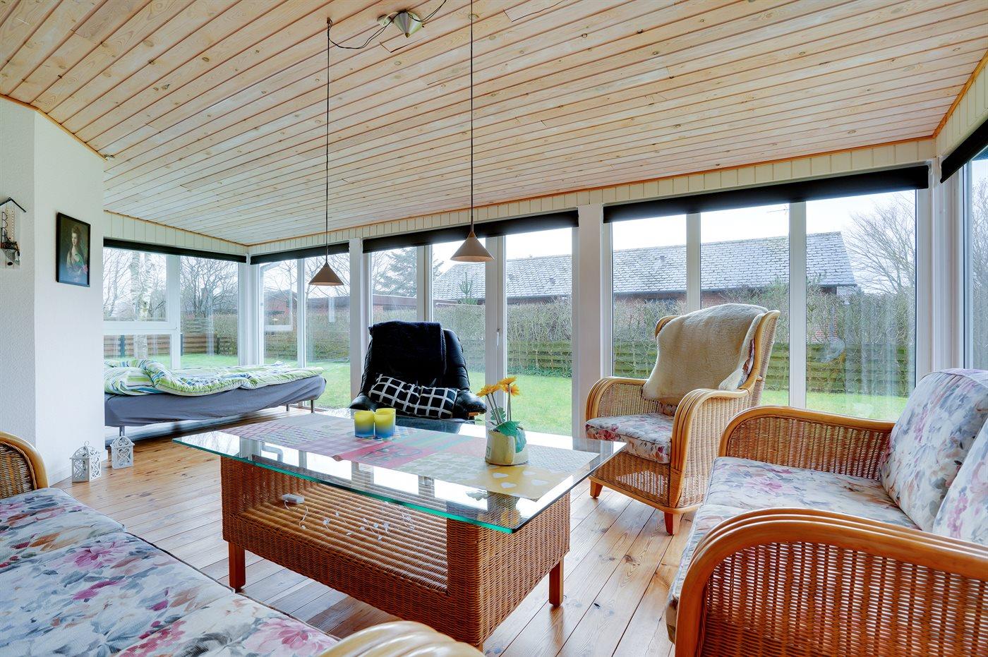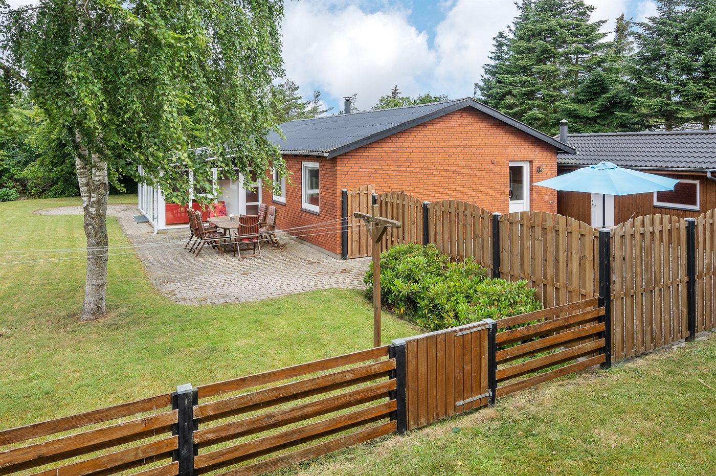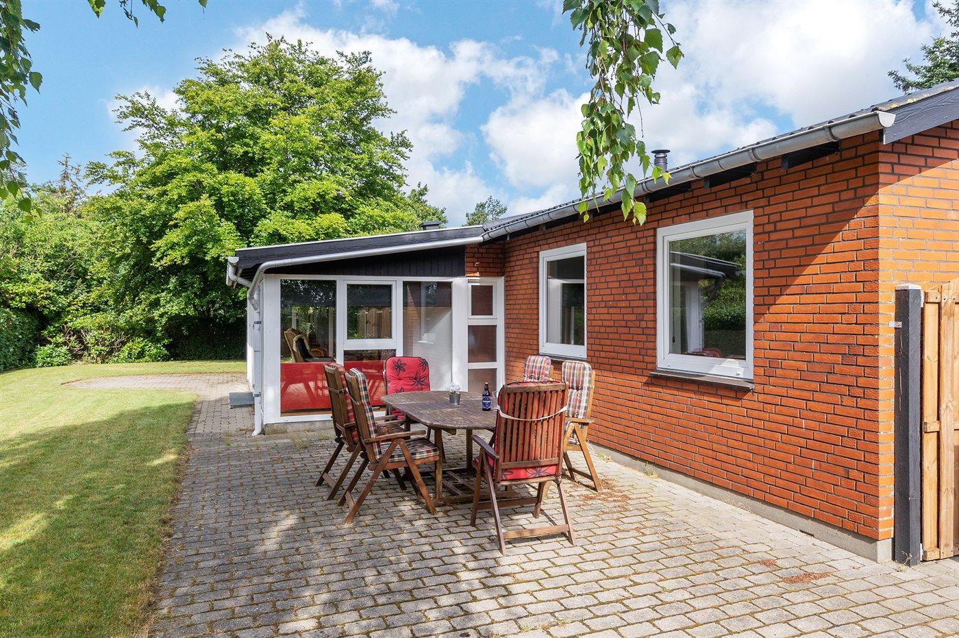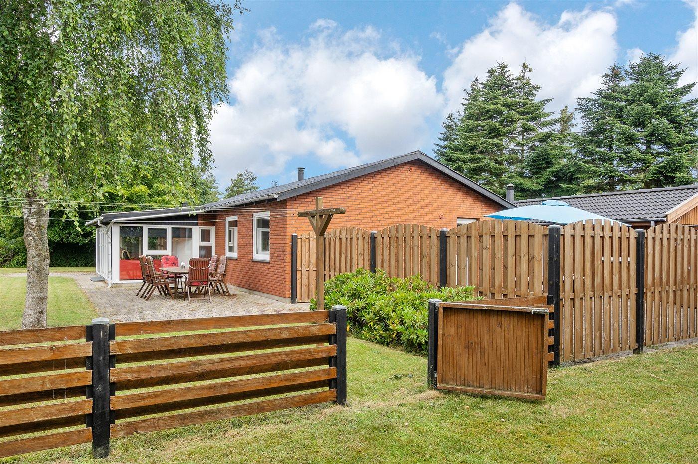 Ikke langt fra stranden og havnen ligger dette dejlige sommerhus. Huset ligger på en flot, lukket grund – perfekt til familier med små børn og husdyr. Bemærk, at de 2 sovepladser på sofaen befinder sig i udestuen.
