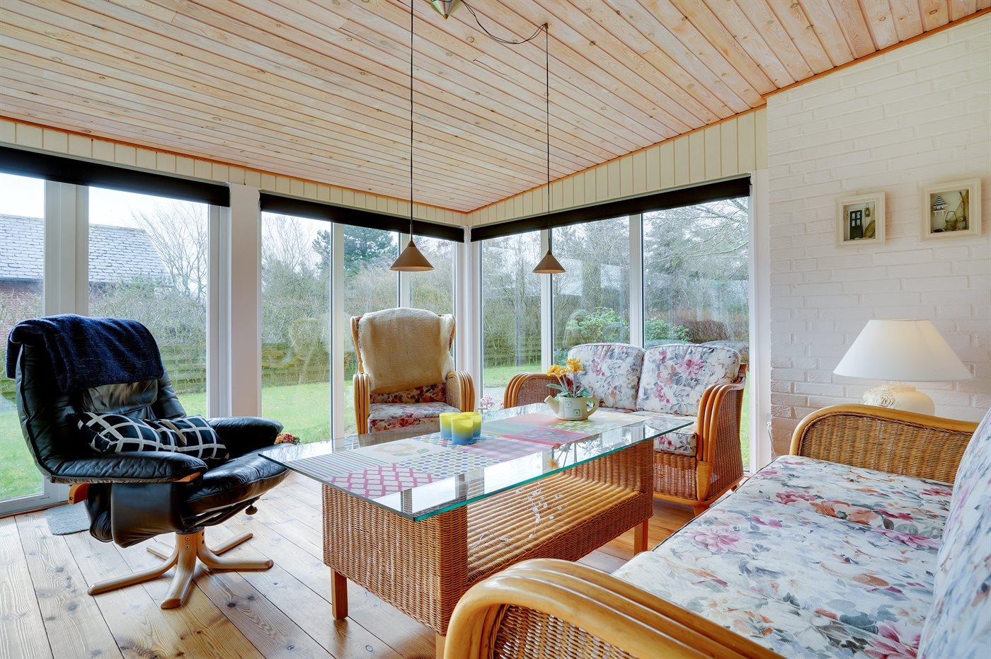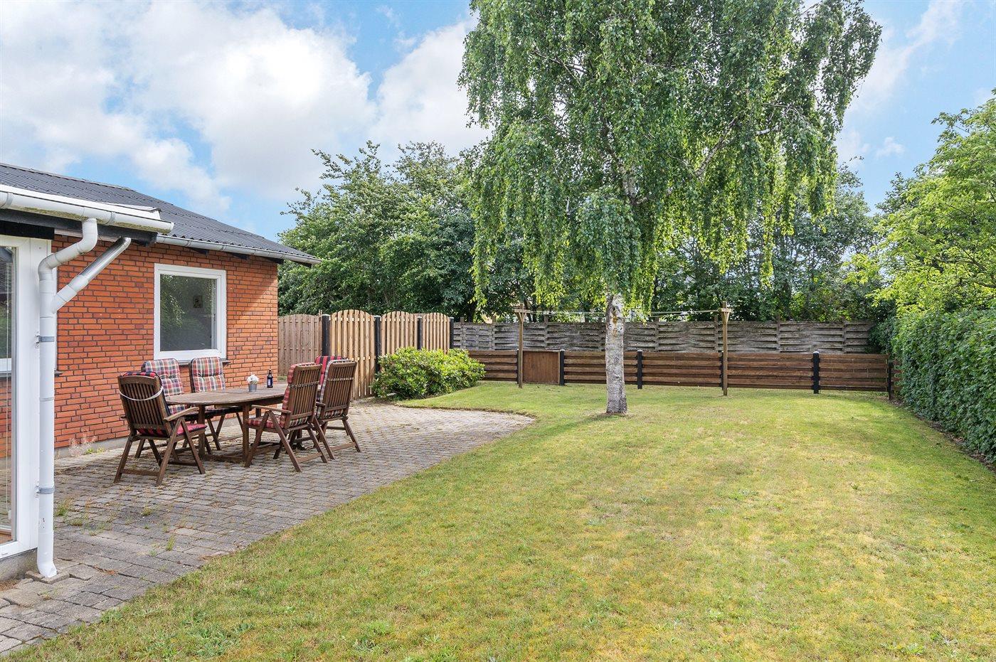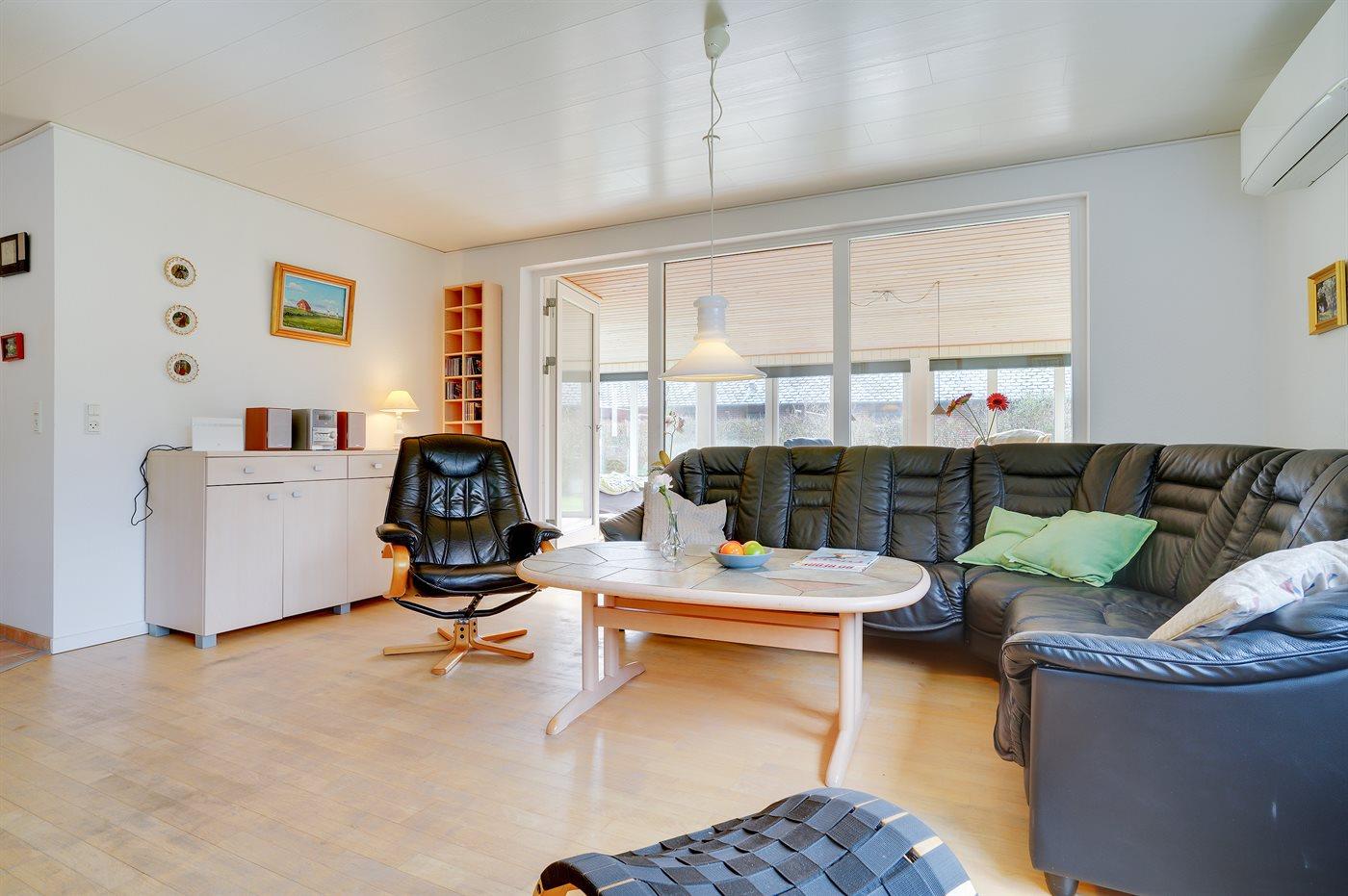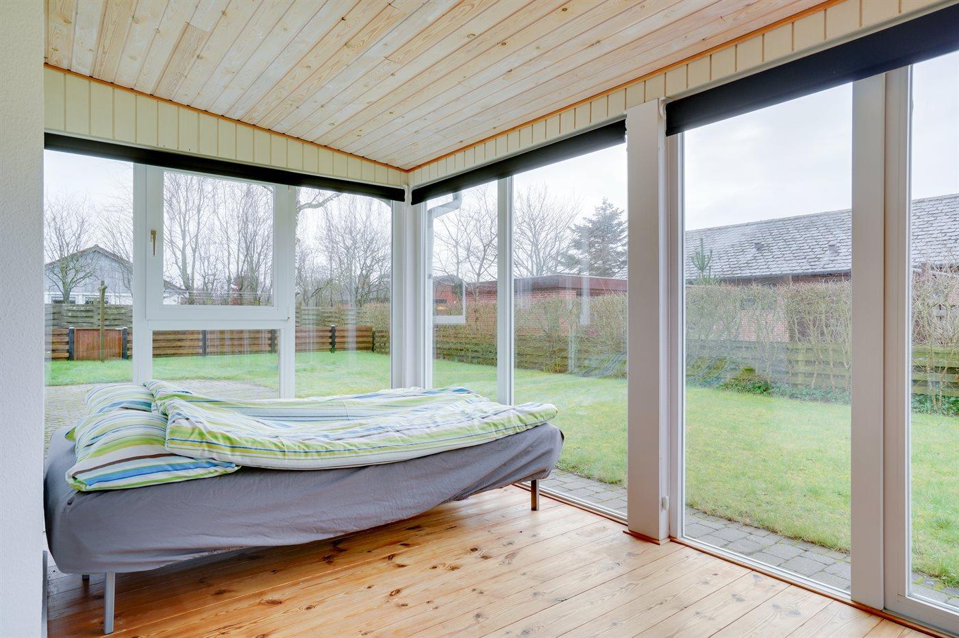 Ikke langt fra stranden og havnen ligger dette dejlige sommerhus. Huset ligger på en flot, lukket grund – perfekt til familier med små børn og husdyr. Bemærk, at de 2 sovepladser på sofaen befinder sig i udestuen.