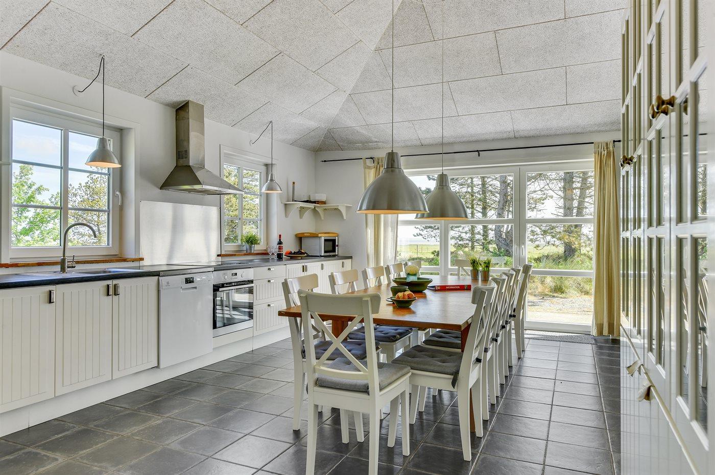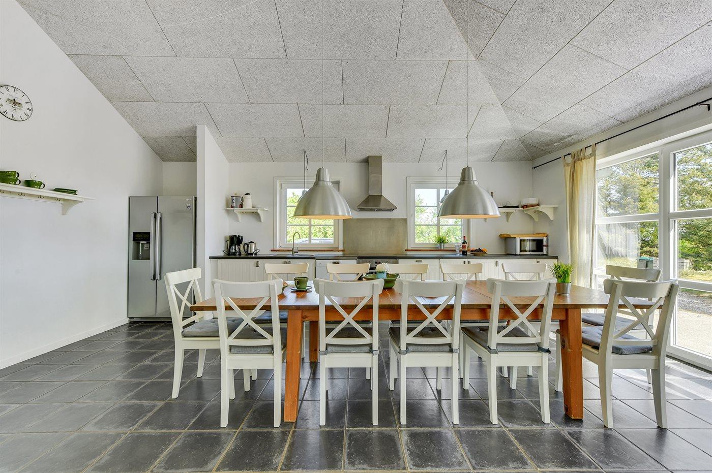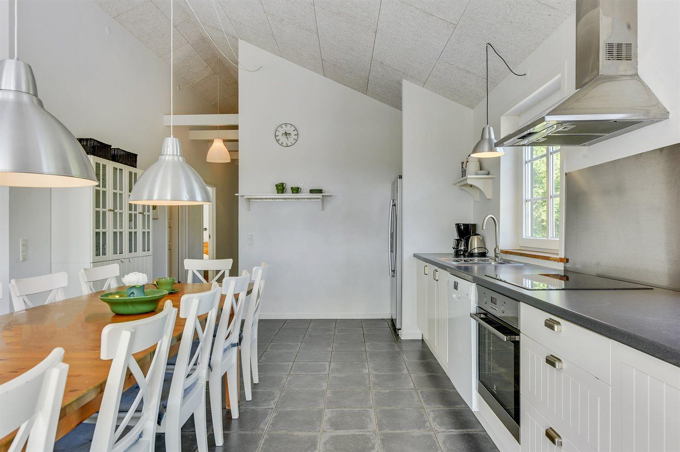 Køkkenet er udstyret med 1 køleskab. Der er 4 keramiske kogeplader, varmluftovn, mikrobølgeovn samt opvaskemaskine.