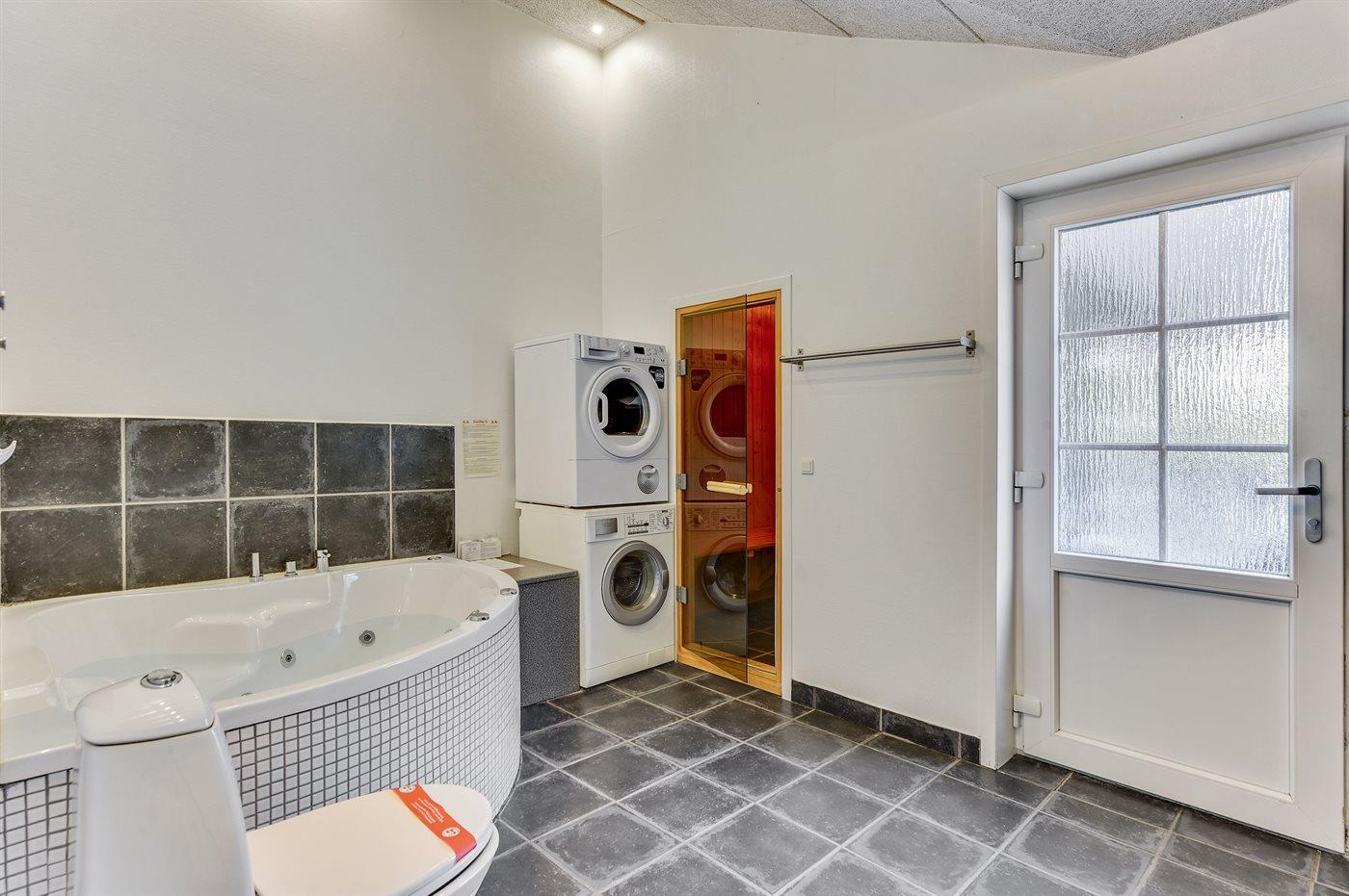 Der er 2 badeværelser med bruseniche og 2 toiletter. Der er gulvvarme på 1 badeværelse. I saunaen er der mulighed for afslapning.