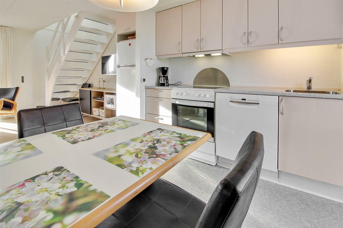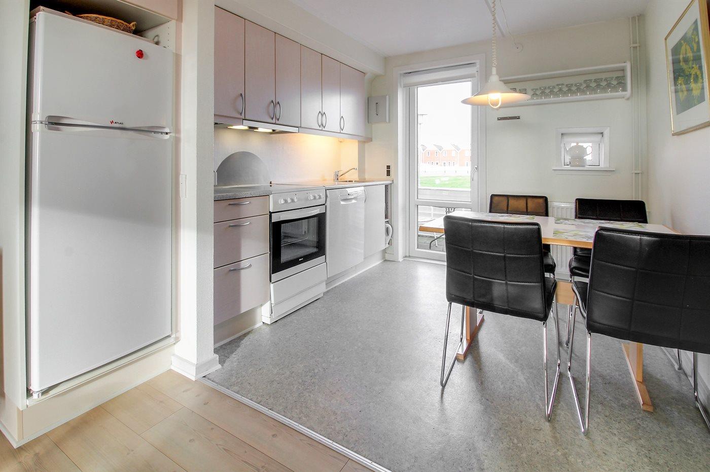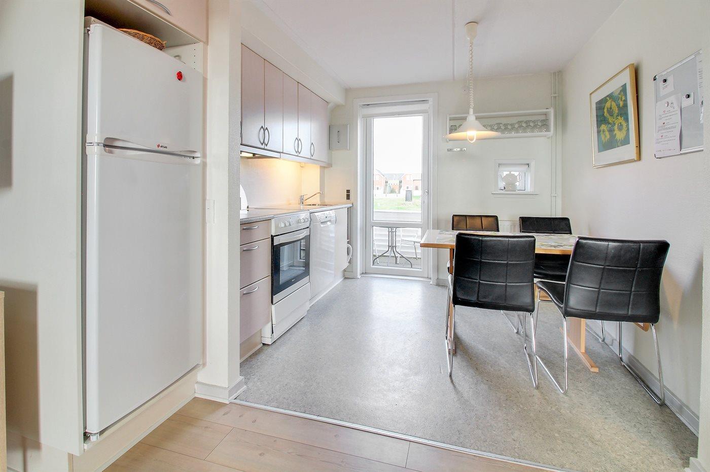 Køkkenet er udstyret med 1 køleskab. Der er 4 elkogeplader, bageovn, mikrobølgeovn samt opvaskemaskine.