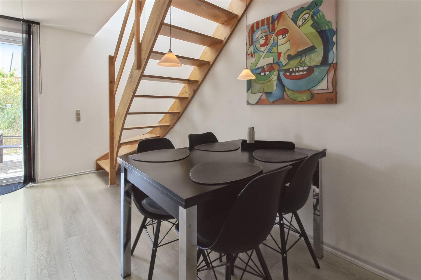 I stueplan er køkken, stue og børneværelse med køjeseng til 2 personer. Det smagfuldt indrettede køkken ligger åbent med opholdsstuen og er bl.a. udstyret med køleskab med frostboks, opvaskemaskine og mikrobølgeovn. Opholdsstuen indeholder ny sofagruppe og spisearrangement. I stuen er installeret fladskærms TV med 26 kanaler samt radio. Fra opholdsstuen er der udgang til terrassen. Gratis, trådløs Internetforbindelse til rådighed (computer skal medbringes). På 1. sal er badeværelse med brusekabine og vaskemaskine. Der er 2 værelser, hvor 1 er med dobbeltseng og 1 med 2 enkeltsenge. Desuden er der barneseng og høj barnestol til rådighed.
