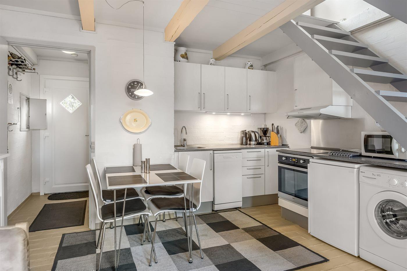 Køkkenet er udstyret med 1 køleskab. Der er 4 keramiske kogeplader, varmluftovn, mikrobølgeovn samt opvaskemaskine.