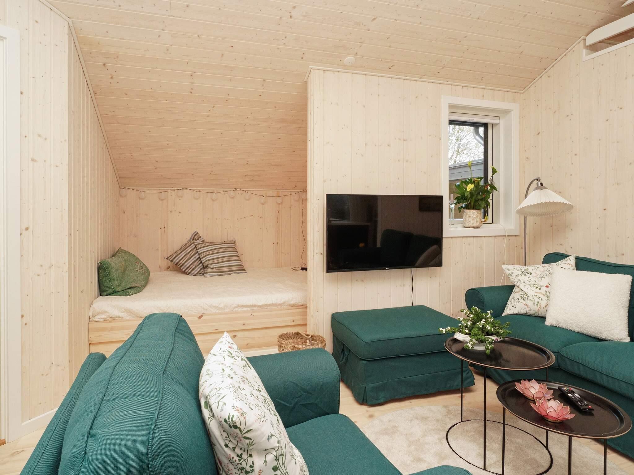 Åbent og veludstyret køkken i forbindelse med spisepladsen. Stue med alkove og adgang til soveværelse med dobbeltseng. I stuen er der et tv, der kan bruges til at streame dine egne tv-udbydere via husets internetforbindelse. De store vinduespartier og skydedøre giver masser af lys ind i stuen. Foran er der en 13 m² overdækket terrasse med liggestole. Fra køkkenet er der desuden udgang til den åbne terrasse med havemøbler, liggestole og gasgrill. Ugeneret af naboerne kan du nyde det udendørs saunaområde i ro og mag, mens børnene hygger sig på havetrampolinen (brug på eget ansvar).