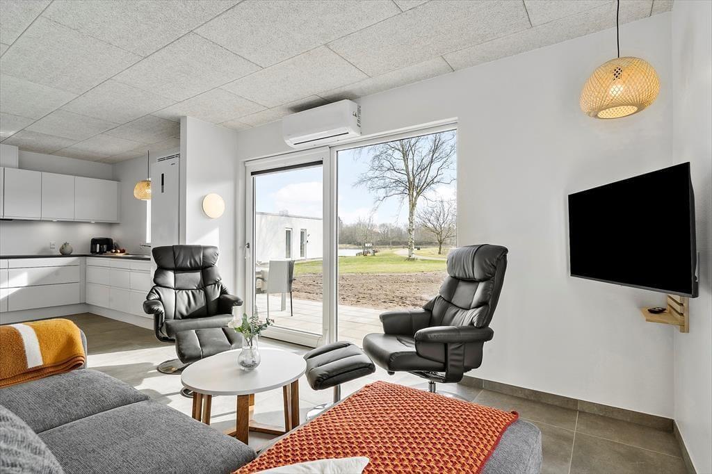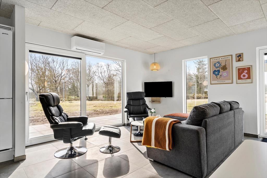 Inden døre byder sommerhuset på en lys og indbydende atmosfære med moderne indretning og gennemtænkte detaljer. Her kan I samles i den hyggelige stue, hvor komfortable møbler og store vinduespartier giver en smuk udsigt til søen. Køkkenet er åbent og funktionelt, så I kan lave mad sammen, mens samtalen flyder frit. Efter en dag fyldt med oplevelser kan I slappe af med en god bog, nyde en kop kaffe eller spille brætspil i det hyggelige opholdsrum.